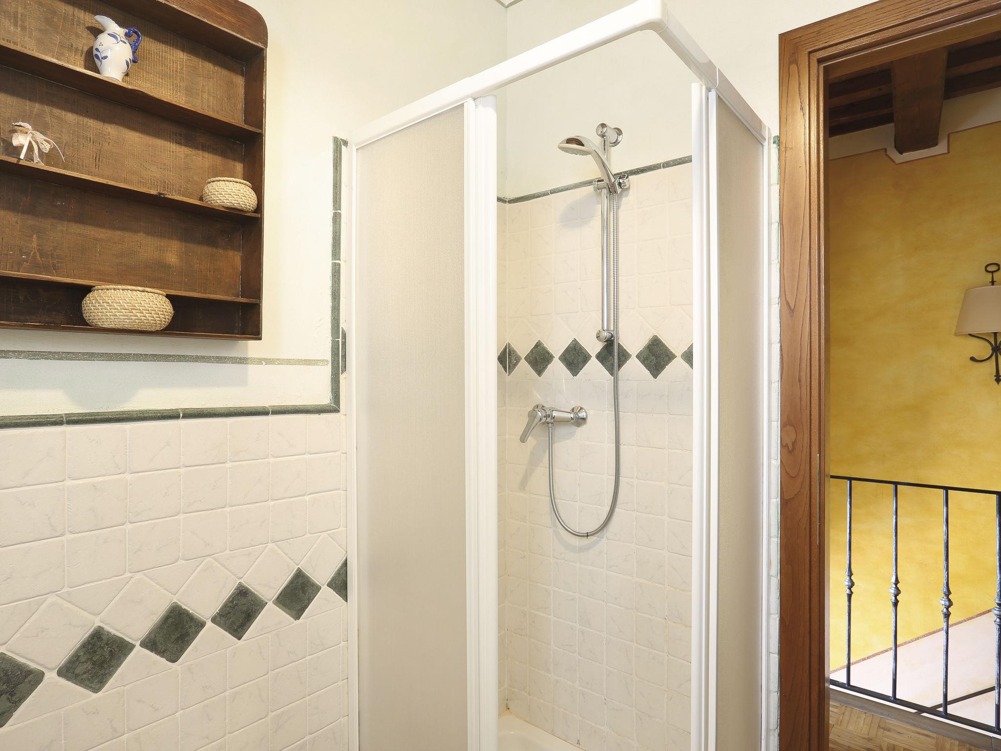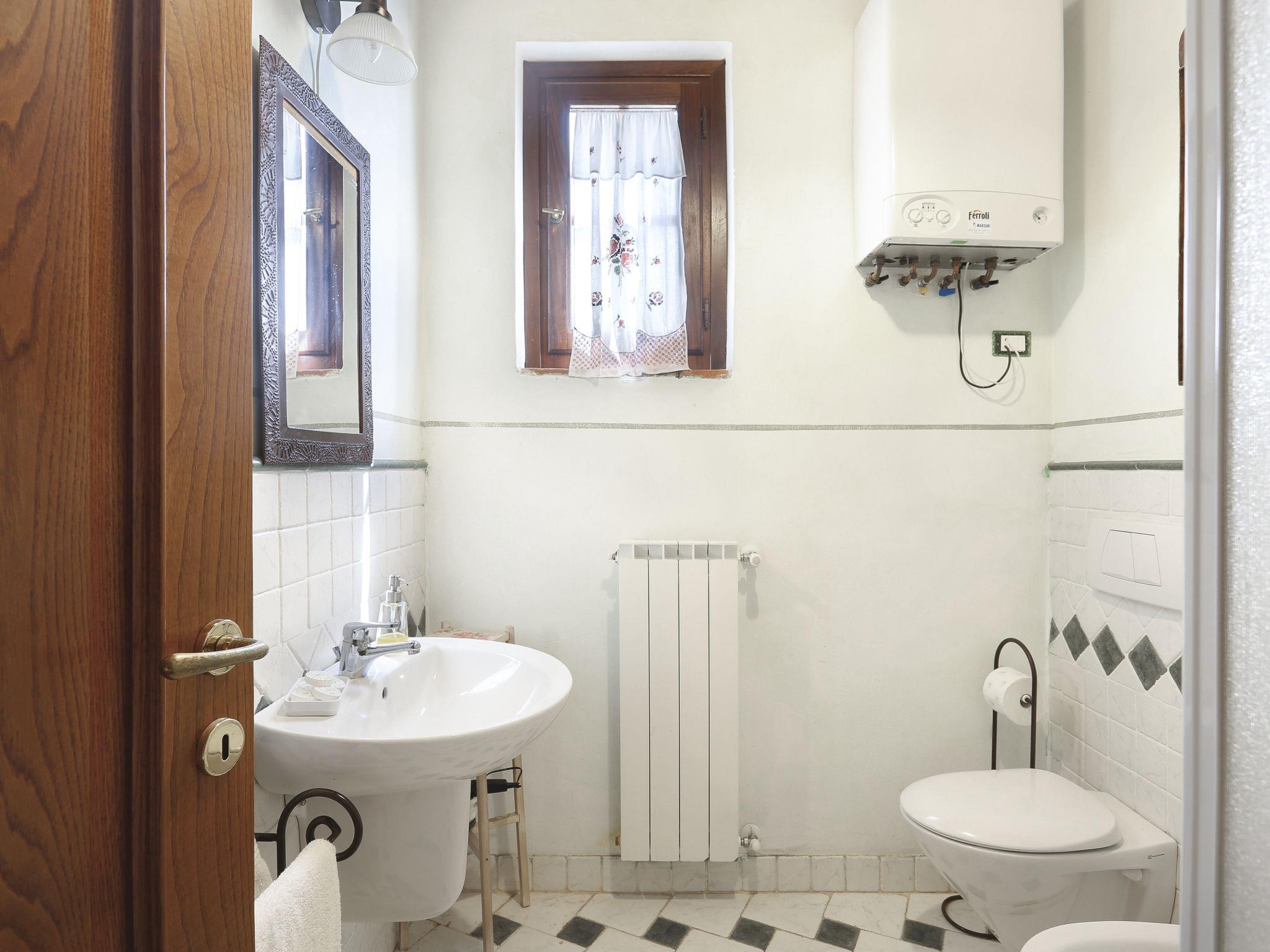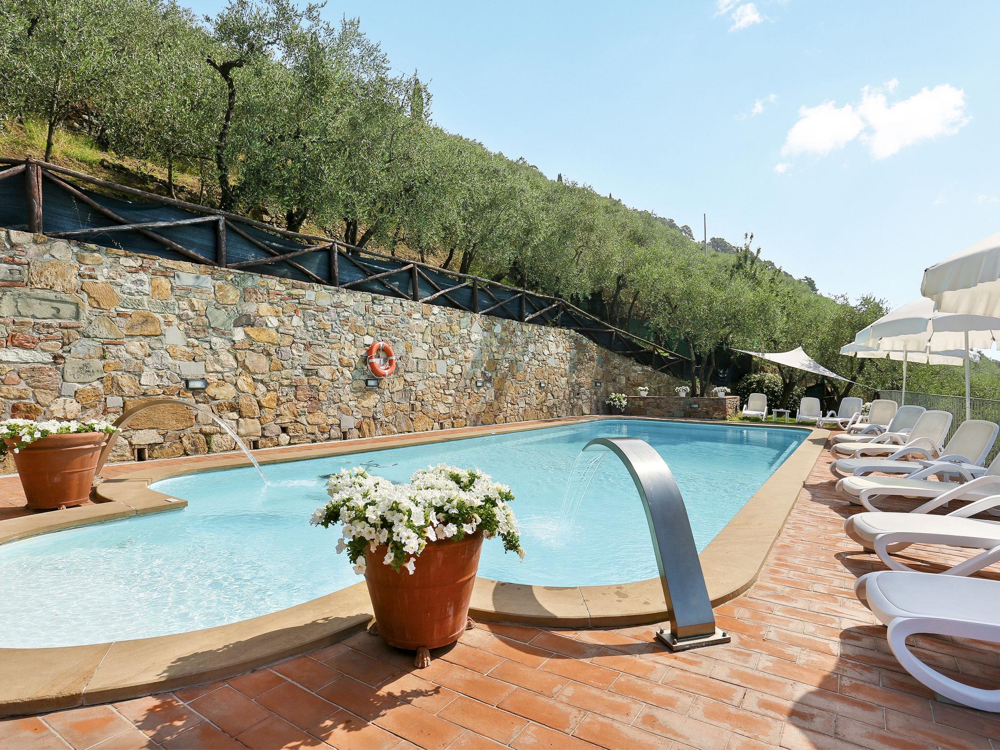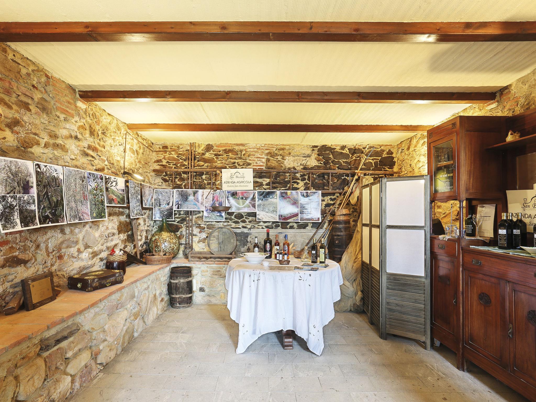Farmhouse "San Bastiano", 160 m a.s.l., detached, renovated. 2 apartments in the property. 1 km from the centre of Buti, 24 km from the centre of Lucca, 25 km from the centre of Pisa, in a secluded position on a slope, 40 km from the sea. For shared use: property 10'000 m2 (fenced), terraced garden with trees, meadow, swimming pool (13 x 5 m, depth 116 - 240 cm, seasonal availability: 02.May. - 03.Oct.). Outdoor shower, children's playground. In the house: washing machine (for shared use). 2 km long narrow motor access (mountain road). Parking on the premises. Shop 1 km, supermarket 3.6 km, bus stop 900 m, park "Marina di Pisa" 40 km. Please note: the owner lives on the same property. Possibility of direct sale of oil on the spot.