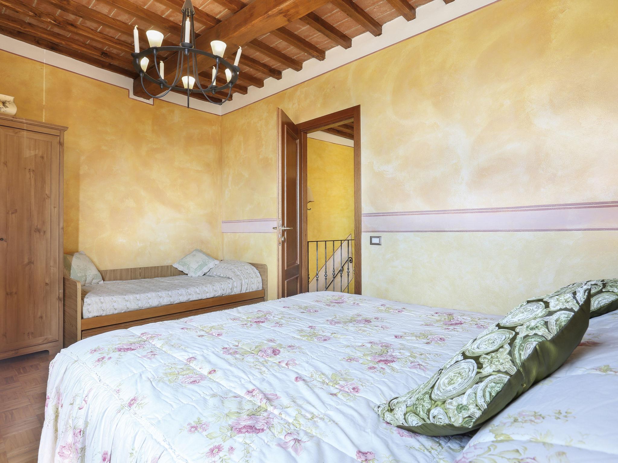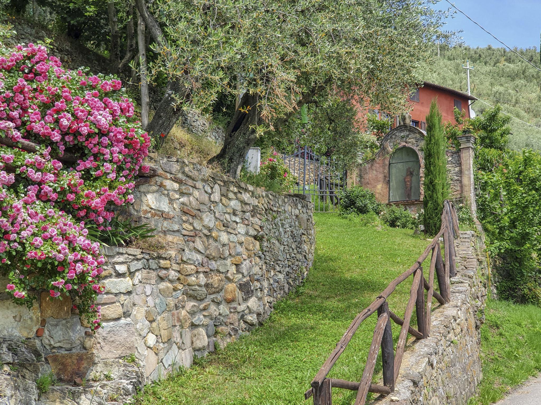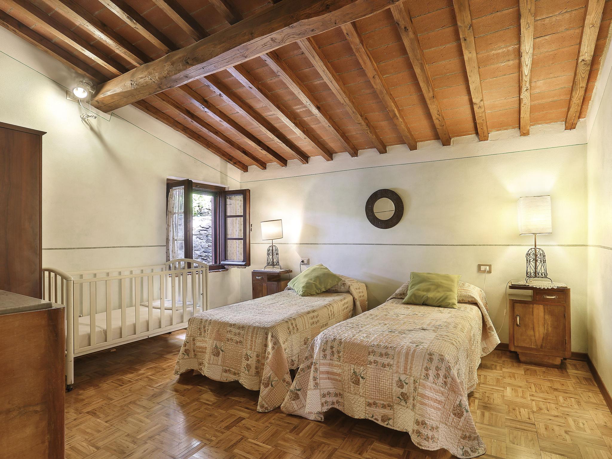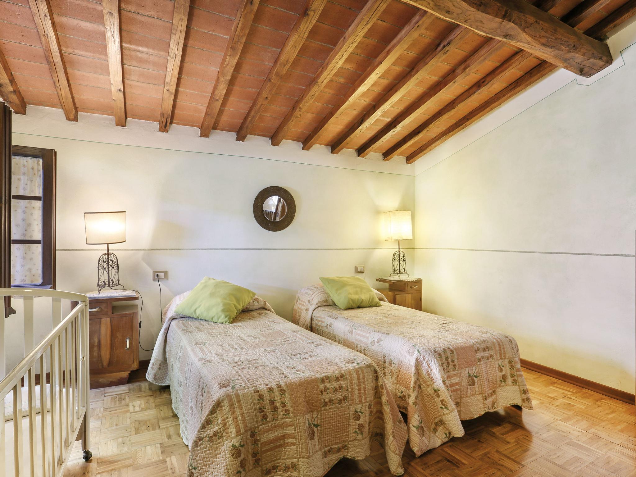 Farmhouse "San Bastiano", 160 m a.s.l., detached, renovated. 2 apartments in the property. 1 km from the centre of Buti, 24 km from the centre of Lucca, 25 km from the centre of Pisa, in a secluded position on a slope, 40 km from the sea. For shared use: property 10'000 m2 (fenced), terraced garden with trees, meadow, swimming pool (13 x 5 m, depth 116 - 240 cm, seasonal availability: 02.May. - 03.Oct.). Outdoor shower, children's playground. In the house: washing machine (for shared use). 2 km long narrow motor access (mountain road). Parking on the premises. Shop 1 km, supermarket 3.6 km, bus stop 900 m, park "Marina di Pisa" 40 km. Please note: the owner lives on the same property. Possibility of direct sale of oil on the spot.