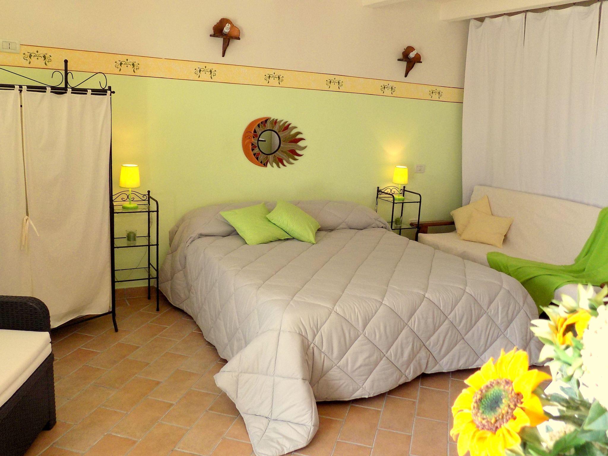 The interior of the flat is carefully designed to ensure a pleasant and relaxing stay. The sleeping area is cosy and includes a comfortable double bed as well as a single bed, ideal for resting after a day exploring the local beauty spots. The separation between the bedroom and the kitchen, created with elegant linen curtains, adds a charming touch to the ambience. In the kitchen, fully equipped with a gas cooker and electric coffee machine, you will have the freedom to prepare delicious meals as if you were at home.