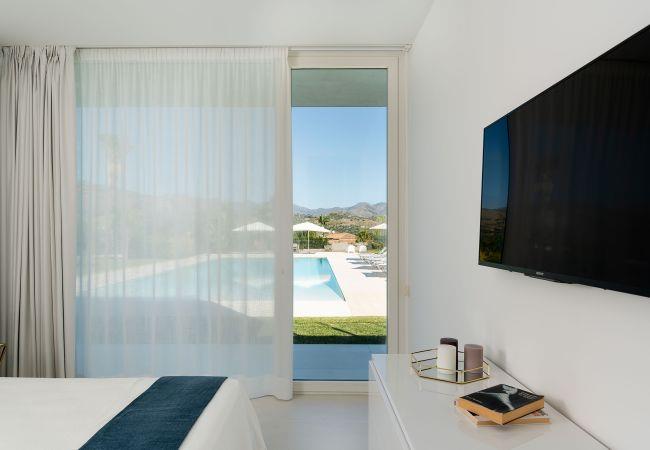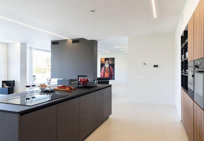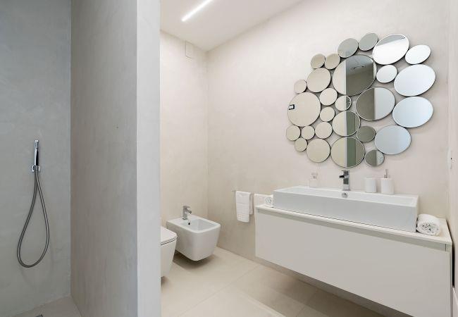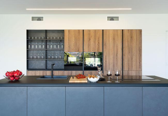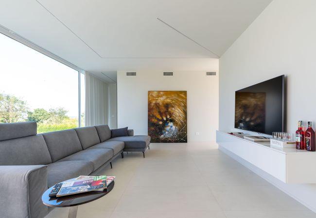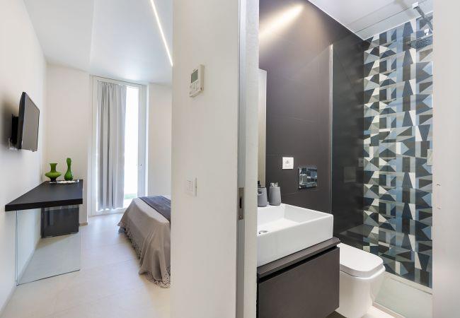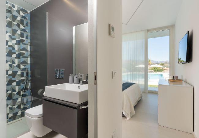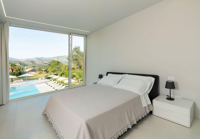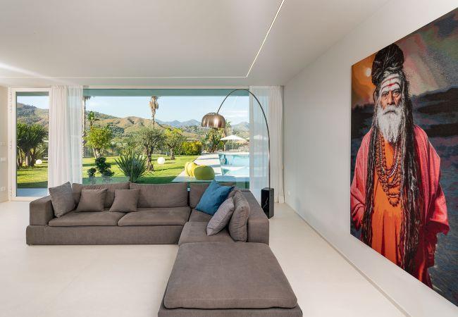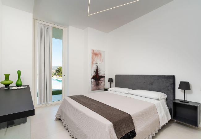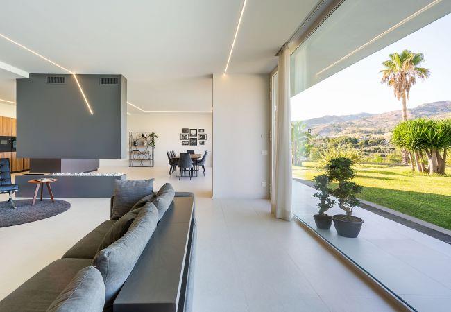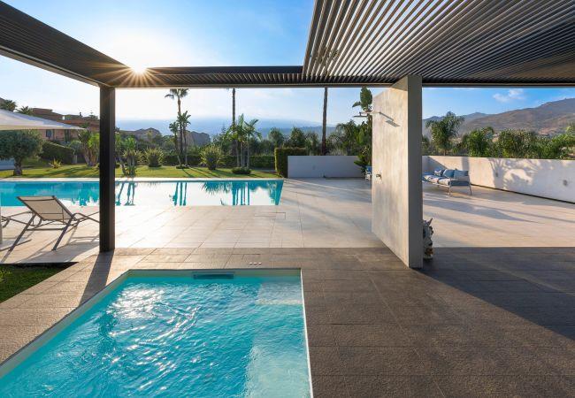 Villa Greta is a luxury villa with private pool situated near Taormina. Ideal retreat for those looking for a comfortable, relaxing stay, this property is surrounded by a wonderful garden with lawn and offers spacious terraces, a large swimming pool (m 8 x 21) and a Jacuzzi. This exclusive, newly built contemporary villa consists of a main house and an annex. Set on two levels, the manor house features bright, cosy interiors that with large glass doors open onto the garden and the surrounding landscape. On the ground floor it includes a living area with kitchen, a luxury suite with a double bed, in-room Jacuzzi tub and bathroom, two double bedrooms with en-suite bathroom and a fourth bathroom with shower. The first floor, accessed through an external staircase, includes another living/dining room with kitchen, a double bedroom with en-suite bathroom, a twin bedroom and a guest bathroom. In the annex there are a living room with kitchenette, two bedrooms and two bathrooms. The villa also has a wellness area with sauna and a treadmill and a number of other amenities, such as A/C, internet Wi-Fi, 8 TVs, satellite receiver, dryer, 2 washing machines, 2 dishwashers, safe and bbq. From Villa Greta can be reached in a few minutes’ drive Taormina’s evocative historic centre and the sea. In the vicinity can be reached the beaches of Fondachello and Giardini Naxos, the Etna’s Park, the Alcantara gorges, the fishing villages on the Cyclops Riviera, Catania and Syracuse.