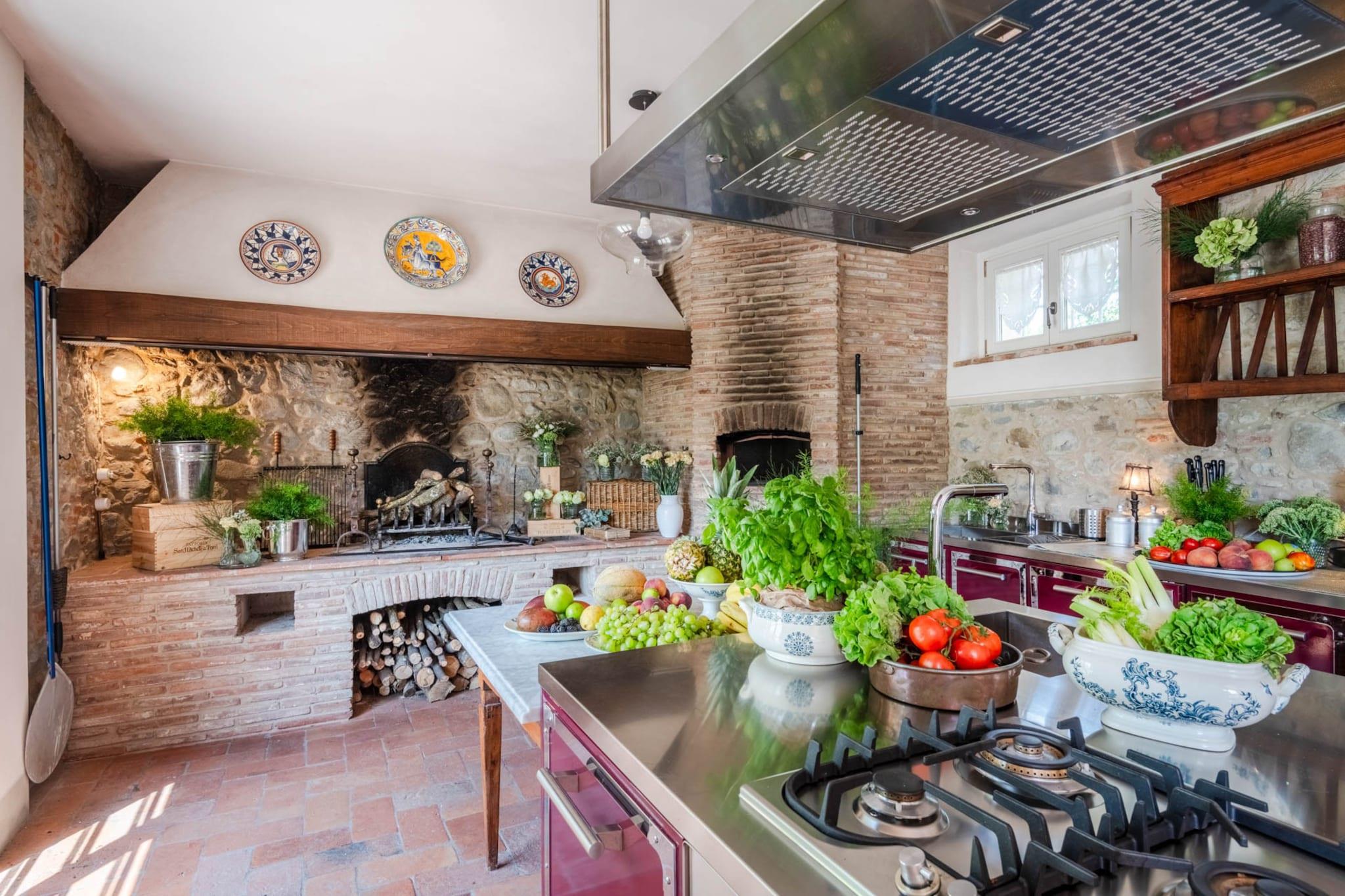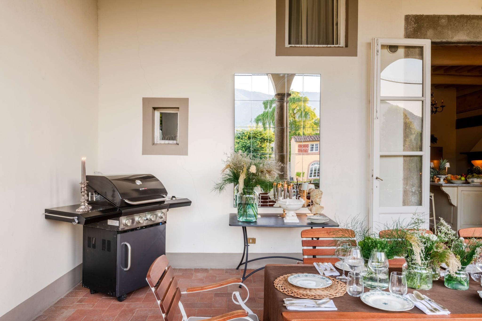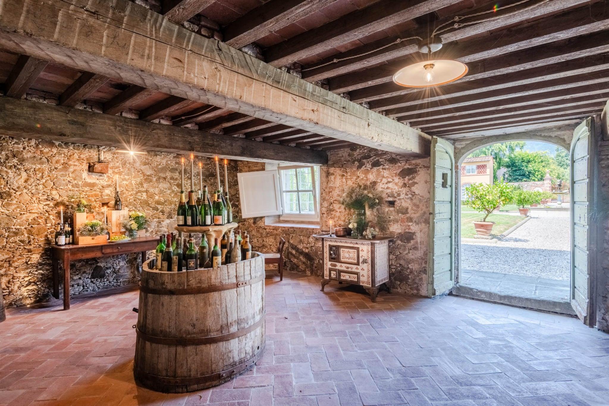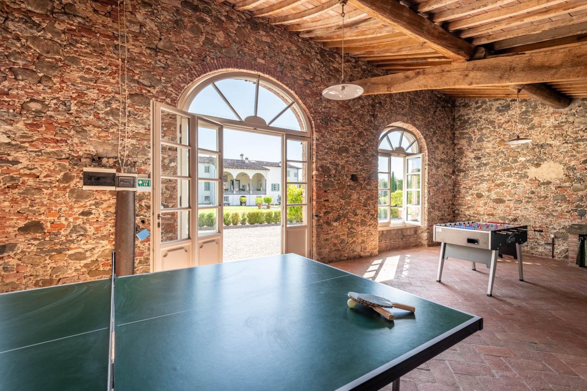Denne ekstraordinære villaen ligger ved foten av de pittoreske Lucca-åsene, og inviterer deg til en virkelig unik flukt. Den er fullt klimaanlegg for moderne komfort, omgitt av frodige vingårder og omhyggelig velstelte hager, noe som skaper et idyllisk tilfluktssted fra omverdenens kjas og mas. Den store terrassen, som dateres tilbake til 1600-tallet, tilbyr fengslende panoramautsikt over bølgende åser, hvor fantastiske solnedganger kaster nyanser av rosa og oransje over de fjerne vinmarkene. Et sant høydepunkt er den store, overbygde terrassen som er tilgjengelig fra kjøkkenet i første etasje, med en stor utendørs spiseplass med plass til 20 personer – ideelt for å arrangere overdådige måltider med familie og venner. Utstyrt med en grill, inviterer den deg til å nyte utendørs servering mens du nyter den fredelige skjønnheten i det toskanske landskapet. Innvendig blander villaen harmonisk historisk eleganse med moderne luksus; hvert rom har originale møbler sammen med splitter nye king-size-senger og toppmoderne klimaanlegg. Opplev sjarmen til en historisk vinkjeller, hvor vinfat danner scenen for private smaksprøver, og nyt koselige kvelder ved peisen i tradisjonelle kjøkken. Ta en tur ut for å slappe av ved det store bassenget (13m x 6m) med et avslappende boblebad, omgitt av fredelige hager. Villaens førsteklasses beliggenhet gir enkel tilgang til Luccas historiske sentrum og pulserende bymurer, samtidig som du har enkel tilgang til ikoniske destinasjoner som Firenze, Pisa, Cinque Terre og de vakre strendene i Versilia. Denne villaen lover en autentisk toskansk opplevelse, og fungerer som det perfekte fristedet for de som søker avslapning uten å forlate Italias rike kultur og fantastiske landskap. Nyt kjøkkenet i drivhuset på forespørsel mot et tillegg i prisen, noe som forsterker den luksuriøse opplevelsen. Merk: Turistskatt betales på eiendommen.