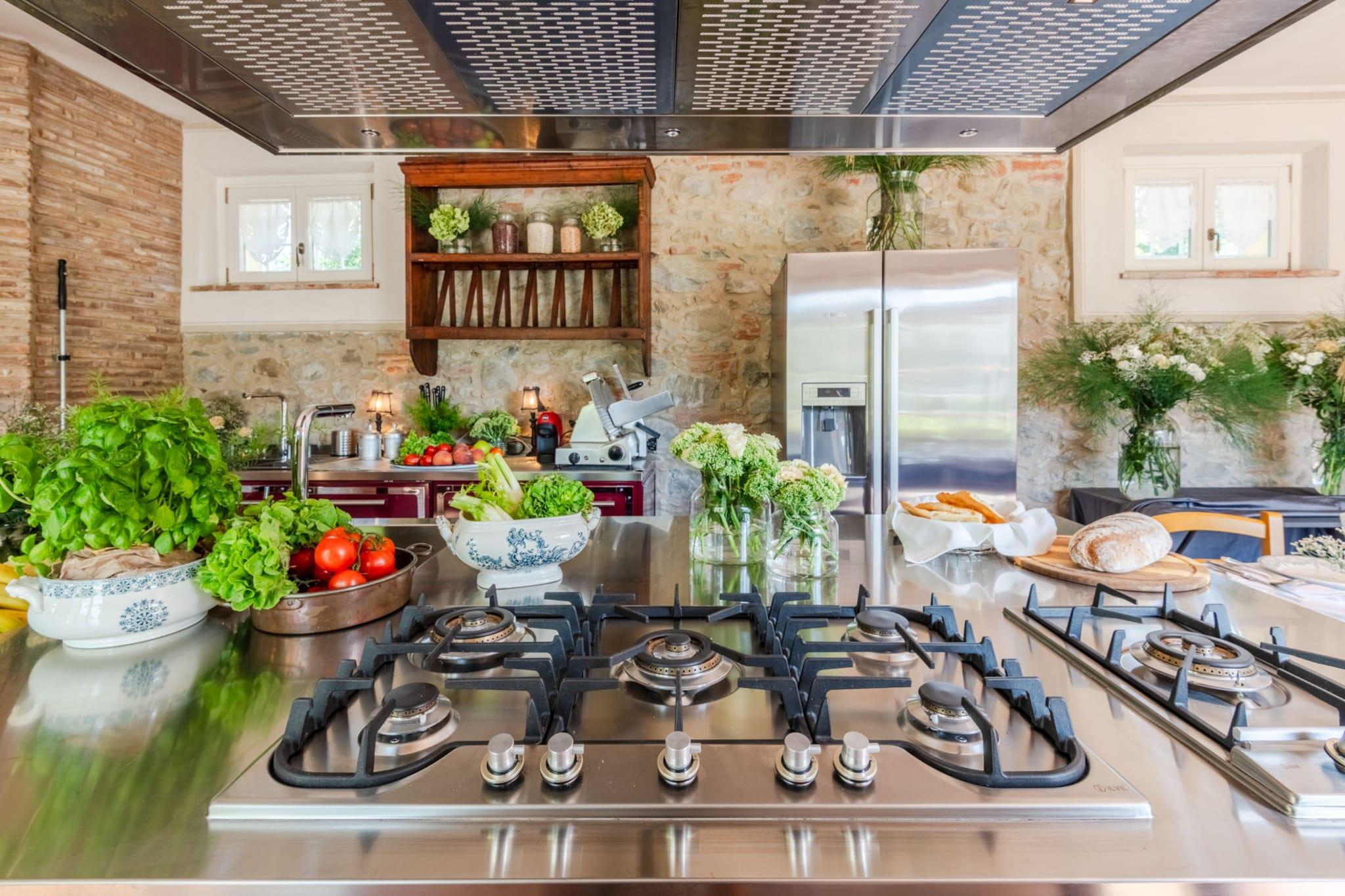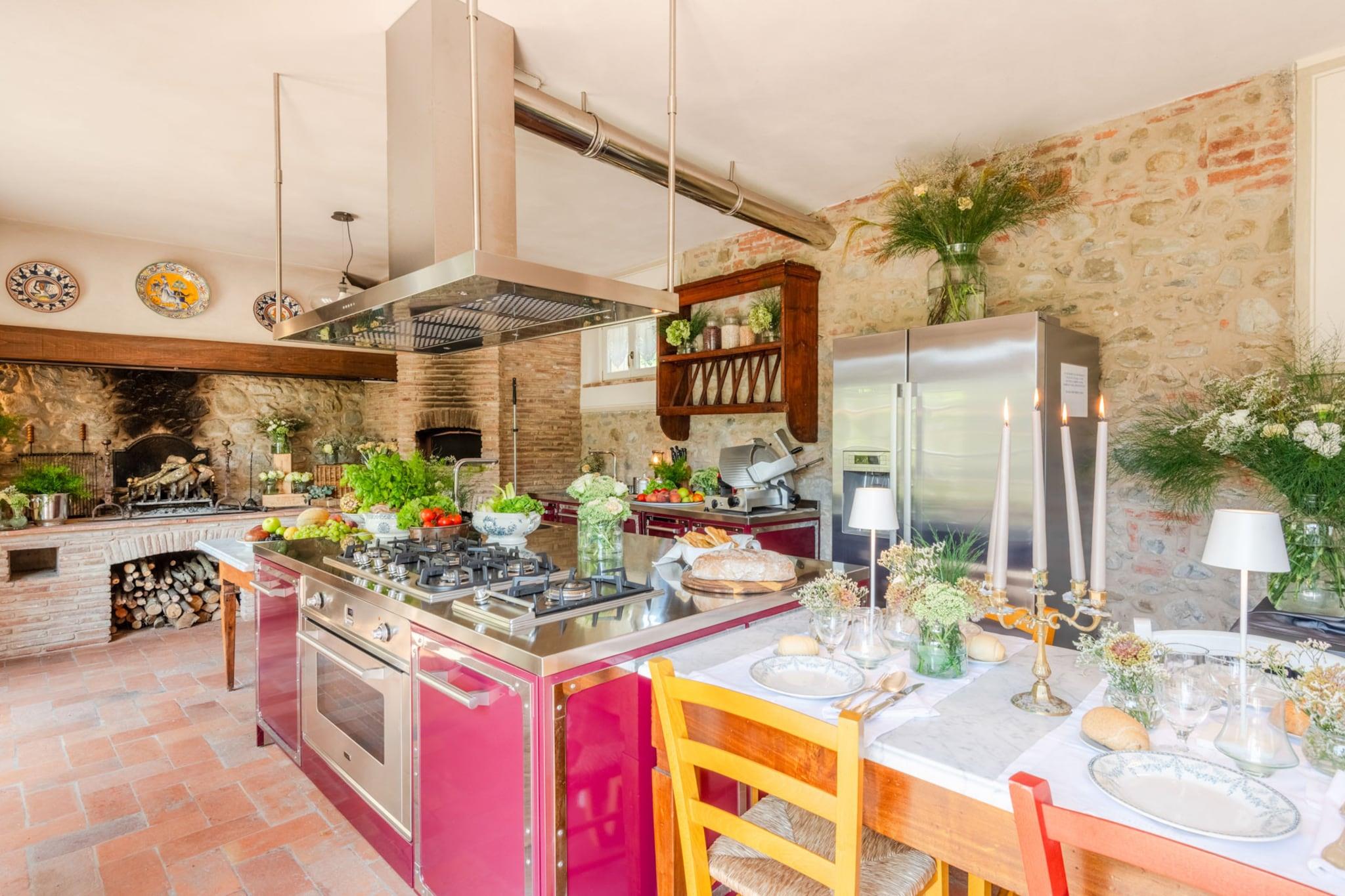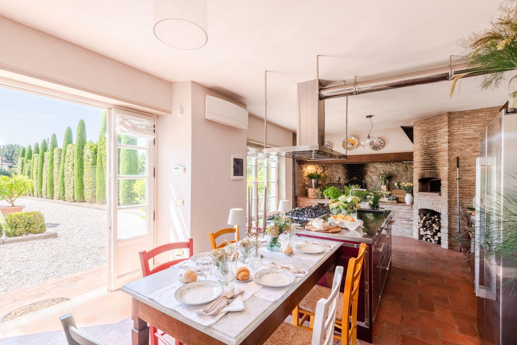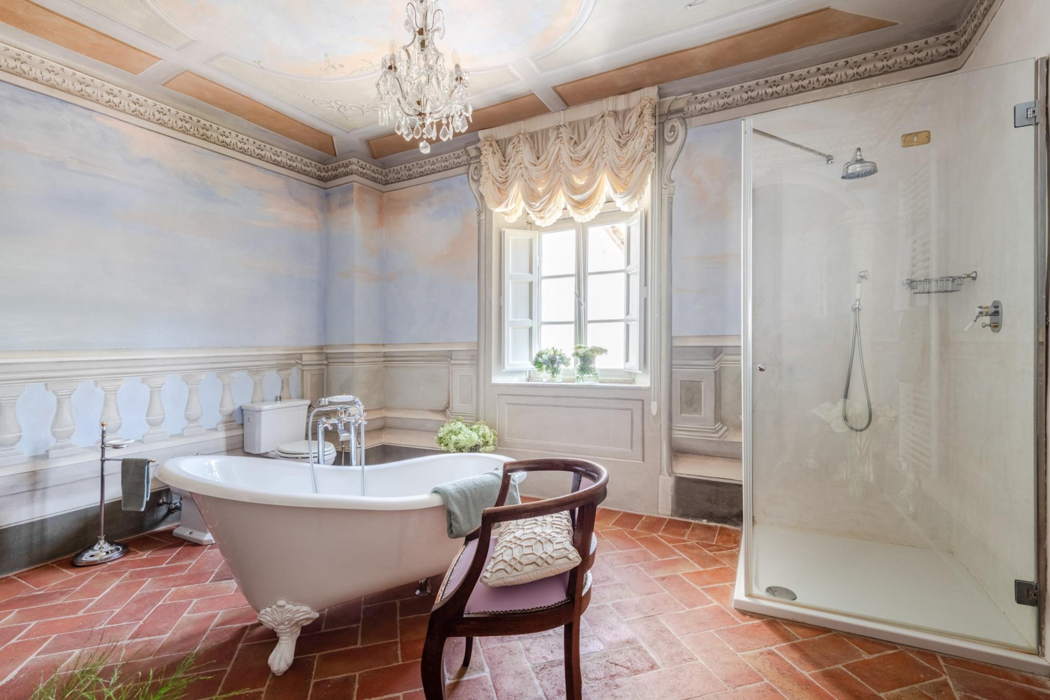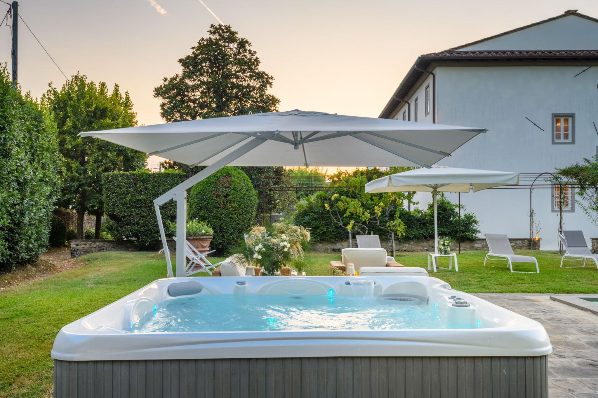 Denne ekstraordinære villaen ligger ved foten av de pittoreske Lucca-åsene, og inviterer deg til en virkelig unik flukt. Den er fullt klimaanlegg for moderne komfort, omgitt av frodige vingårder og omhyggelig velstelte hager, noe som skaper et idyllisk tilfluktssted fra omverdenens kjas og mas. Den store terrassen, som dateres tilbake til 1600-tallet, tilbyr fengslende panoramautsikt over bølgende åser, hvor fantastiske solnedganger kaster nyanser av rosa og oransje over de fjerne vinmarkene. Et sant høydepunkt er den store, overbygde terrassen som er tilgjengelig fra kjøkkenet i første etasje, med en stor utendørs spiseplass med plass til 20 personer – ideelt for å arrangere overdådige måltider med familie og venner. Utstyrt med en grill, inviterer den deg til å nyte utendørs servering mens du nyter den fredelige skjønnheten i det toskanske landskapet. Innvendig blander villaen harmonisk historisk eleganse med moderne luksus; hvert rom har originale møbler sammen med splitter nye king-size-senger og toppmoderne klimaanlegg. Opplev sjarmen til en historisk vinkjeller, hvor vinfat danner scenen for private smaksprøver, og nyt koselige kvelder ved peisen i tradisjonelle kjøkken. Ta en tur ut for å slappe av ved det store bassenget (13m x 6m) med et avslappende boblebad, omgitt av fredelige hager. Villaens førsteklasses beliggenhet gir enkel tilgang til Luccas historiske sentrum og pulserende bymurer, samtidig som du har enkel tilgang til ikoniske destinasjoner som Firenze, Pisa, Cinque Terre og de vakre strendene i Versilia. Denne villaen lover en autentisk toskansk opplevelse, og fungerer som det perfekte fristedet for de som søker avslapning uten å forlate Italias rike kultur og fantastiske landskap. Nyt kjøkkenet i drivhuset på forespørsel mot et tillegg i prisen, noe som forsterker den luksuriøse opplevelsen. Merk: Turistskatt betales på eiendommen.
