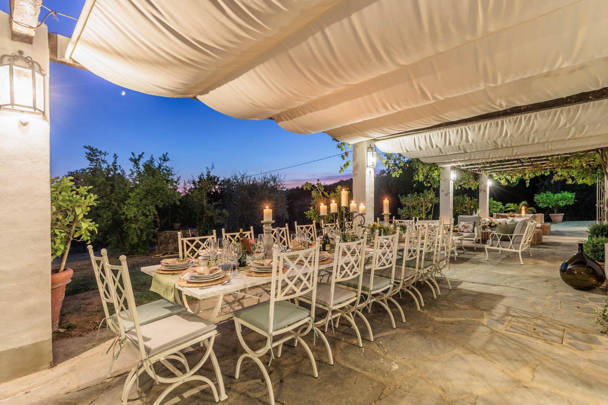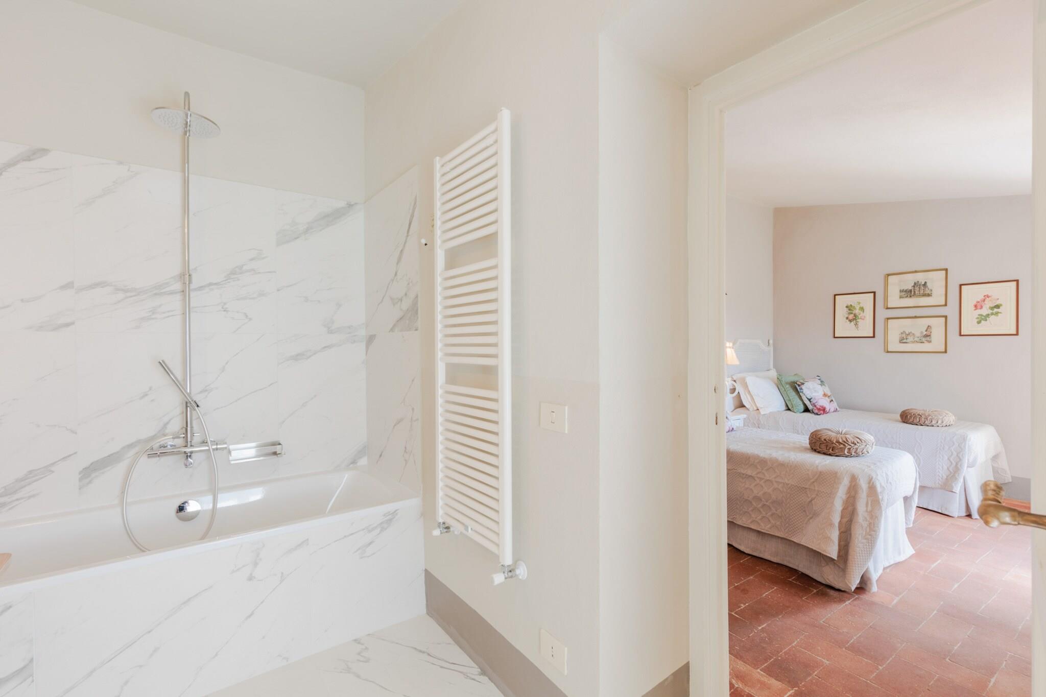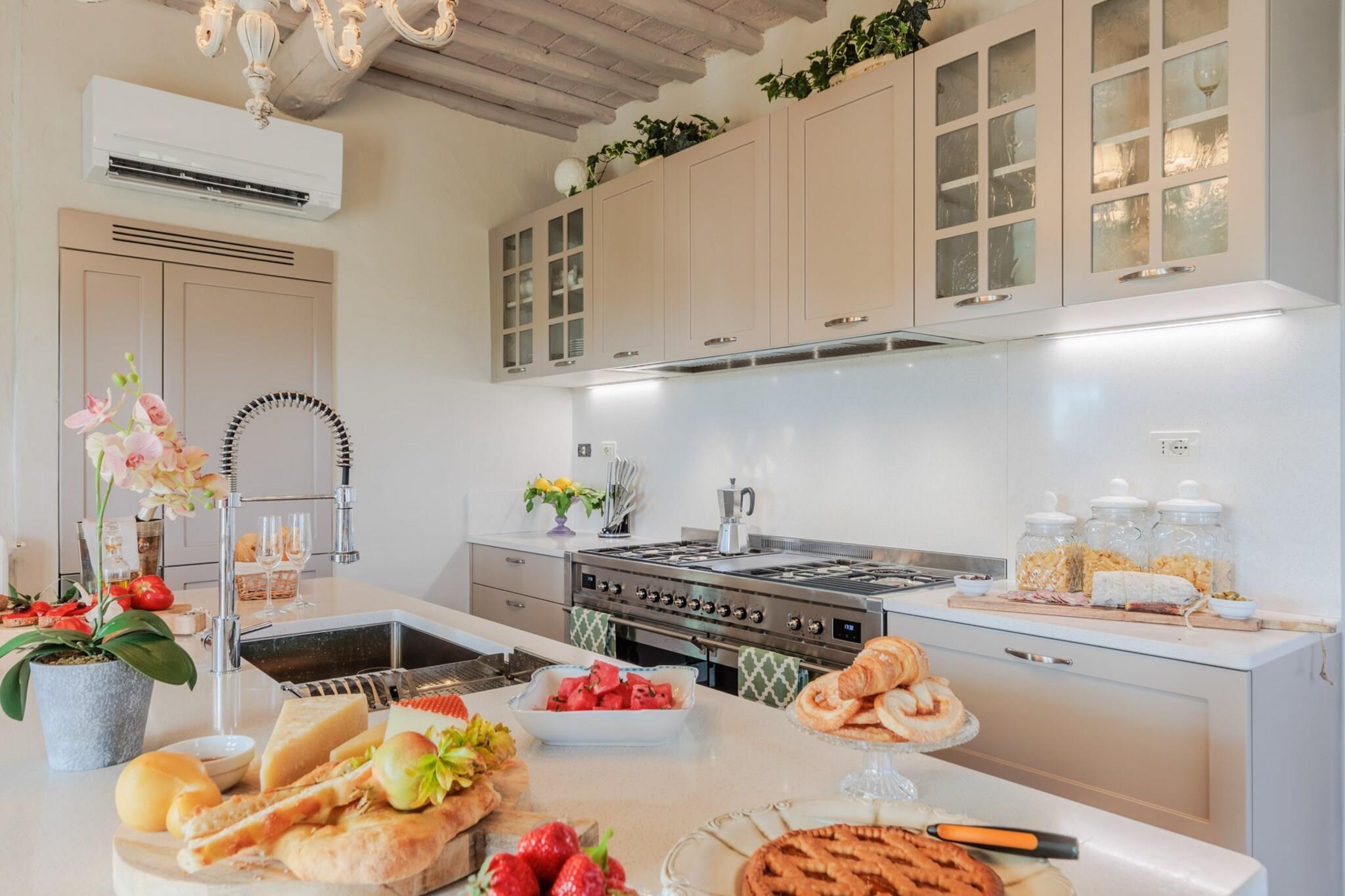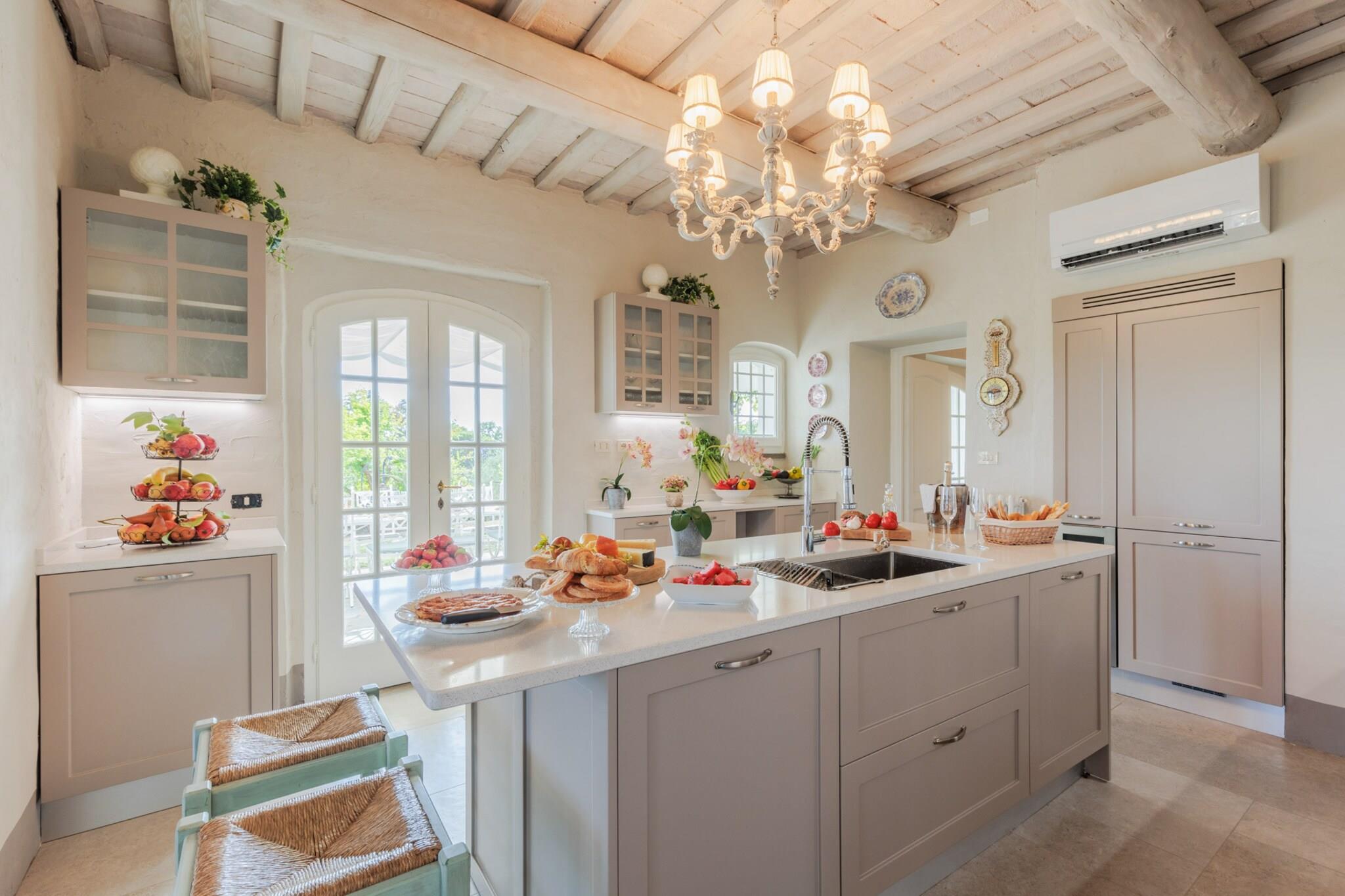 Dette sjarmerende gårdshuset ligger på en ås med utsikt over Lucca, og tilbyr fantastisk utsikt over de omkringliggende åsene. Det ble nylig renovert og blander rustikk sjarm med moderne luksus, og har plass til opptil seksten gjester – noe som gjør det til et ideelt sted for familiesammenkomster eller romantiske utflukter i hjertet av Toscana. De rolige uteområdene er perfekte for avslapning og bespisning, mens interiøret kan skilte med romslige hovedsoverom, marmorbad og et fullt utstyrt kjøkken for en hotelllignende opplevelse. Eiendommen har åtte vakkert innredede soverom, inkludert to i første etasje for enkel tilgang. Mange rom åpner ut mot private balkonger eller verandaer, og den beroligende lyden av vinden som rasler gjennom nesten 700 oliventrær gir en rolig atmosfære, supplert av produksjonen av utsøkt olivenolje. Hvert soverom tilbyr en perfekt blanding av rustikk sjarm og moderne komfort, noe som sikrer et avslappende opphold for alle. Våningshuset har en beleilig beliggenhet like utenfor Marlia, bare en kort kjøretur fra Luccas historiske sentrum, med en rekke butikker og restauranter i nærheten. Gjestene kan slappe av ved evighetsbassenget eller ta et bad i boblebadet mens de nyter spektakulær utsikt. Om kveldene kan du grille ferske, lokale råvarer eller leie en privat kokk for å lage deilig italiensk mat. Utforsk den rike historien i regionen, med Luccas romerske amfiteater bare noen minutter unna og ikoniske byer som Pisa, Firenze og San Gimignano innen en times kjøretur, slik at du kan oppleve både det fantastiske landskapet og roen i Toscana. Merk: Turistskatt skal betales på eiendommen.