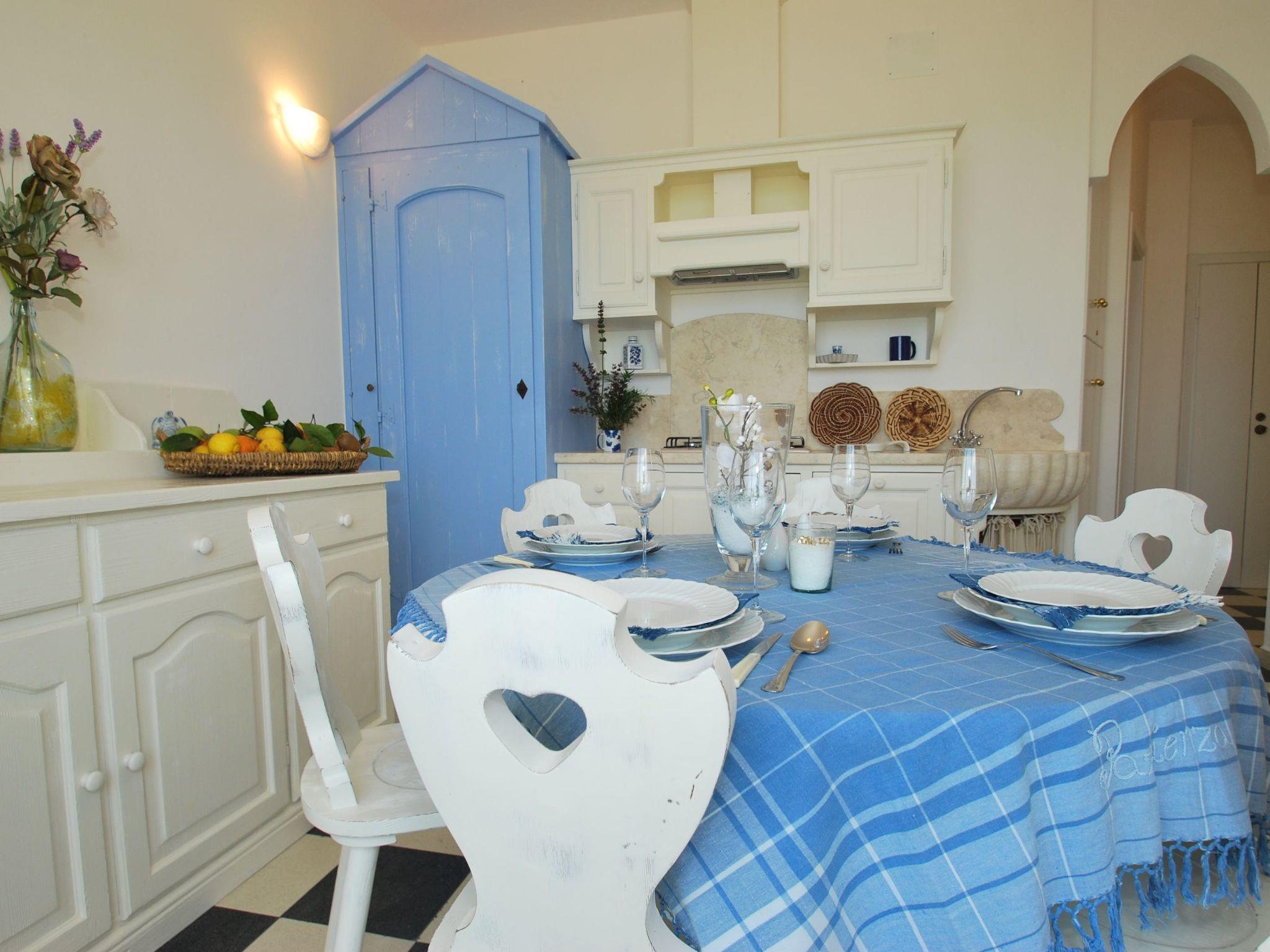 From this room there is access to a balcony overlooking the sea, furnished with a marble table and wrought-iron chairs. A door on the front right leads to the dining room, where there is a dining table and two sofas that can be converted into single beds. The kitchen is very well equipped with a gas cooker, microwave, refrigerator with freezer, toaster, kettle, mocha and filter coffee machines and dishwasher. This room overlooks a balcony with a breathtaking view.