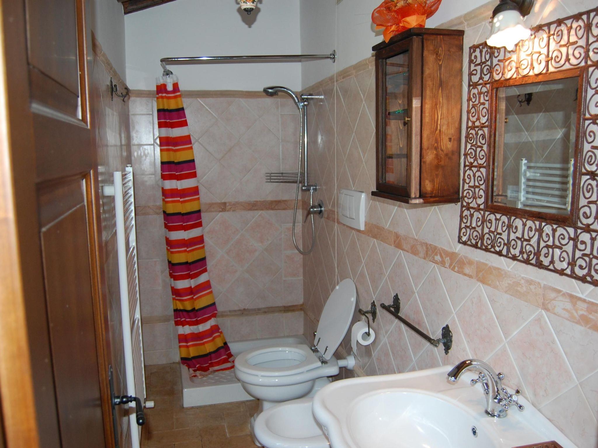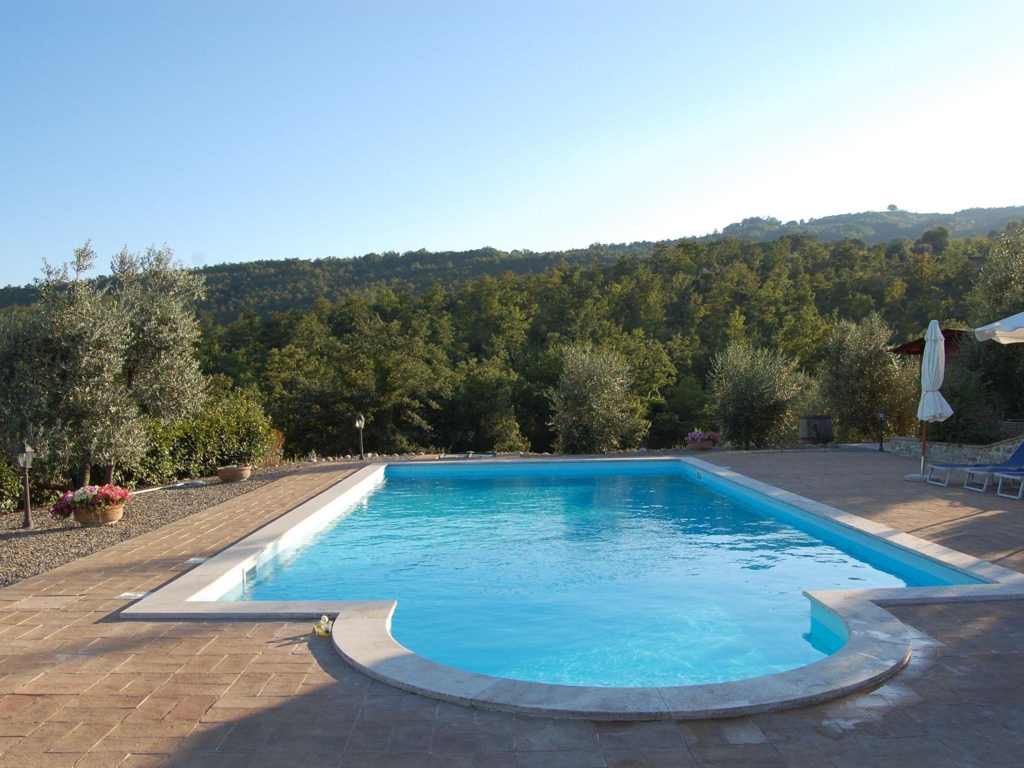The kitchen-living room on the ground floor offers access to the porch equipped with table and chairs. The property covers about 10,000 m²: one part is a large garden with lawn, while the larger part is covered with olive trees, oaks, cypresses and native bushes. The swimming pool, equipped with sun loungers, parasols and a shower, offers a splendid view of the hilly landscape. In front of the country house is an old handmade fountain. Furthermore, guests have at their disposal an old stone wood-burning oven with barbecue right in front of the house, where they can bake pizza or bread and spend convivial barbecue evenings. The property has a private parking area for guests.