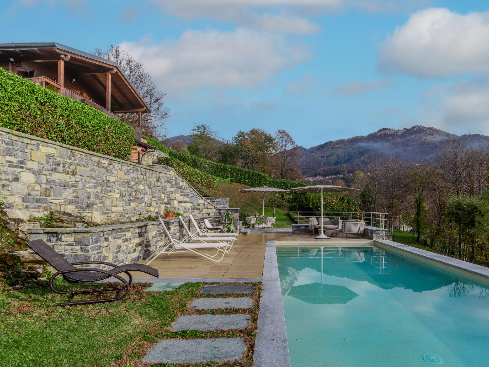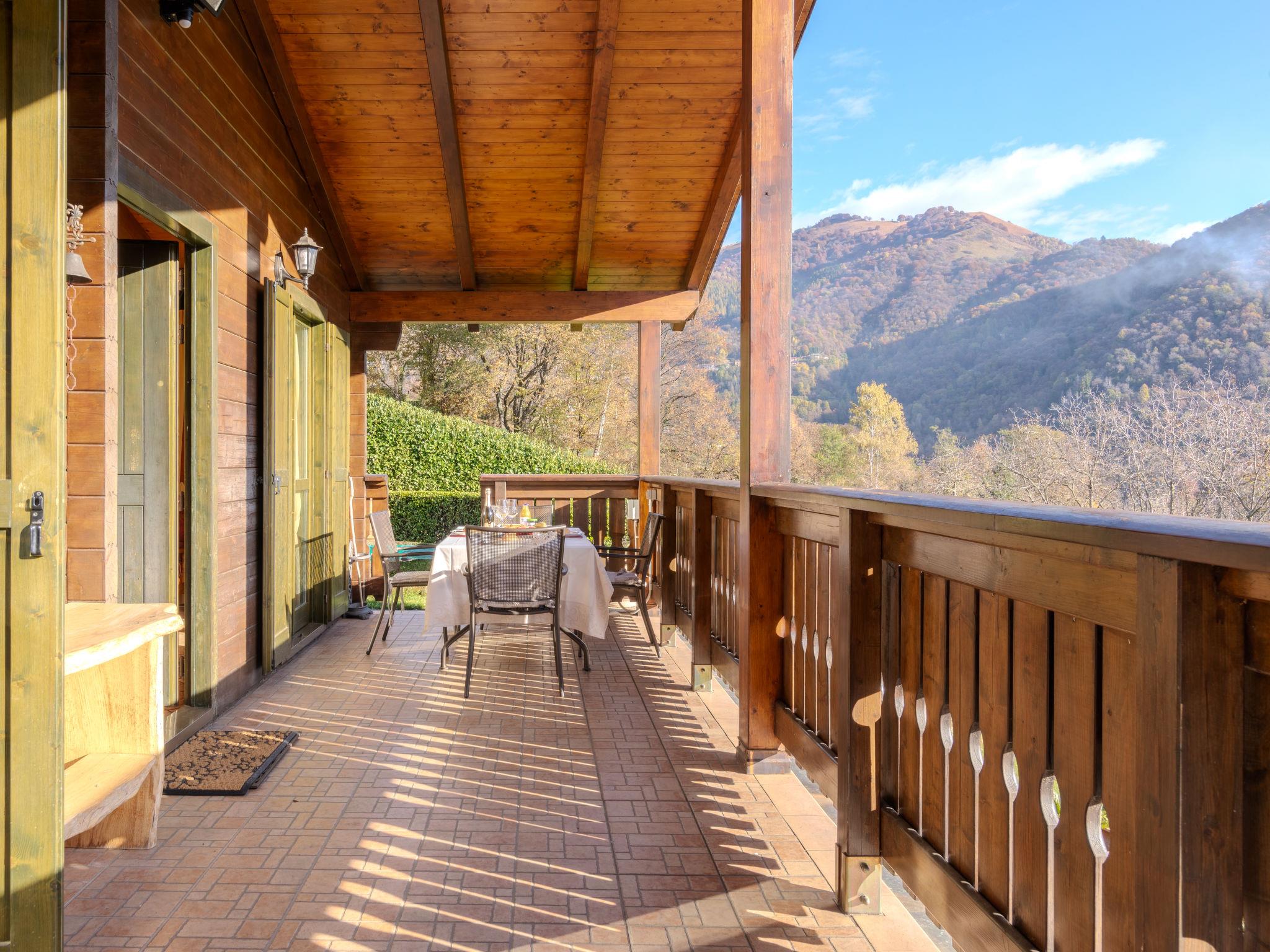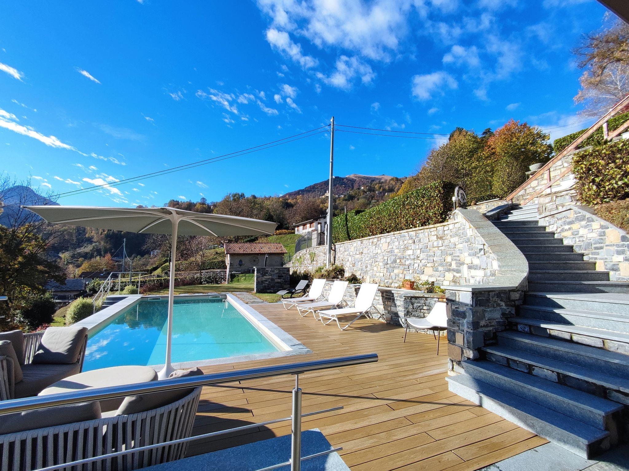 Cosy, comfortable chalet "Il Poggio del Castagno", 2 storeys, detached. In the district of Veglio 500 m from the centre of Cerano Intelvi, 7.5 km from the centre of Argegno, 28 km from the centre of Como, in a sunny, elevated position on a slope, residential area (villas), 7.5 km from the lake, in a cul-de-sac, in the countryside. Private: property 6'000 m2 (fenced), terraced garden with lawn and wildlife garden, swimming pool angular (depth 140 cm, seasonal availability: 01.May. - 31.Oct.). Outdoor shower, terrace, garden furniture, pool maintenance by the owner/gardener. In the house: air conditioning, heating available only from 15.Oct. - 30.Apr.. 200 m long steep motor access to the grounds. Parking (for 3 cars) on the premises. Grocery 650 m, supermarket 5 km, restaurant 2 km, bar 750 m, bus stop 200 m, railway station "Como" 27 km, ferry "Cadenabbia" 18 km, sandy beach "Argegno-Lago di Como" 7.5 km, outdoor swimming pool 7.5 km. Marina 7.5 km, golf course (9 hole) 10 km, sports centre 750 m, walking paths from the house 300 m, children's playground 750 m. Nearby attractions: Balcone d'Italia-Sighignola, Villa Carlotta-Tremezzo, Villa Balbianello-Lenno, Menaggio, Bellagio, Varenna. Well-known lakes can easily be reached: Lago di Como, Lago di Lugano. Hiking paths: Monte Generoso-San Zeno, Monte Brè, Alpe Grande-Orimento. Please note: car recommended. The owner does not accept any youth groups.