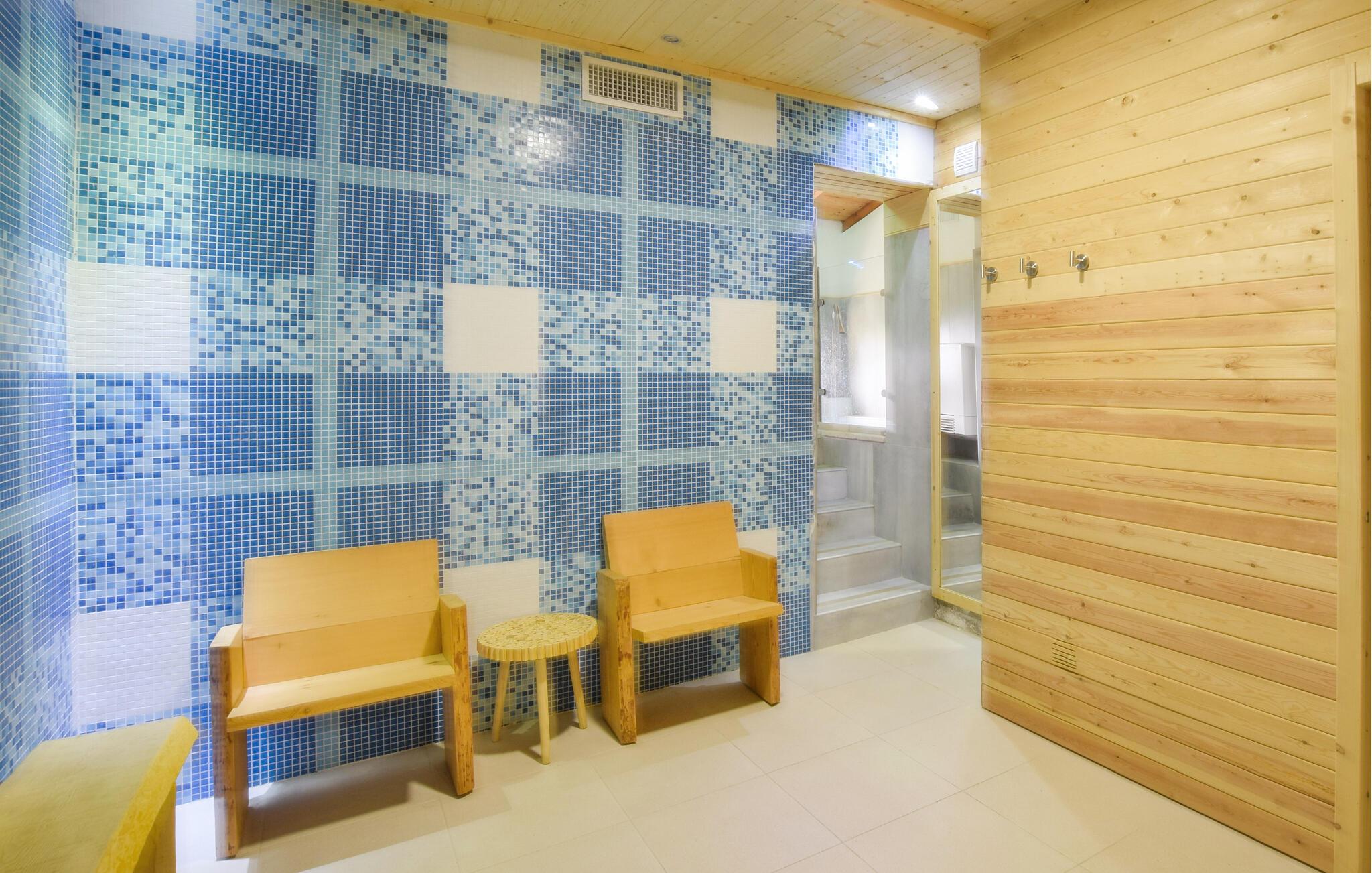 Dette lyse og romslige feriehuset er designet for å tilby deg avslapning og en hyggelig atmosfære midt i det fortryllende landskapet. Gled deg til harmoniske måltider i den åpne planløsningen, hvor du kan nyte en fantastisk utsikt over det grønne takket være de store vinduene. Unn deg koselige timer i innendørsbassenget, eller bruk tiden her til å lære barna å svømme.