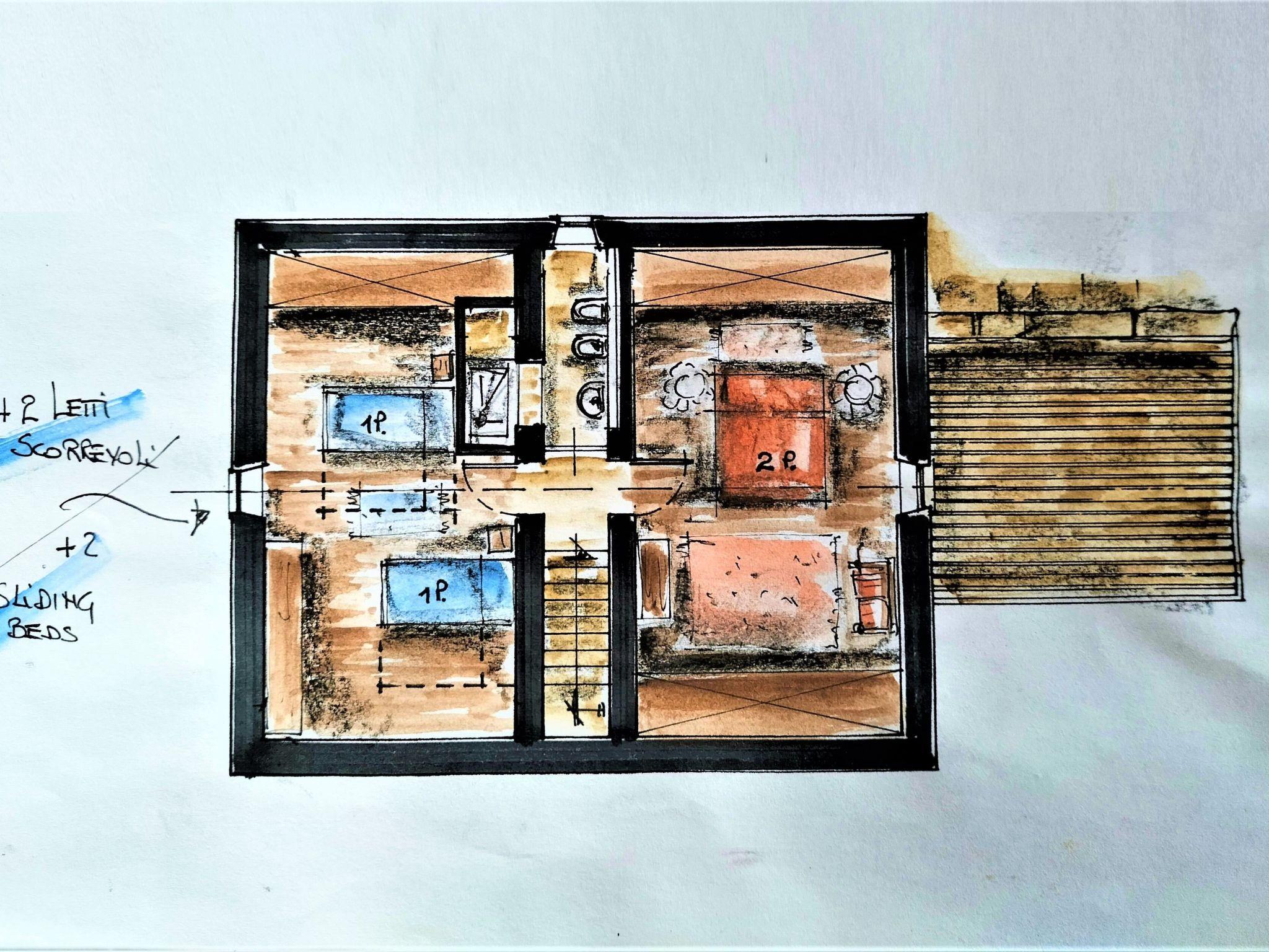 Second floor: large double bedroom, a large room with 2/4 beds, bathroom with large masonry shower.