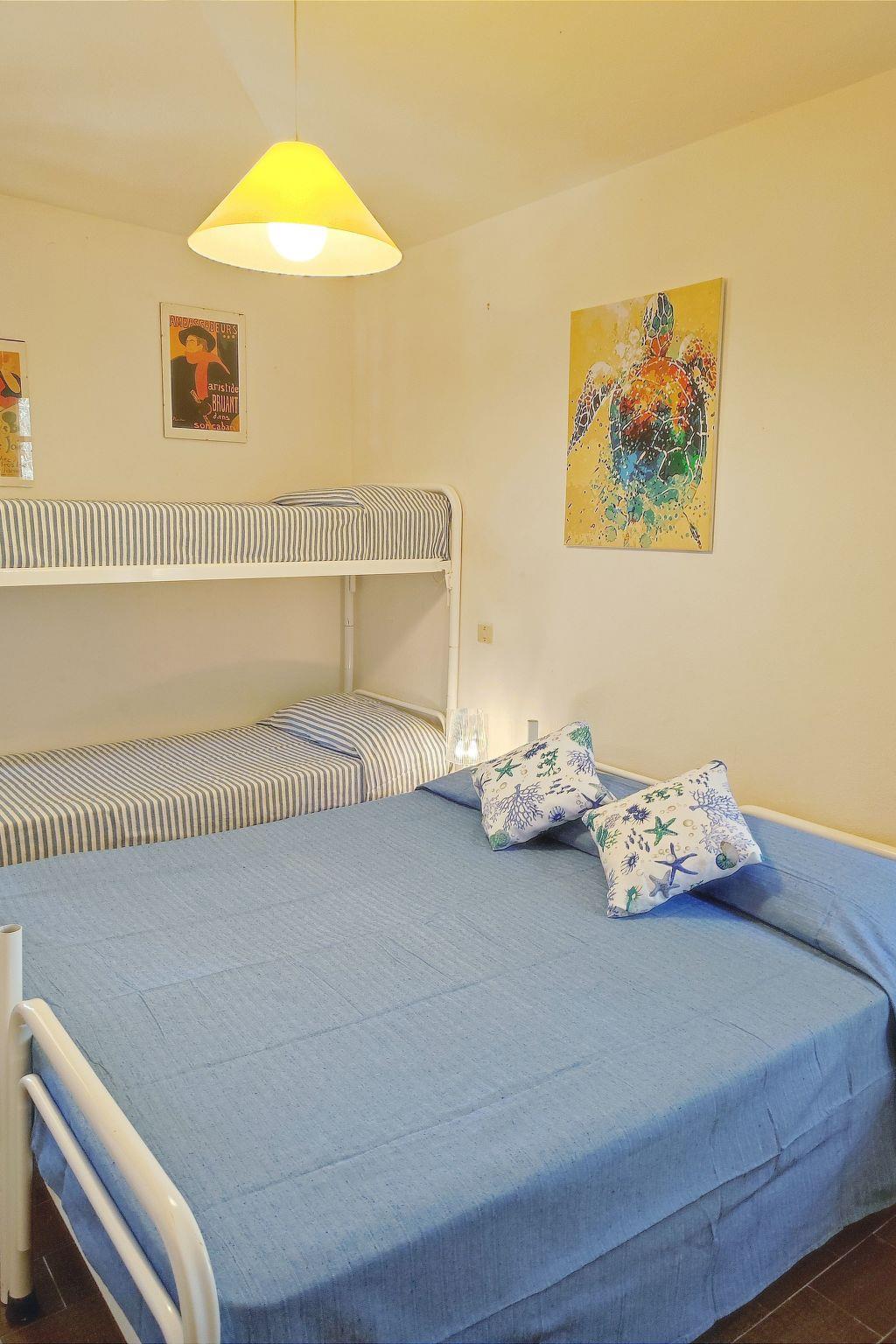 Inside there is a large living room with sofas, satellite colour TV, a large dining room, a fully equipped kitchen with fridge, freezer, oven and microwave oven, a bathroom with washing machine. On the first floor is the sleeping area with: one double bedroom, one bedroom with a double bed and a bunk bed and two bathrooms.