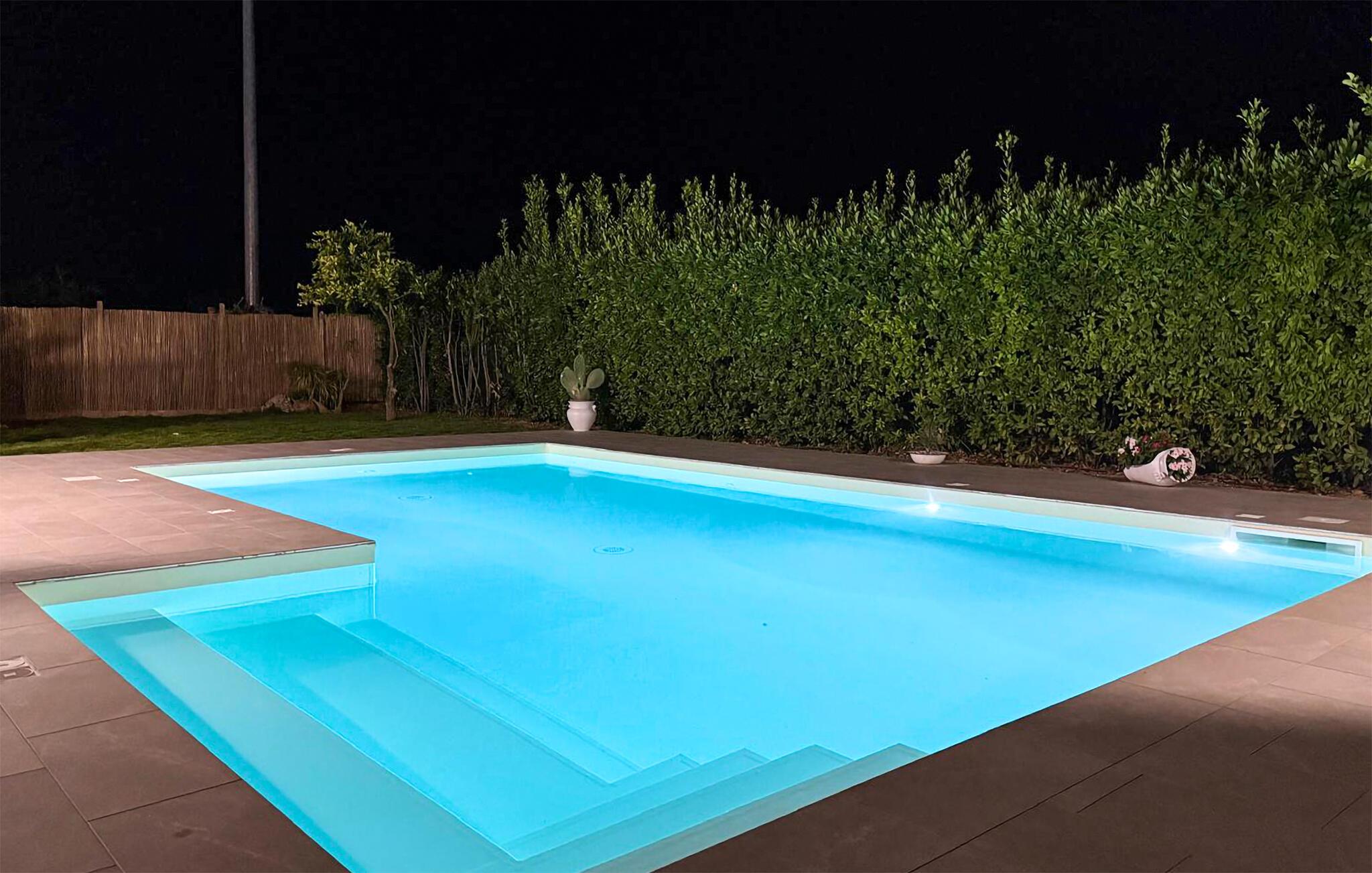 Utenfor venter et vakkert basseng med stemningsfull belysning om kvelden, der du kan forfriske deg når som helst på døgnet. Ta deg en drink under pergolaen, og gled deg til lange grillkvelder med vin og levende lys.