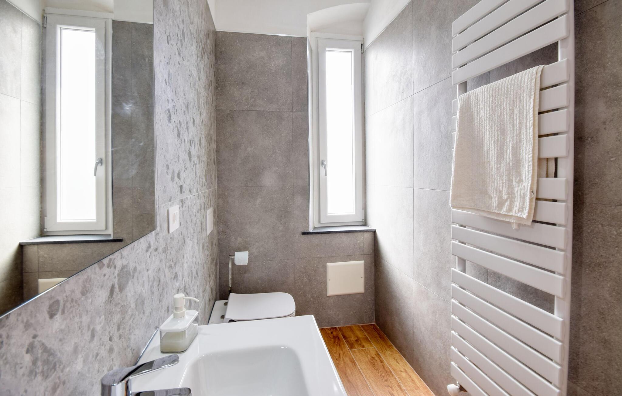 Denne romslige og smakfullt innredede ferieleiligheten tilbyr deg et koselig tilfluktssted mens du utforsker skattene langs den liguriske kysten. Planlegg eventyrene dine over stilfulle måltider ved det innbydende spisebordet, og slapp av i sofaen med en film etter en lang dag.