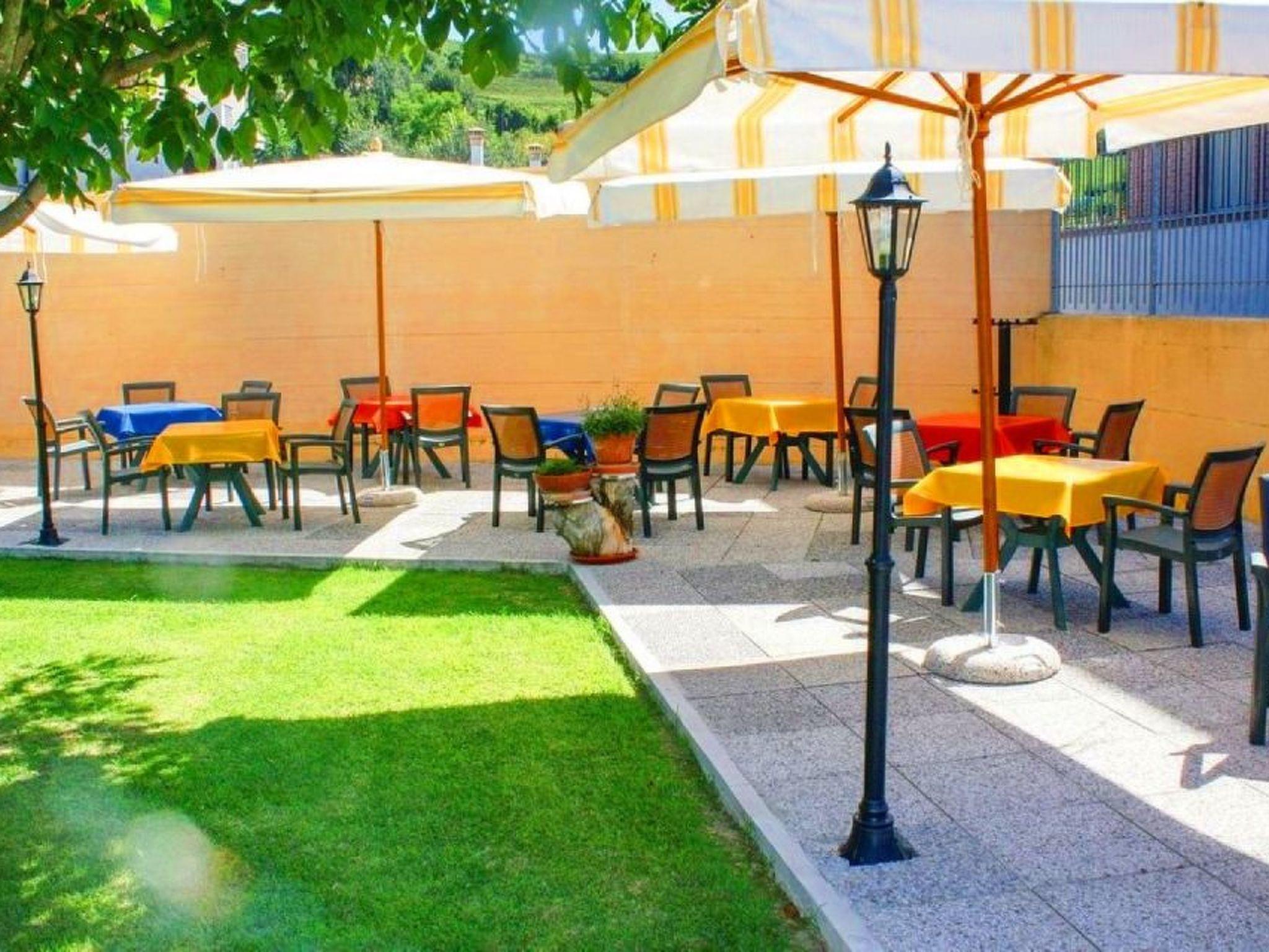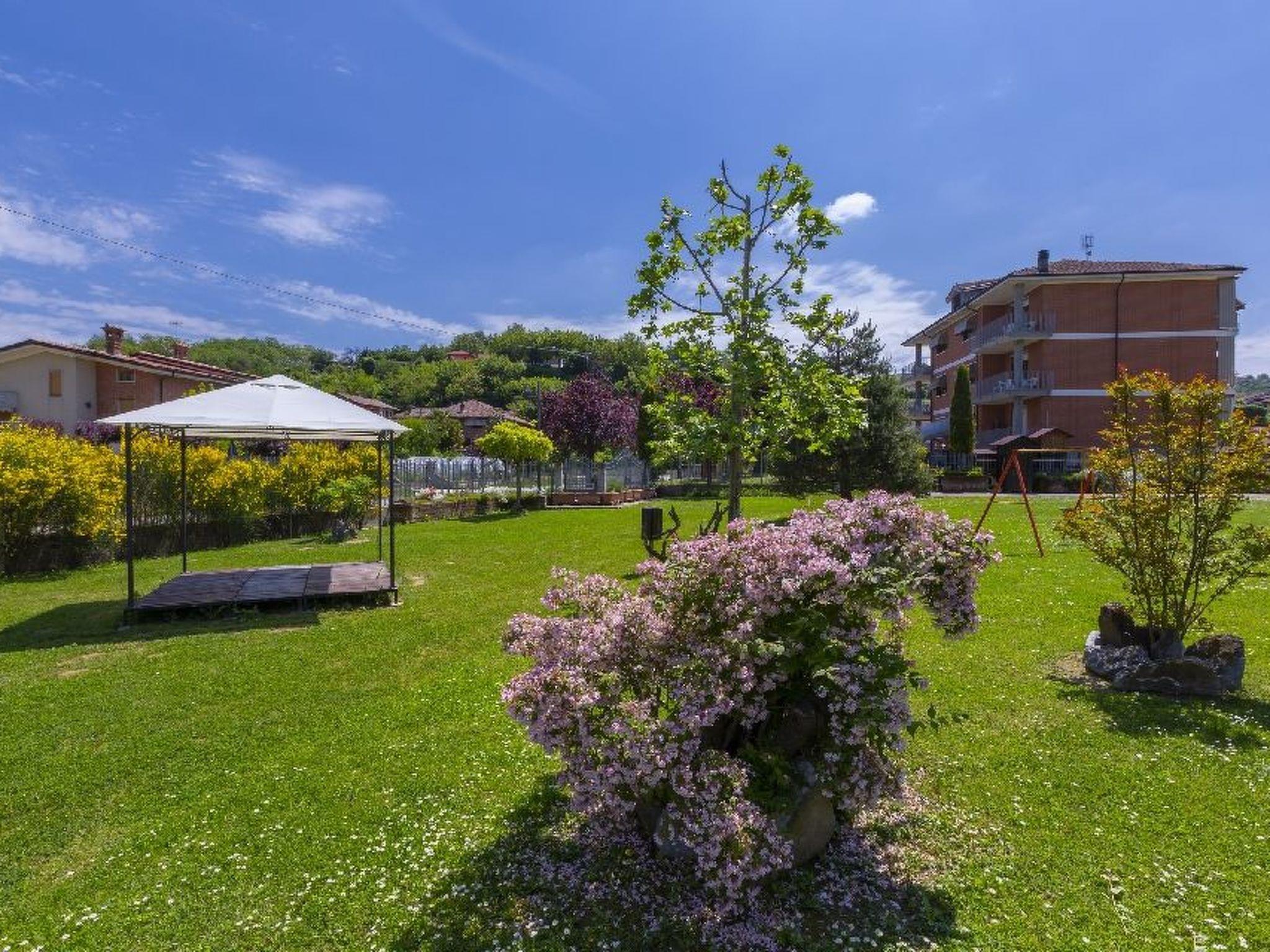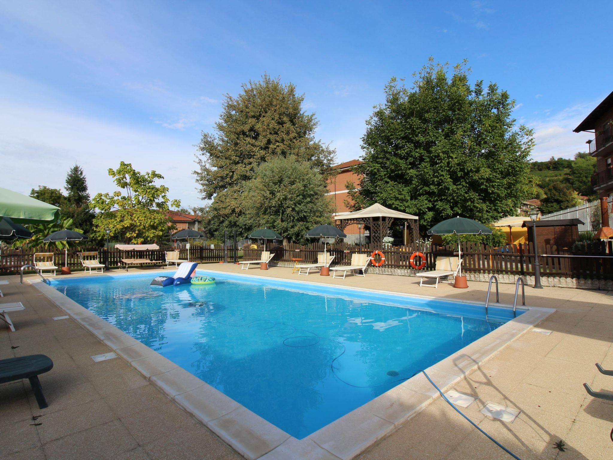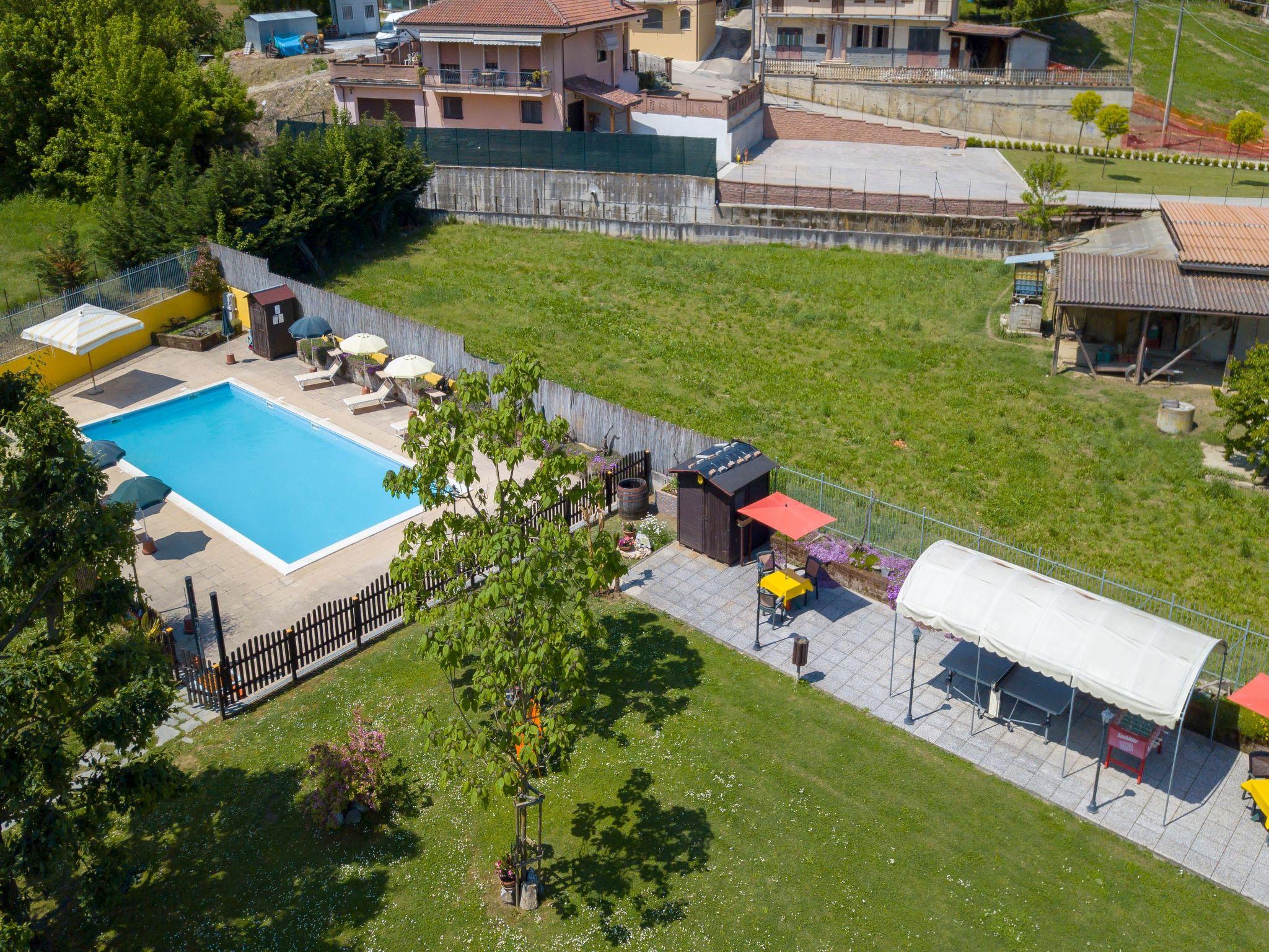 There is parking space in the fenced yard. In the garden there is a swimming pool with solarium equipped with sun beds and umbrellas and 2 solar showers, gazebo and large umbrellas with chairs and tables, 2 barbecues, table tennis table, table football and volleyball area on the lawn. All this surrounded by trees and flowers. There is also a wallbox for charging electric cars. The flat has a large 10 m2 balcony, equipped with garden furniture and overlooking the hills and the beautiful village of Cisterna d'Asti, which dominates the valley.