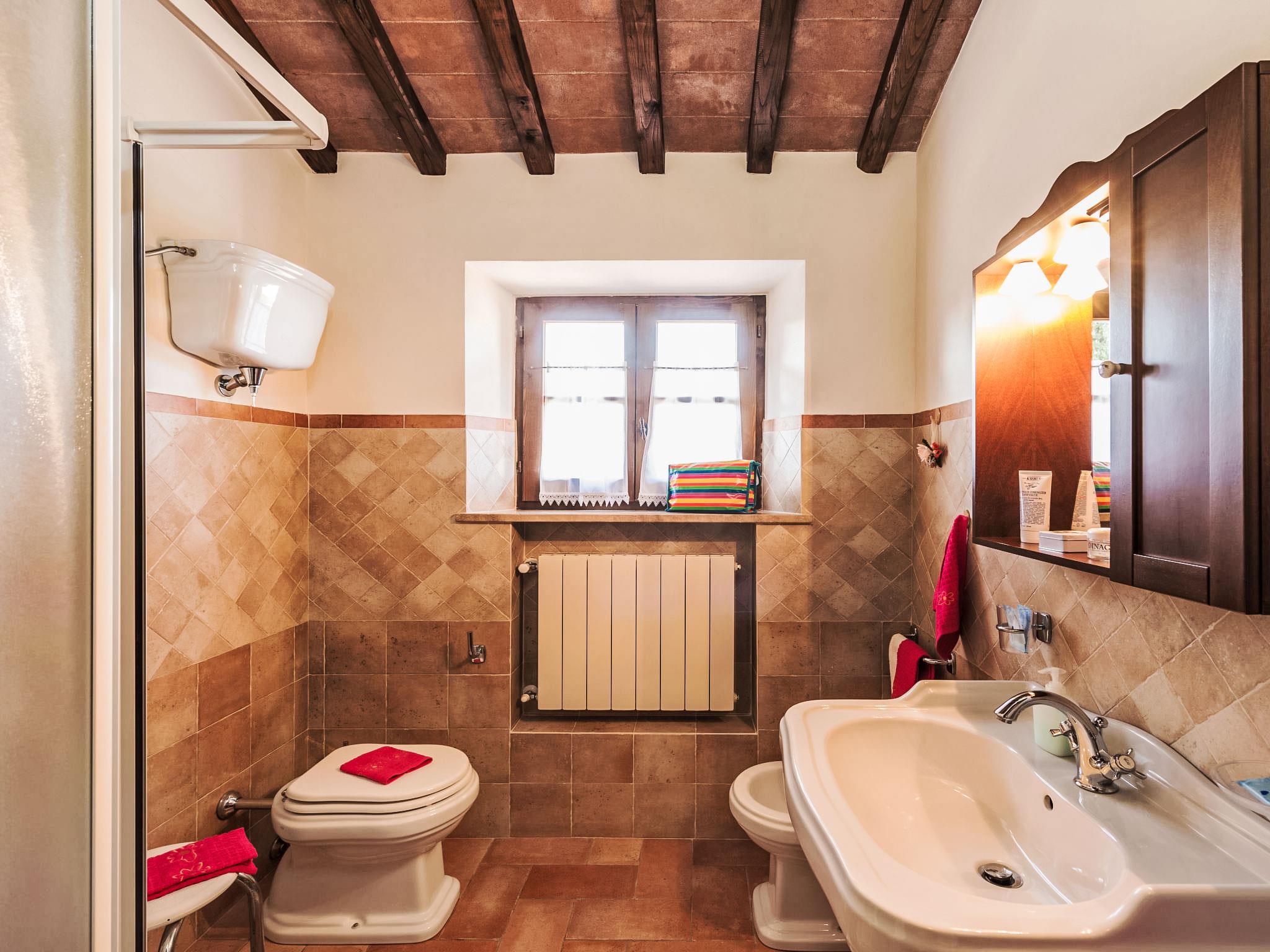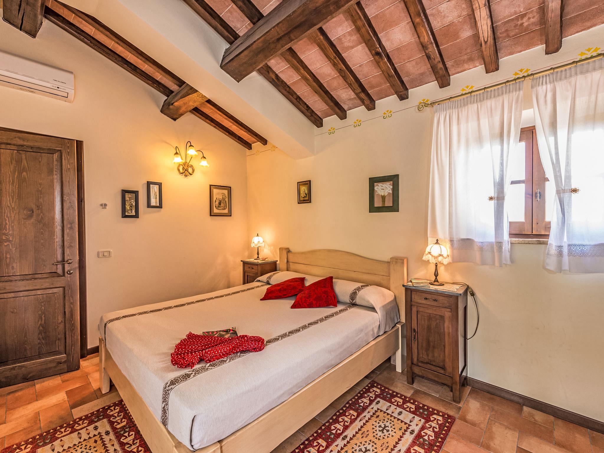 Country house "Casa Graziani". 3 houses in the residence. 9 apartments in the residence. In the hamlet Schiacciato 13 km from the centre of Città della Pieve, 16 km from the centre of Cetona, 46 km from the centre of Perugia, 10 km from the lake, in the countryside. For shared use: property 4'000 m2 (fenced), well-kept garden with lawn and trees, swimming pool (16 x 8 m, depth 120 - 180 cm, seasonal availability: 01.May. - 30.Sep.). Table tennis, fireplace, children's playground. In the house: sauna (extra). Fitness room, table football, bicycles available. Parking on the premises. Supermarket 3 km, bus stop 400 m, railway station "Chiusi Scalo" 7 km.