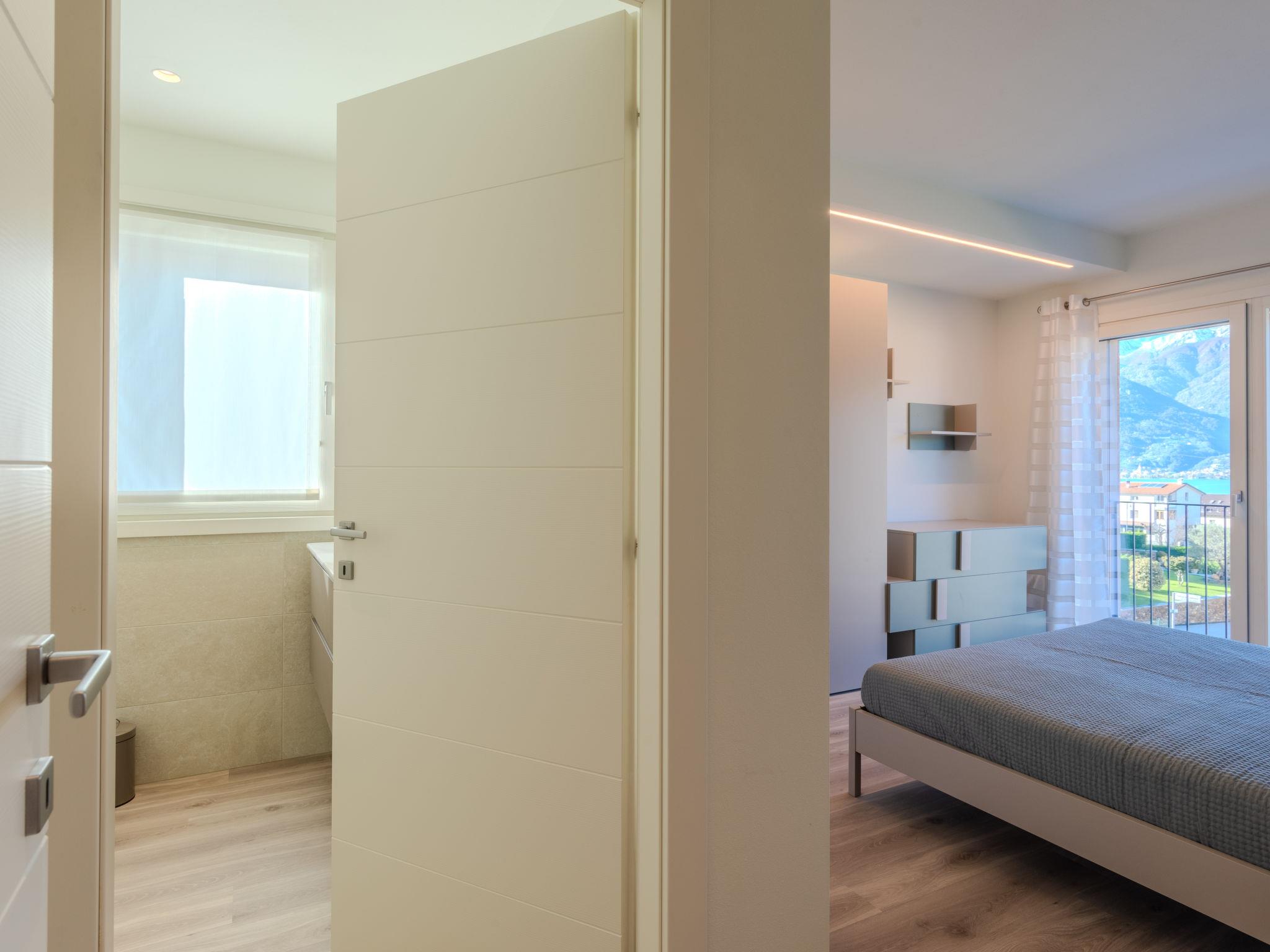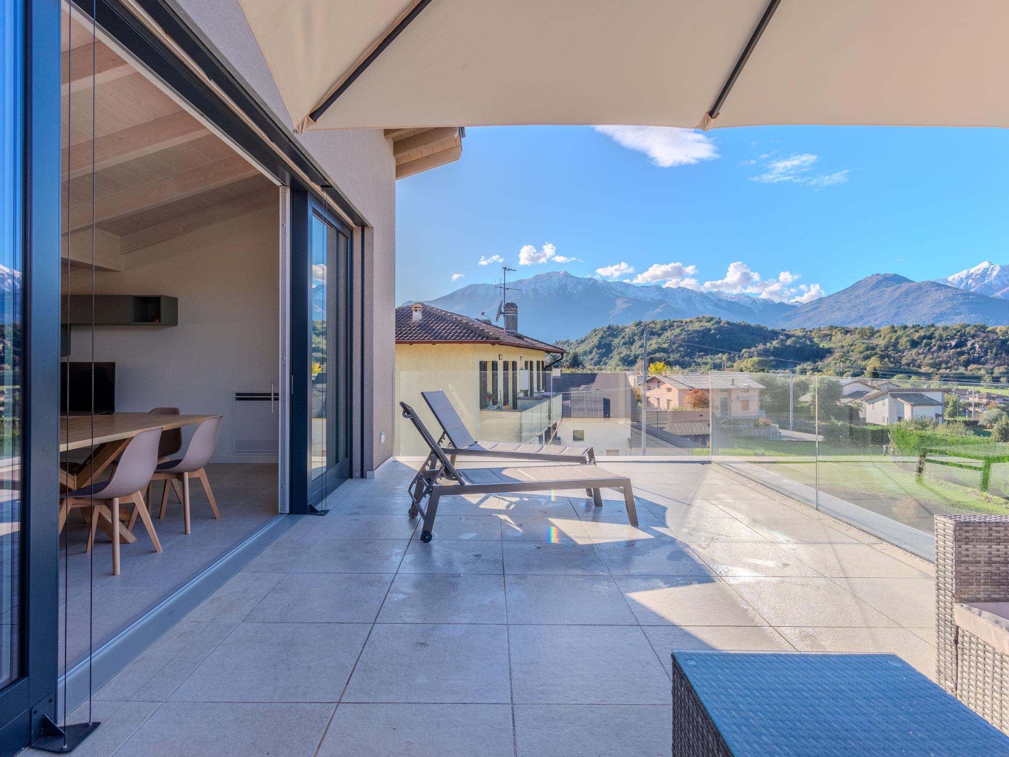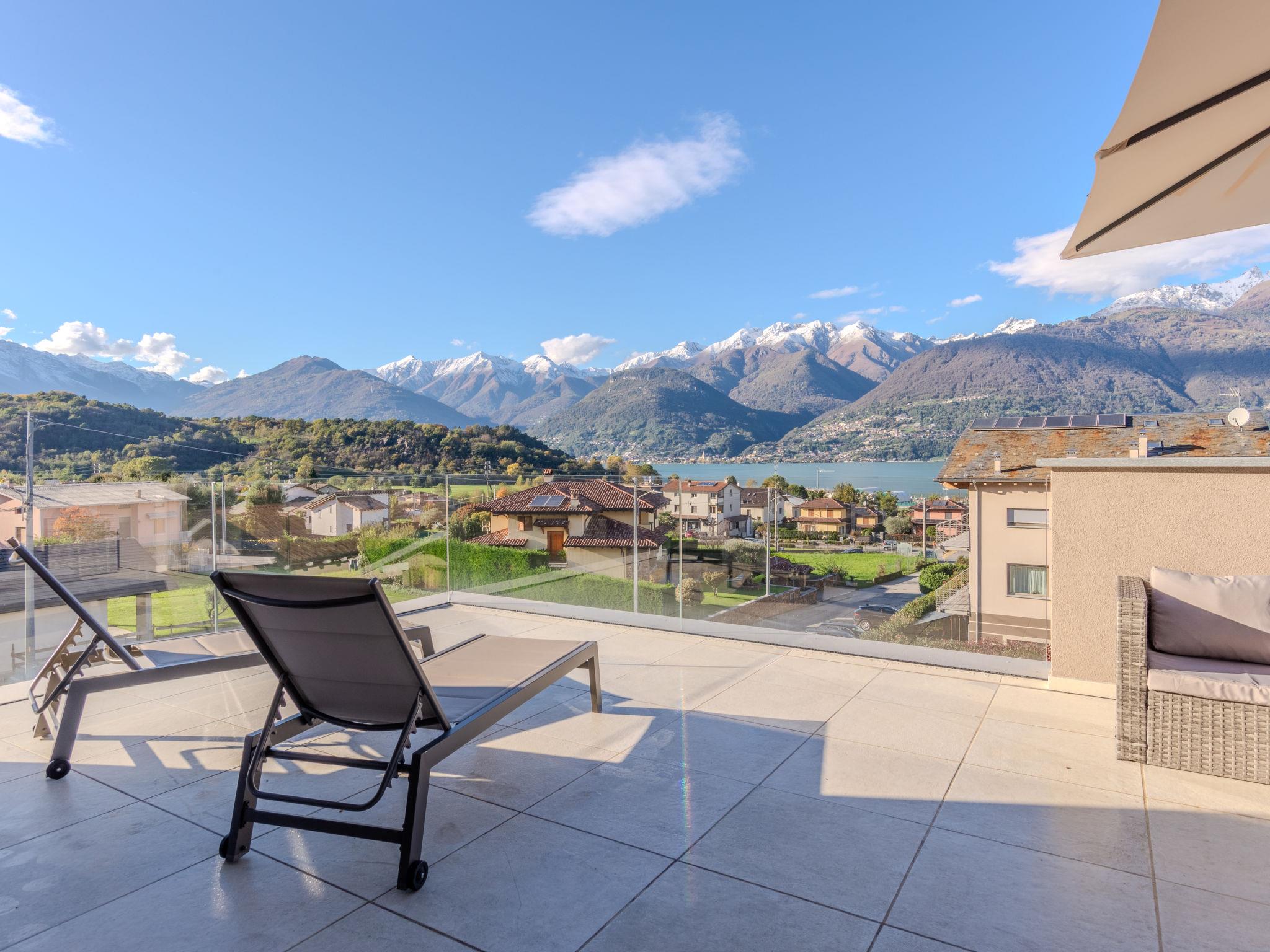 Large, modern house "Uliveto", 3 storeys, built in 2023. 650 m from the centre of Colico, 38 km from the centre of Lecco, 69 km from the centre of Como, in a central, elevated position, 700 m from the lake. Private: property 300 m2 (fenced) with lawn, swimming pool angular (3 x 8 m, depth 140 cm, seasonal availability: 01.Apr. - 30.Oct.). Outdoor shower, pool maintenance by the owner/gardener. In the house: storage room for bicycles. Linen change (suppl. charge extra). Room cleaning on request (extra). Parking (for 3 cars) on the premises, single garage. Supermarket 1.5 km, restaurant 450 m, bar 500 m, bakery, pedestrian zone 600 m, bus stop 900 m, railway station "Colico" 1 km, ferry 600 m, grass beach "Lido di Colico" 700 m. Golf course (18 hole) 37 km, surf school 1.5 km, riding stable 3.4 km, children's playground 1.1 km. Nearby attractions: Forte Montecchio Nord, Abbazia di Piona, Torri di Fontanedo. Well-known ski regions can easily be reached: Madesimo, Livigno. Well-known lakes can easily be reached: Lago di Mezzola. Hiking paths: Pian di Spagna, Monte Legnone. The owner does not accept any youth groups.