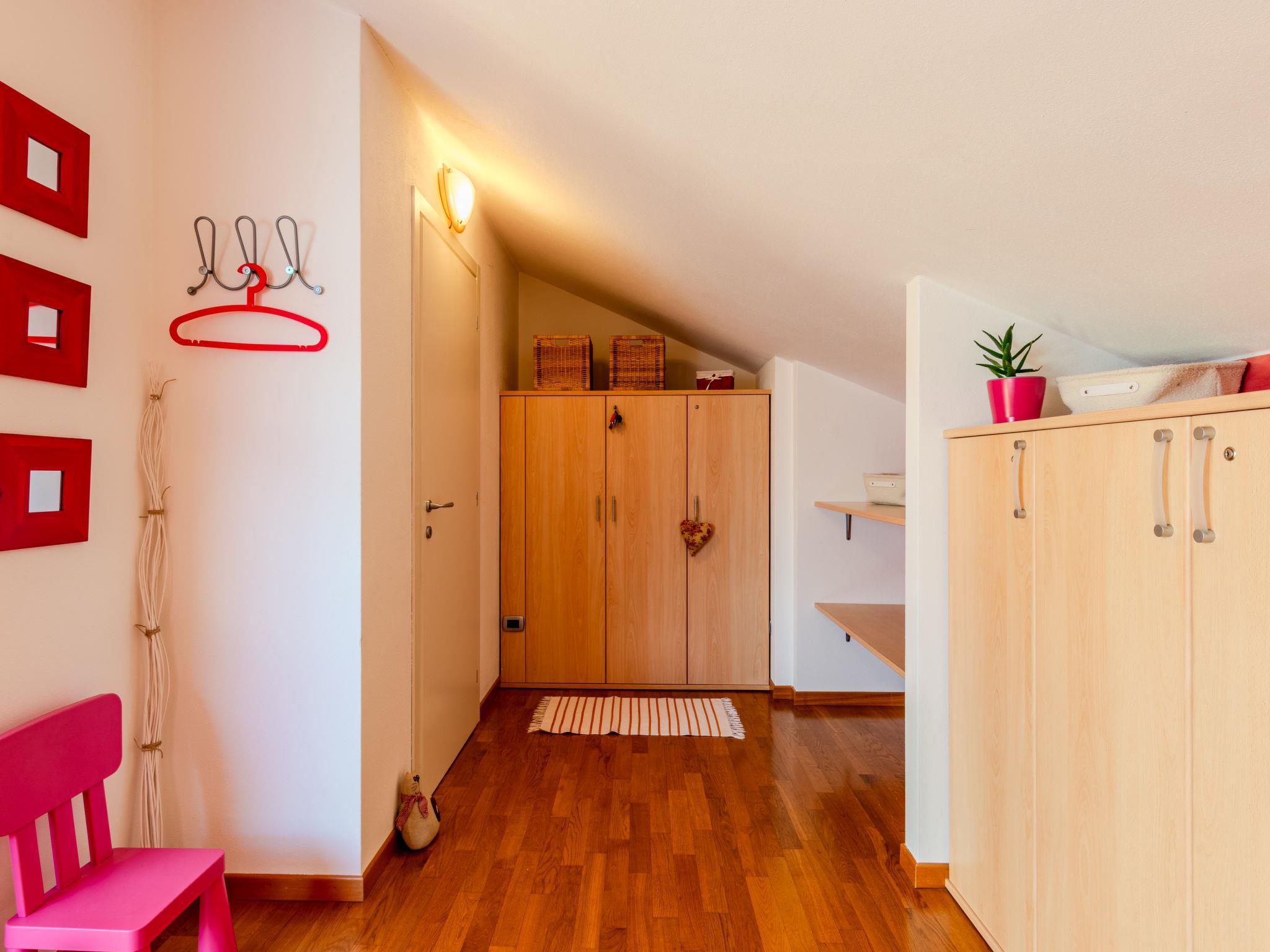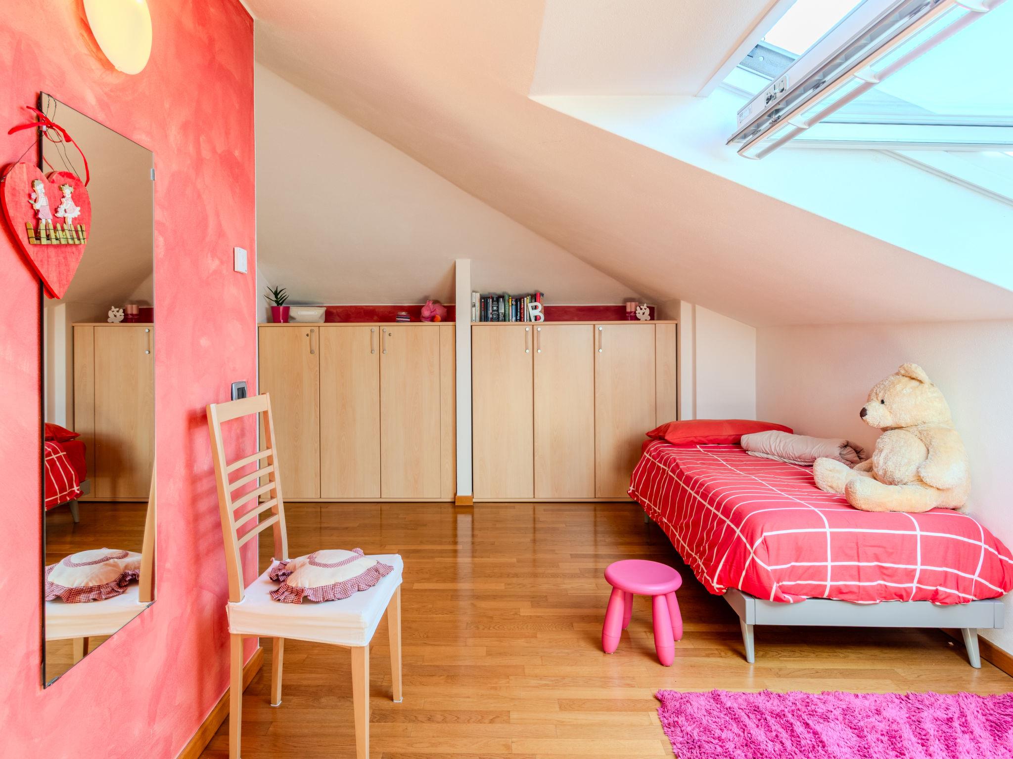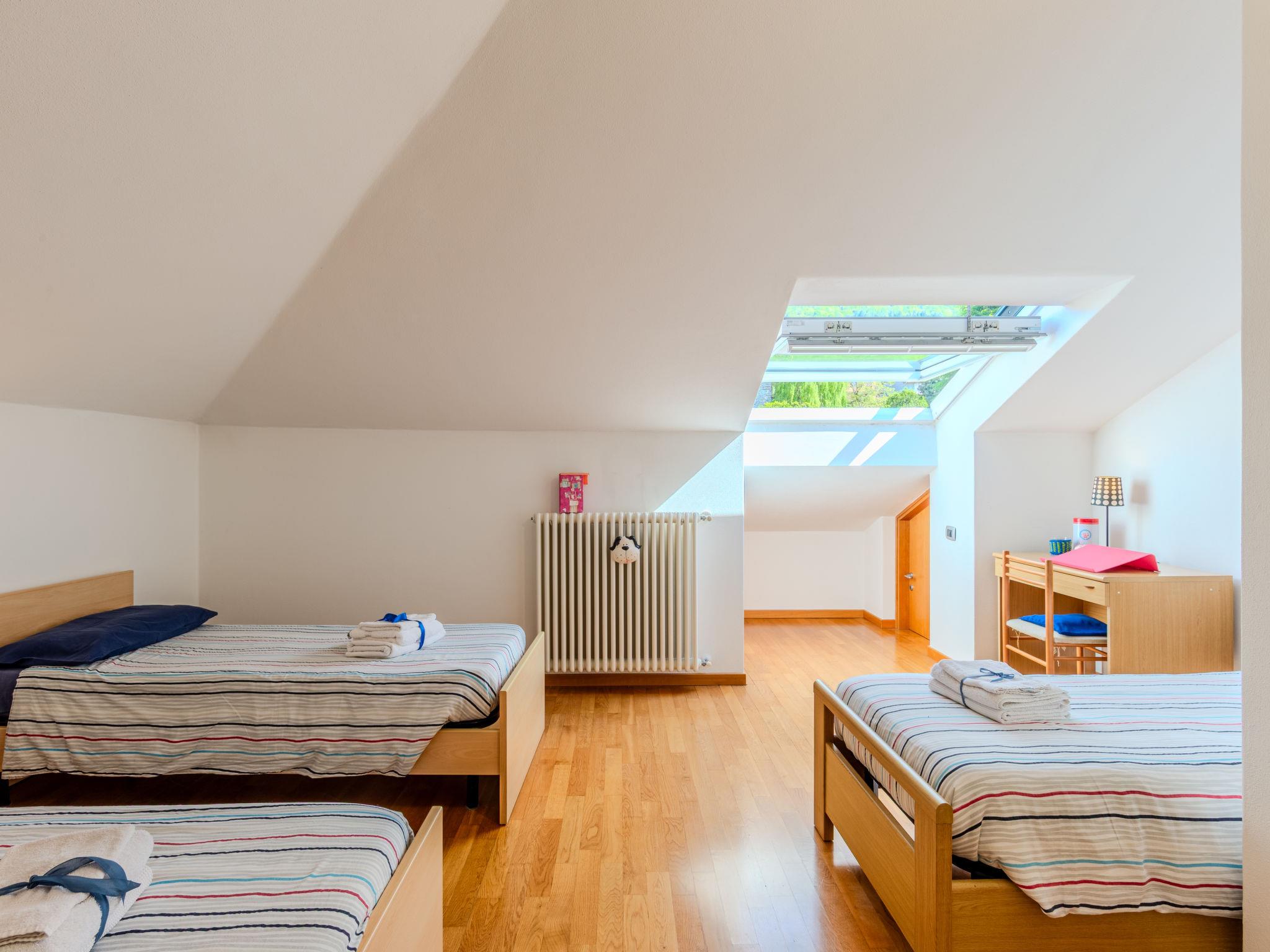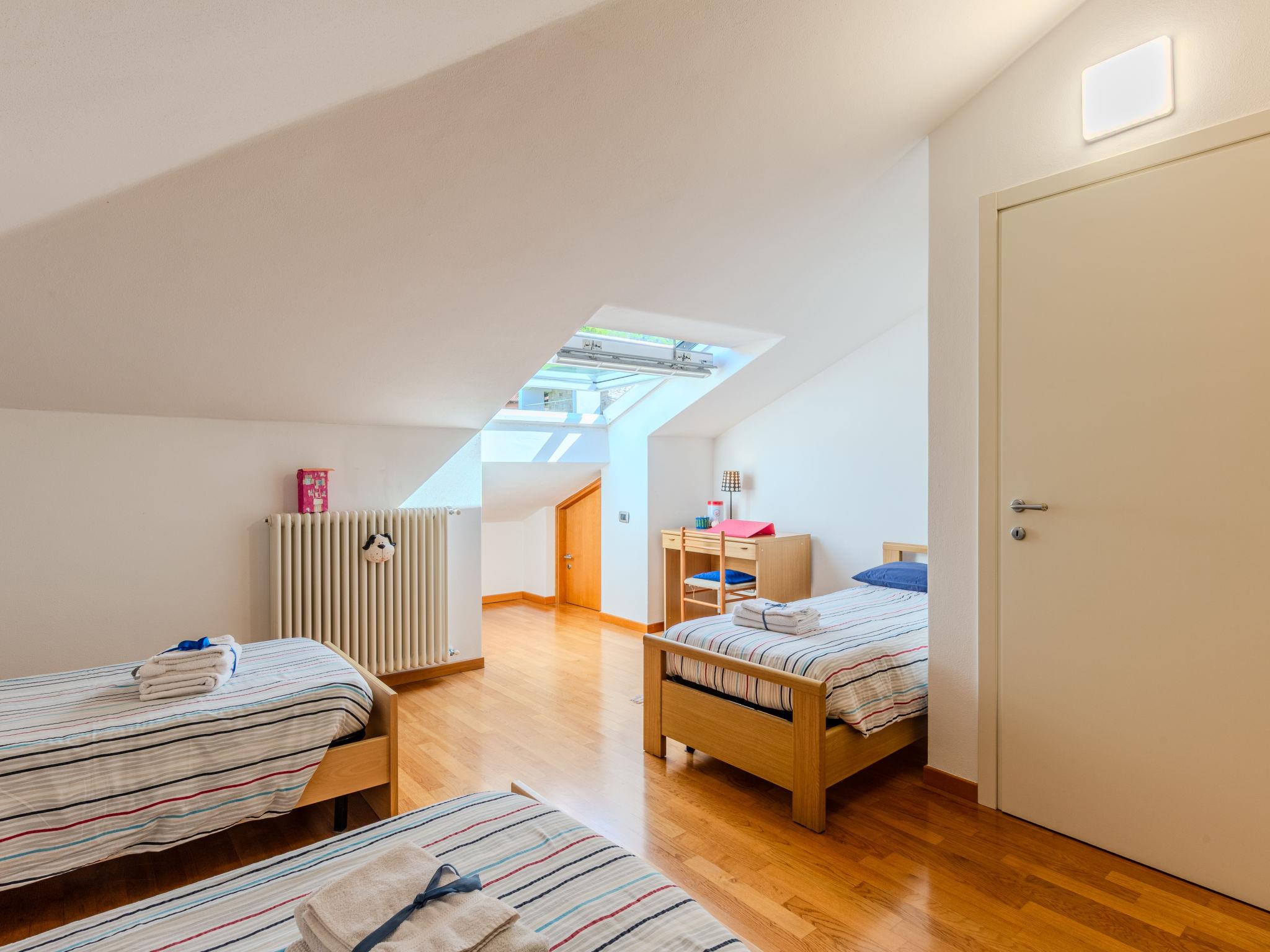 3-room semi-detached house 122 m2 on 2 levels. Tasteful and cosy furnishings: large living/dining room with dining table and TV. Exit to the balcony. Open kitchen (oven, dishwasher, 5 gas rings, toaster, kettle, microwave, electric coffee machine, Capsules for coffee machine (Nespresso) extra). Shower/bidet/WC. Upper floor: 1 room with 1 bed and 1 double bed. 1 room with 3 beds. Bath/bidet/WC. Gas heating, air-conditioning. Heating available only from 15.10. to 15.04. Parquet floors. Balcony. Balcony furniture, deck chairs. Beautiful view of the lake and the countryside. Facilities: washing machine, children's high chair, baby cot for up to 2 year olds, hair dryer. Internet (WiFi, free). Parking (1 car). Please note: non-smoking house. Maximum 1 small pet/ dog allowed. Smoke alarm, fire extinguisher. IT097023C25MCMUUXS