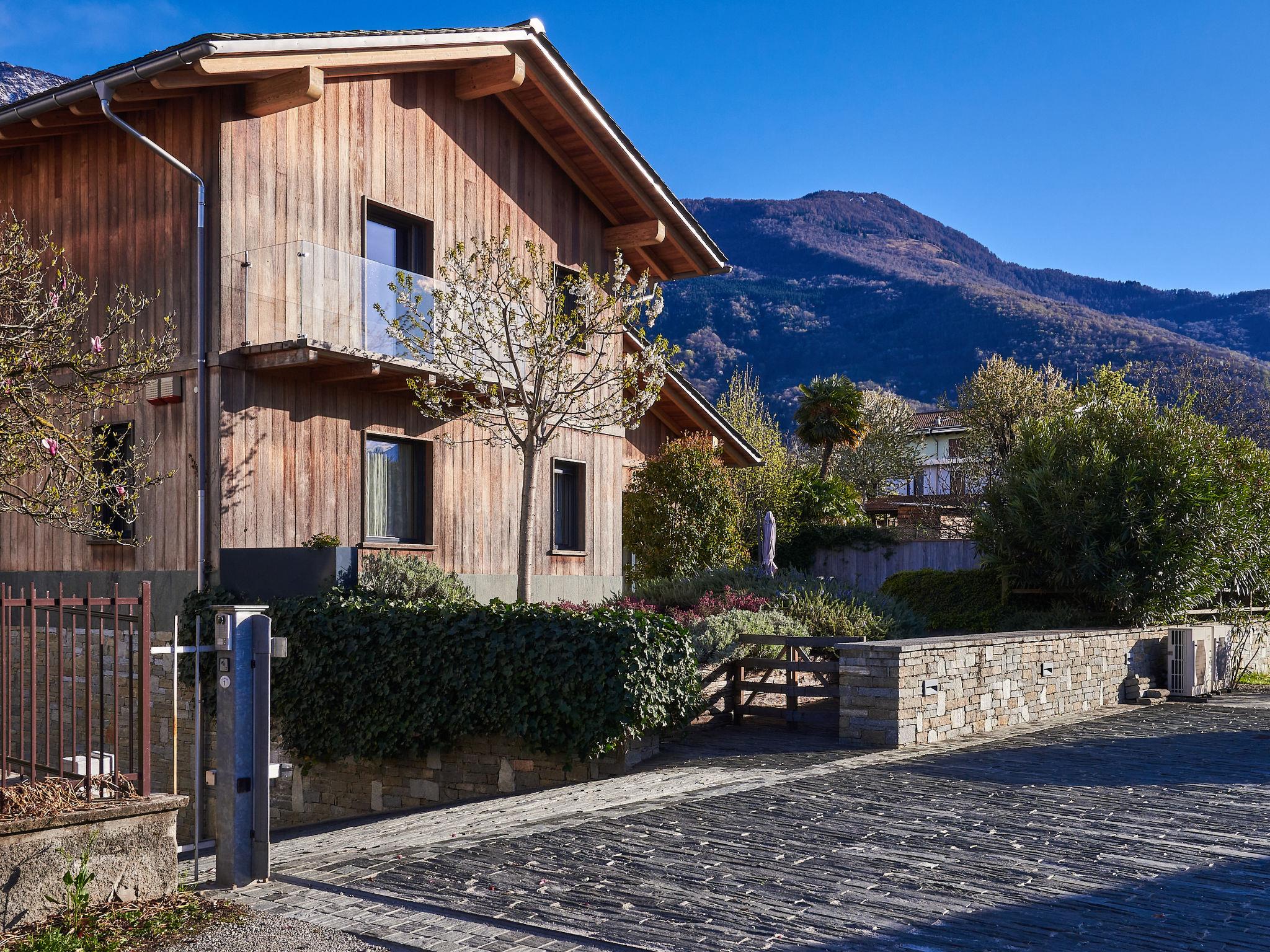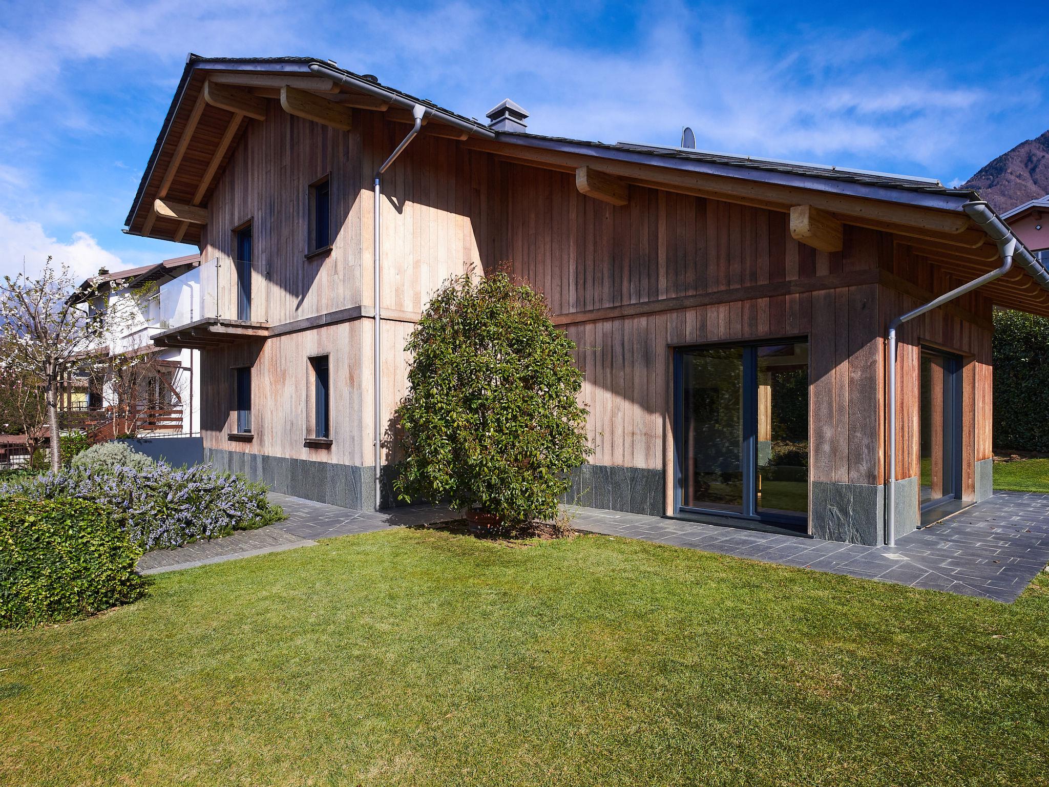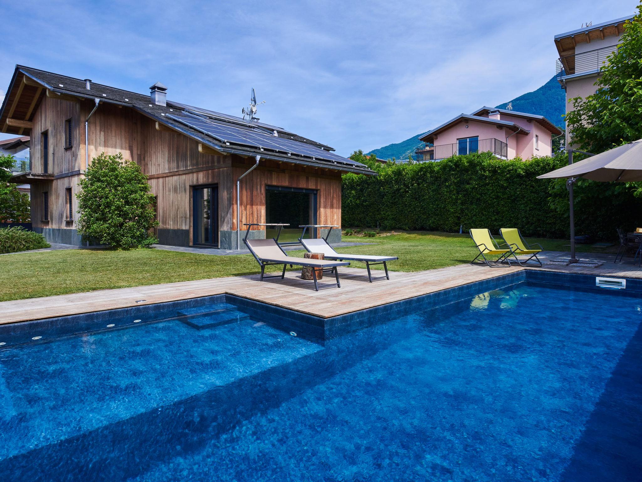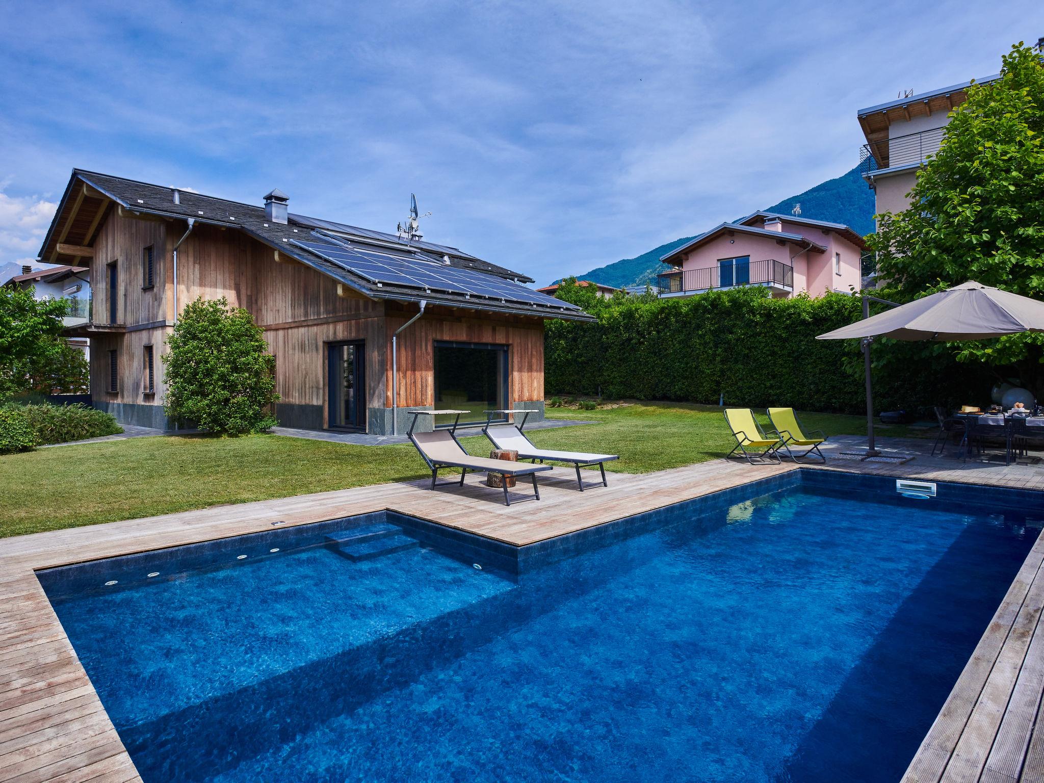 Large, modern villa "Woodhouse", 3 storeys. 650 m from the centre of Colico, 38 km from the centre of Lecco, 69 km from the centre of Como, 1.1 km from the lake, in a cul-de-sac. Private: property 500 m2 (fenced) with lawn, swimming pool angular (depth 150 cm, seasonal availability: 15.May. - 30.Sep.). In the house: fitness room, table football, storage room for bicycles. Parking (for 2 cars) on the premises, single garage. Supermarket, restaurant 650 m, bar 600 m, bus stop 350 m, railway station "Colico" 650 m, grass beach "Lido di Colico" 1.8 km. Golf course (18 hole) 37 km, surf school 1.4 km, riding stable 3.4 km, children's playground 600 m. Nearby attractions: Forte Montecchio Nord, Abbazia di Piona, Torri di Fontanedo. Well-known ski regions can easily be reached: Madesimo, Livigno. Well-known lakes can easily be reached: Lago di Mezzola. Hiking paths: Pian di Spagna, Monte Legnone. The owner does not accept any youth groups.