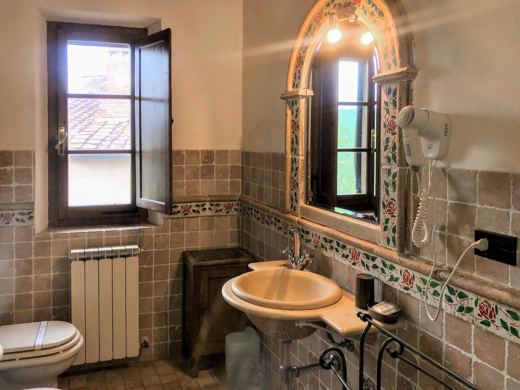 Very beautiful, cosy, comfortable country house "Antico Borgo San Lorenzo", from the 11st century, renovated in 1998, surrounded by meadows, fields and vineyards. 5 houses in the residence. 10 apartments in the residence. 4 km from the centre of Colle di Val d'Elsa, 14 km from the centre of San Gimignano, 24 km from the centre of Siena, in a secluded, sunny position on top of a hill, 70 km from the sea, 70 km from the beach, in the countryside. For shared use: property 5 ha, garden (not fenced) with plants and flowers, meadow, swimming pool (16 x 8 m, depth 140 - 150 cm, seasonal availability: 15.Apr. - 31.Oct.). Outdoor shower, table tennis, terrace, barbecue, children's playground. In the house: table football, washing machine, tumble dryer (for shared use, extra), bicycle rental. 1.2 km long motor access (via unmade road). Roofed, parking on the premises. Grocery 4 km, supermarket 4 km, bakery 3 km, bus stop 1.5 km, railway station "Colle di Val d'Elsa" 4 km, sandy beach "Cecina Mare" 70 km, indoor swimming pool 6 km. Walking paths from the house 100 m. Nearby attractions: Monteriggioni 12 km, Certaldo 25 km, Volterra 32 km, Firenze 60 km, Montalcino 66 km. Please note: car recommended. Suitable for families, baby equipment (included). Suitable for events. On request: airport transfer to the holiday accommodation. Local sale of farm products. All houses/apartments are individually designed/furnished.