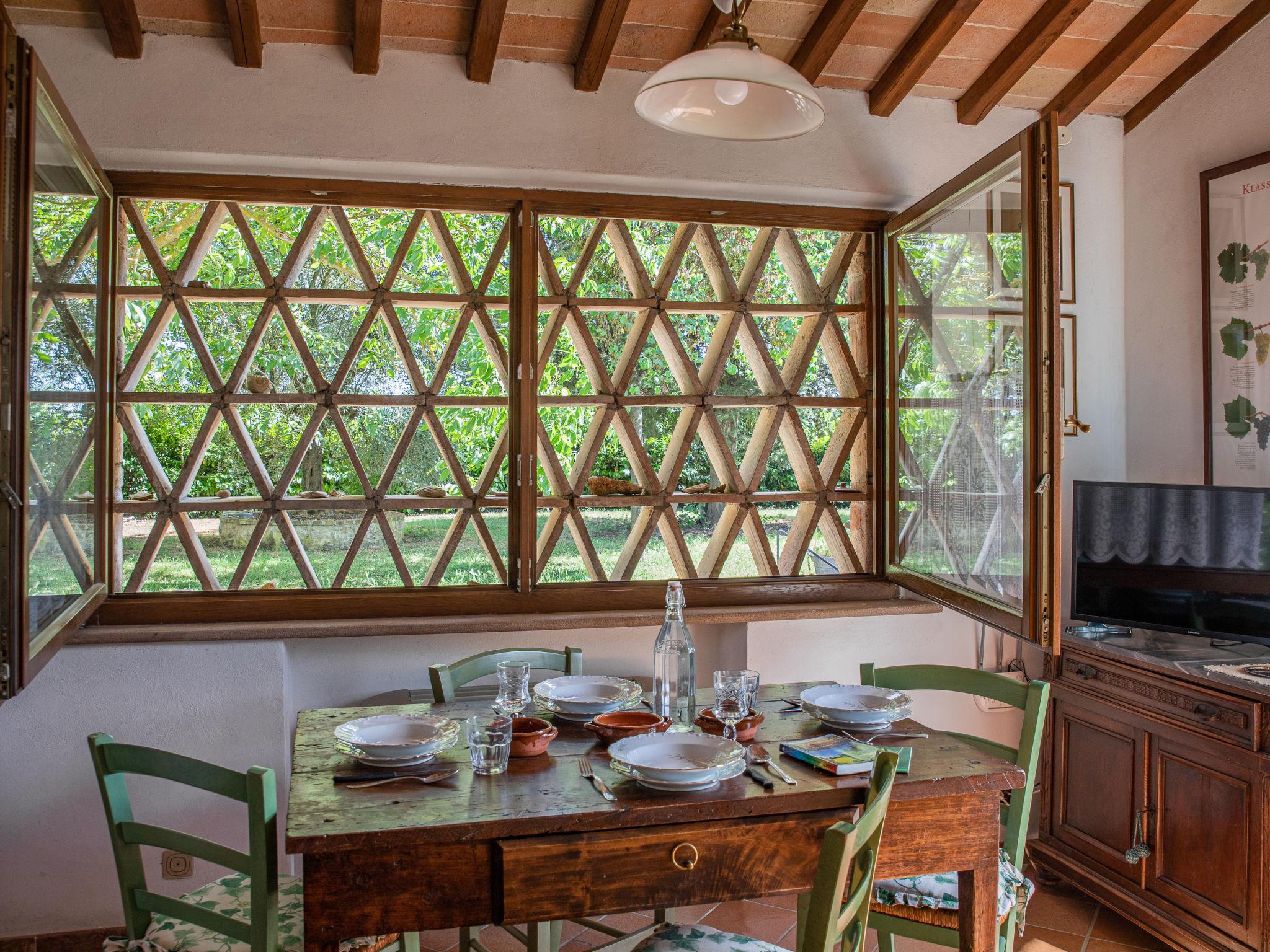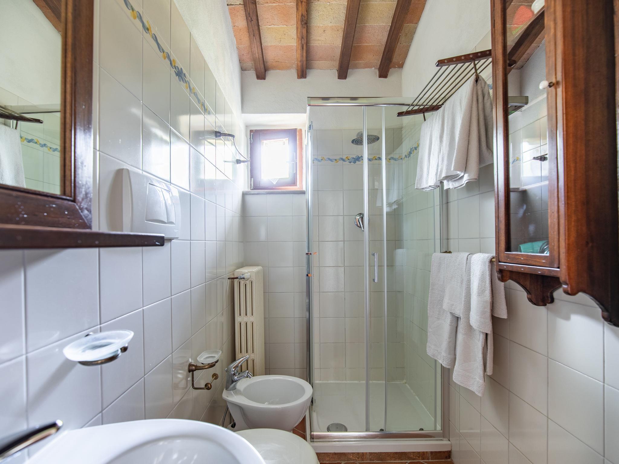 Campiglia 4 km from Colle di Val d'Elsa: Cosy country house "Podere Fontemaggio", surrounded by trees and fields. 2 houses in the residence. 4 apartments in the residence. In the district of Campiglia (700 m) 4 km from the centre of Colle di Val d'Elsa, 13 km from the centre of San Gimignano, outside the resort, 33 km from the centre of Siena. For shared use: property 3 ha, garden with plants and trees, orchard, swimming pool (16 x 6 m, depth 140 cm, seasonal availability: 25.Apr. - 17.Oct.) with salt-electrolysis pool-cleaning system. Shower/WC in the pool area, outdoor shower, terrace, barbecue. In the house: washing machine, tumble dryer (for shared use). 400 m long motor access (via unmade road). Parking on the premises. Grocery 700 m, supermarket 4 km, restaurant 4 km, bus stop 700 m, railway station "Colle di Val d'Elsa" 4 km, park "Cecina Mare" 60 km, outdoor swimming pool 4 km, indoor swimming pool 4 km. Local sale of farm products. Please note: residence with electric gates. The owner lives on the same property.