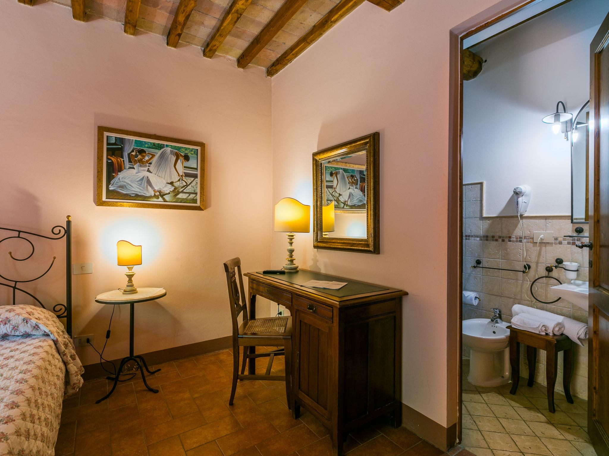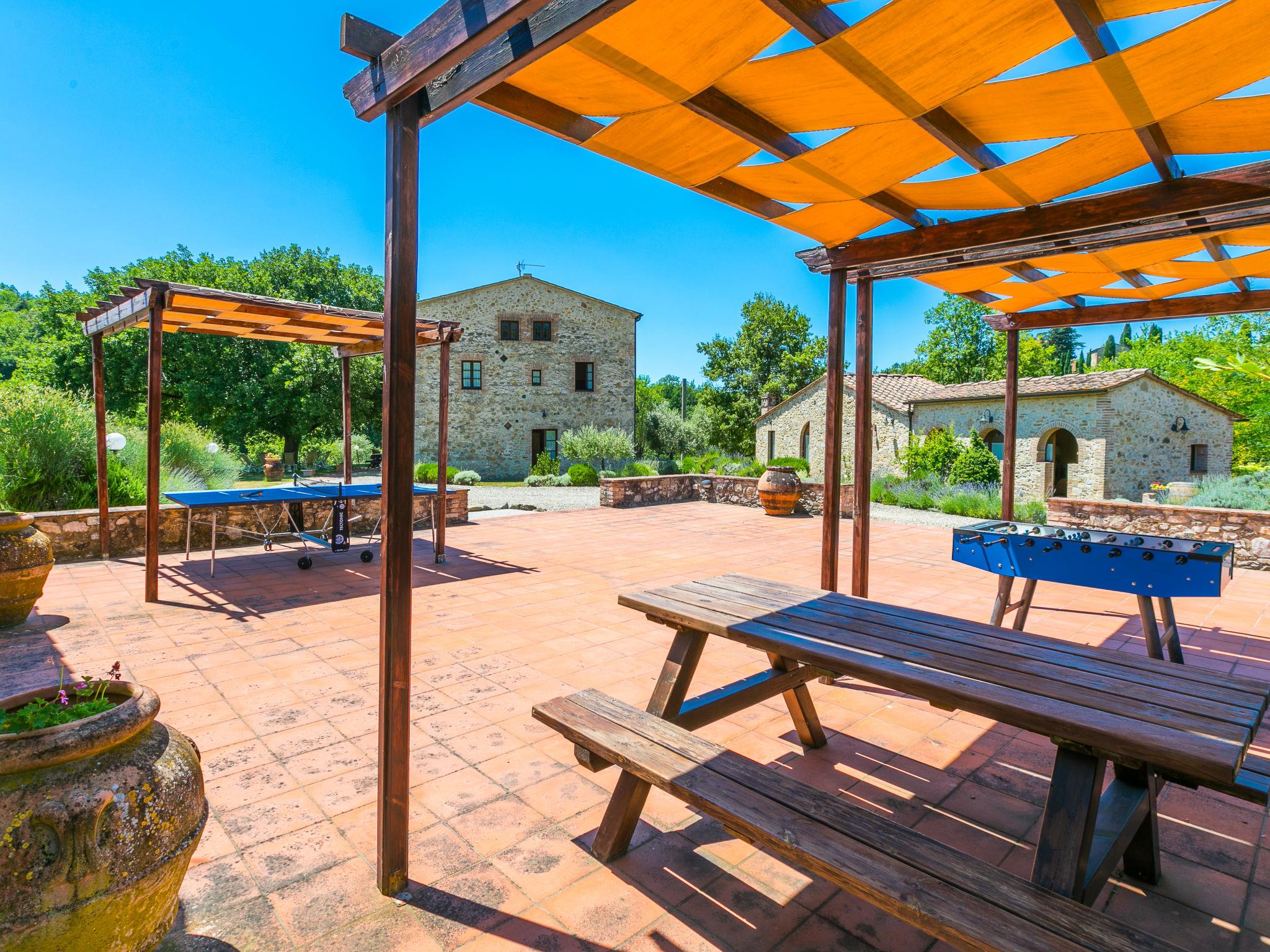 Colle di Val d'Elsa: Large, comfortable cottage "Podere San Giuseppe", surrounded by trees. Property composed of main house and outbuilding 7 km from the centre of Colle di Val d'Elsa, in a secluded, sunny position, 100 m from the edge of the forest, in the countryside. Private: natural state property, garden, swimming pool fenced (6 x 12 m, seasonal availability: 15.May. - 30.Sep.). Outdoor shower, pool house, table tennis, patio, terrace, garden furniture, barbecue, pool maintenance by the owner/gardener. In the house: central heating system, air conditioning. 1 km long bumpy motor access. Parking at the house on the premises. Bus stop "Colle di Val d'Elsa" 7 km. Please note: car recommended. Baby equipment (included). Groups of teenagers on request only. Suitable for events.