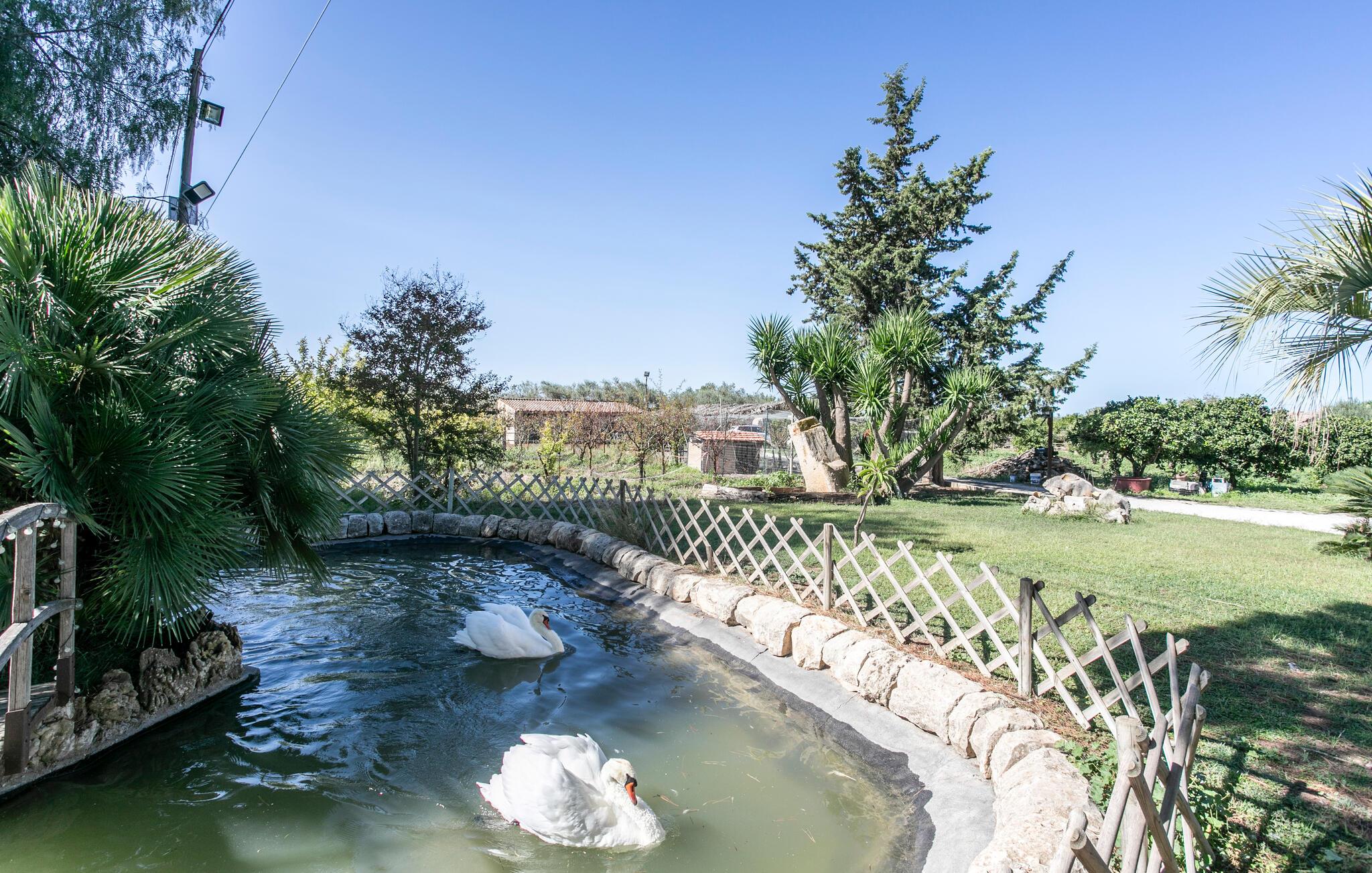 På utsiden kan du nyte husets utmerkede beliggenhet, som lar deg nyte utsikten over det fortryllende landskapet. Nyt solen i den velstelte hagen og ta deg en dukkert i bassenget etter eget ønske. Eieren holder forskjellige dyr i innhegninger ikke langt fra huset, blant annet svaner, hester og påfugler, som du kan besøke.