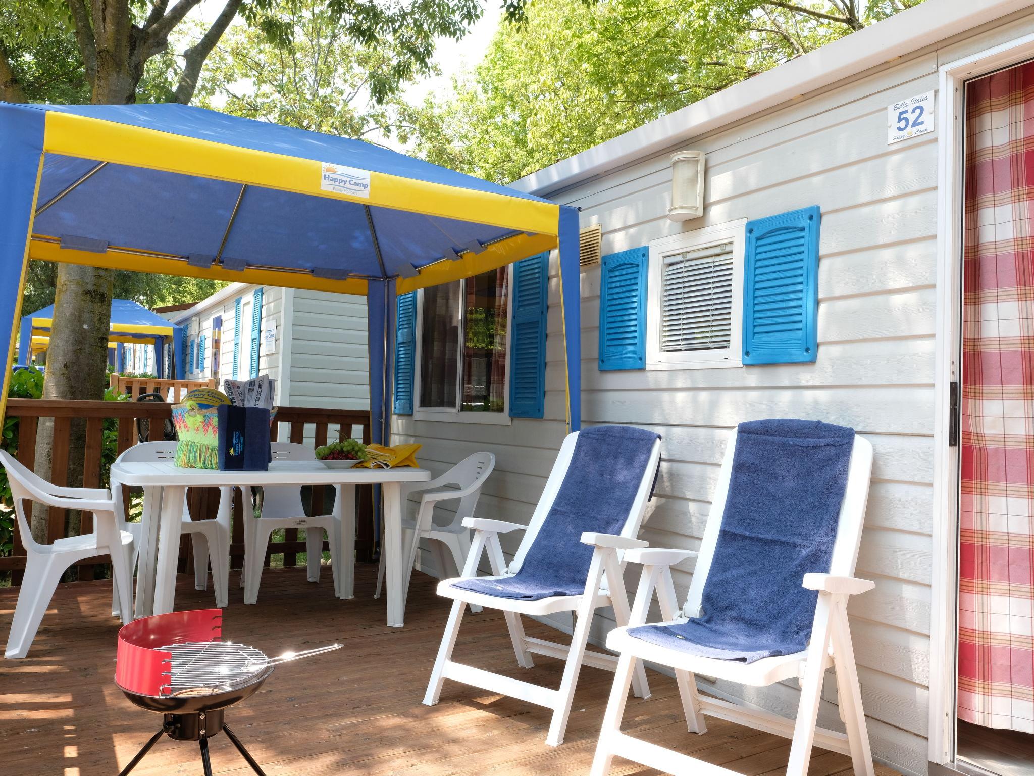 "Happy Easy", 3-room mobile home 25 m2. Practical furnishings: living/dining room with electric heating and air conditioning. 1 room with 1 french bed (140 cm, length 190 cm). 1 room with 2 beds (70 cm, length 190 cm), 1 x 1 bunk beds (65 cm, length 179 cm). Open kitchen (4 hot plates). Shower/WC. Air-conditioning (extra). Terrace. Terrace furniture, electric barbecue (portable), deck chairs (2). Facilities: mosquito net. Parking (1 car). Please note: non-smokers only. Maximum 1 small pet/ dog allowed. IT078157B3EHP2IRPJ
