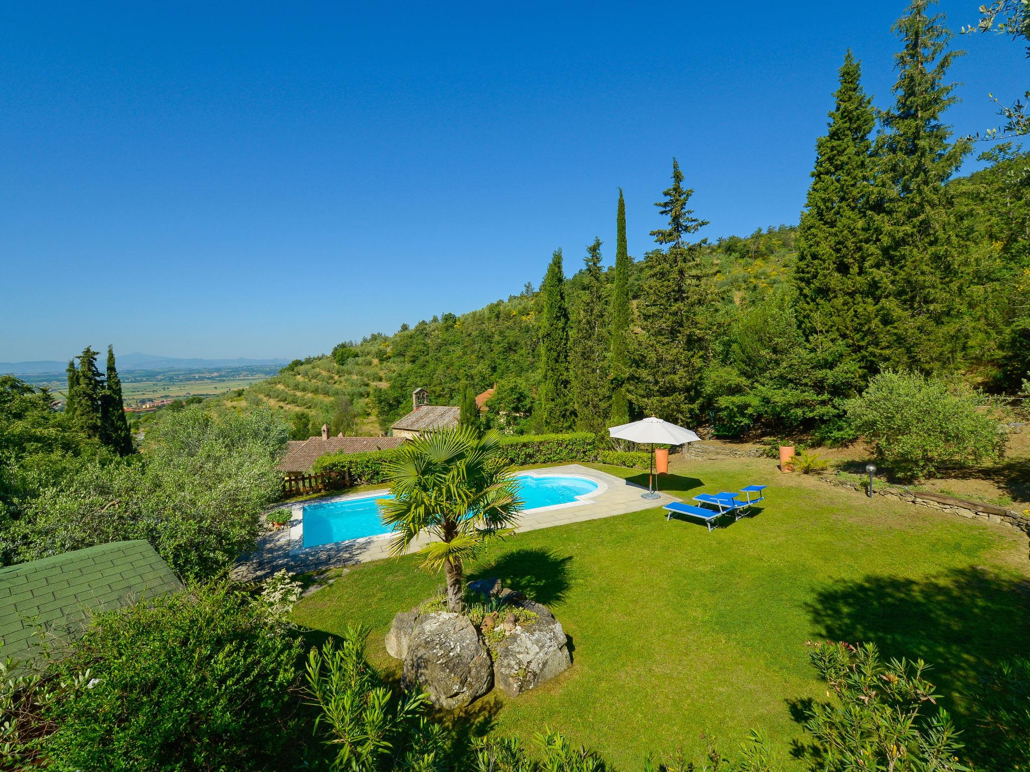 Beautiful, comfortable country house "Il Farinaio", 280 m a.s.l., detached, surrounded by trees. 9 km from the centre of Cortona, 2 km from the centre of Terontola, 7 km from the lake. Private: property 3 ha, garden 1 ha (fenced), swimming pool (10 x 4 m, depth 150 cm, seasonal availability: 15.May. - 30.Sep.) with internal staircase. Outdoor shower, table tennis, patio, pergola, garden furniture, barbecue, children's playground. In the house: heating available only from 15.Oct. - 15.Apr. (extra). Available: bicycles (4). House maid on request (extra). Cook on request (extra). Motor access (1 km via unmade road). Parking. Grocery 2 km, supermarket 2 km, restaurant 2 km, railway station "Terontola" 3 km, thermal baths "Chianciano" 37 km, bathing lake "Trasimeno" 7 km. Nearby attractions: Castiglione Del Lago 13 km, Passignano sul Trasimeno 16 km, Panicale 25 km, Montepulciano 30 km, Arezzo 35 km, Perugia 41 km. Please note: car recommended. Residence with electric gates.