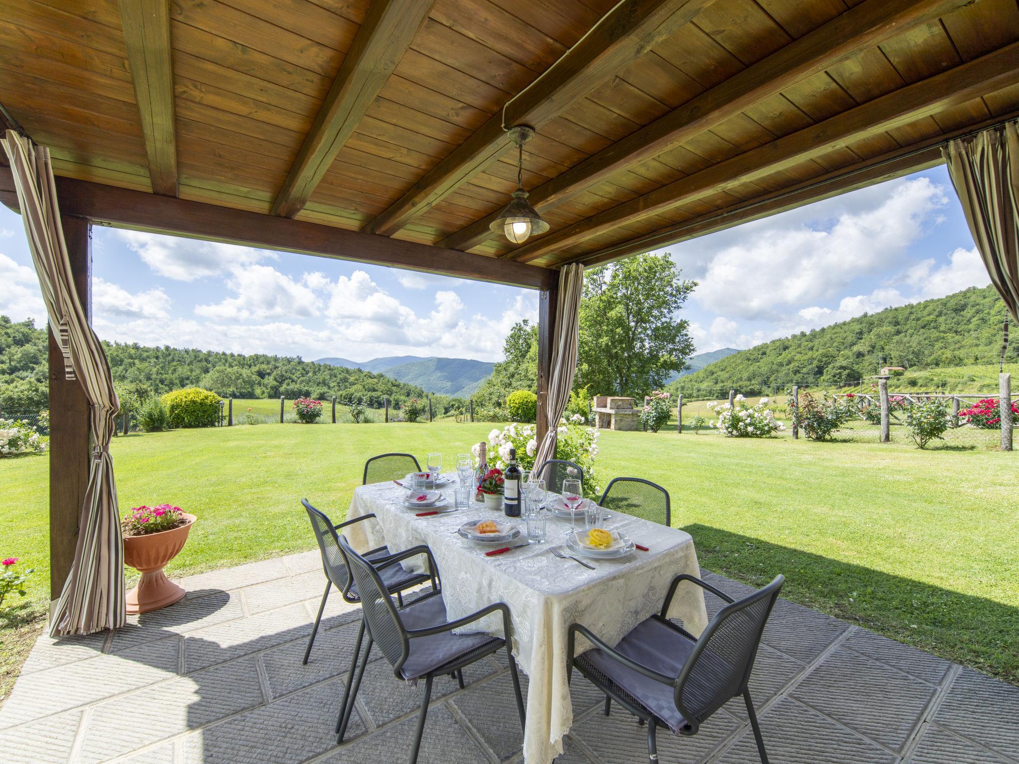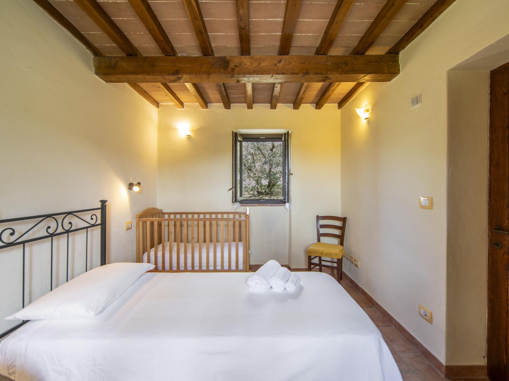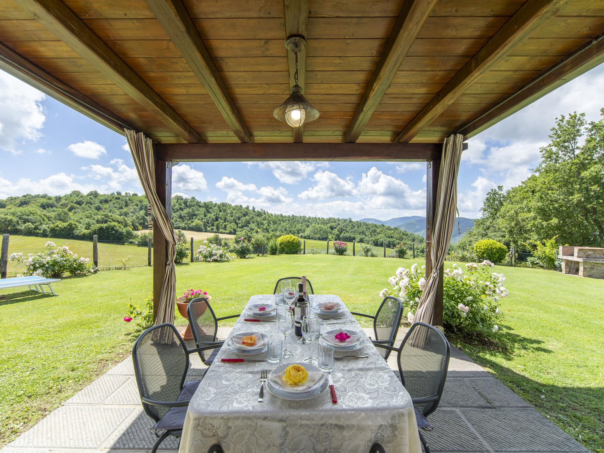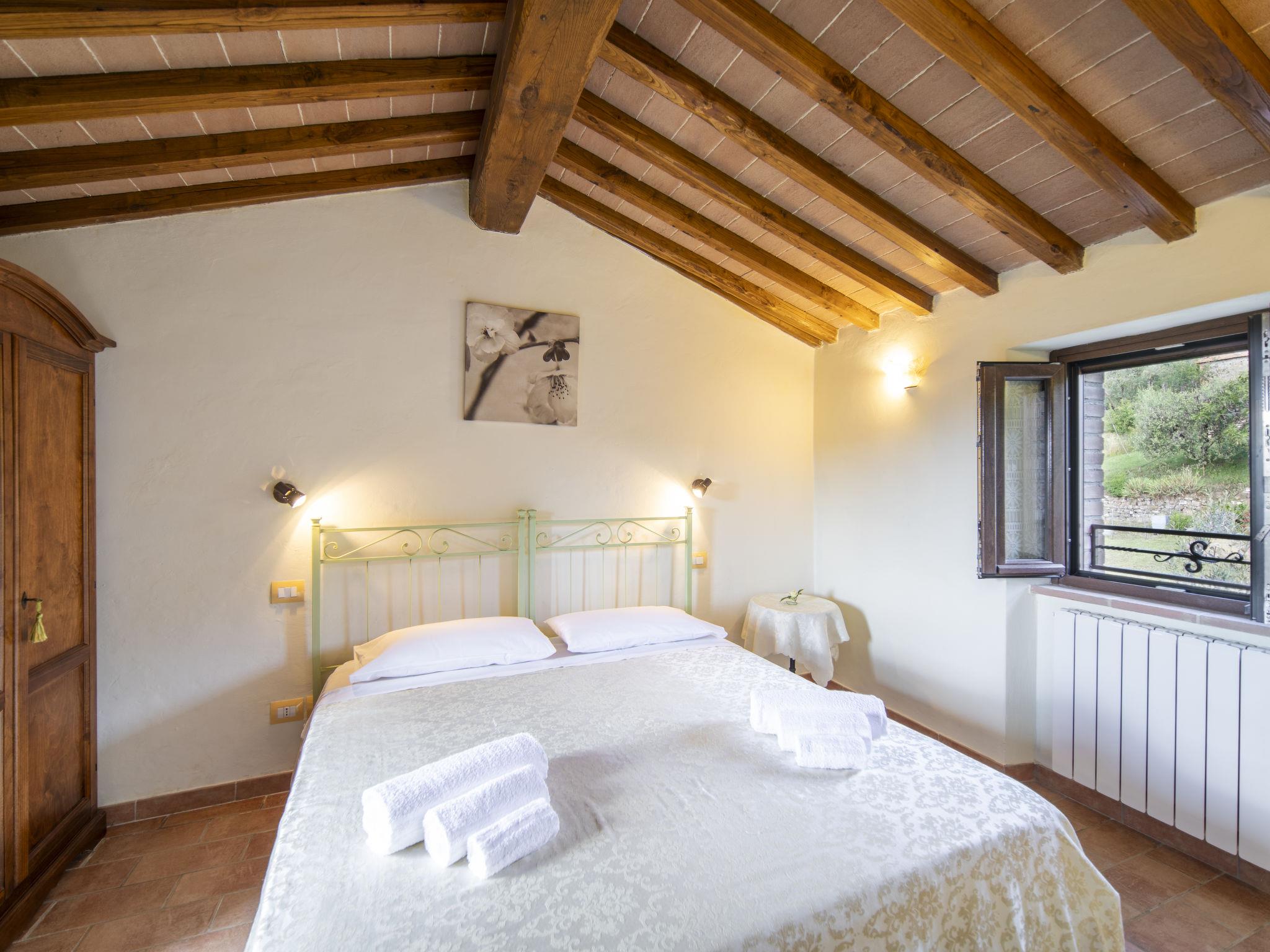 Rustic, comfortable country house "La Dama", 700 m a.s.l., detached, surrounded by trees and fields. 20 km from the centre of Cortona, in a secluded position, 35 km from the lake. Private: garden 1'400 m2, swimming pool (5 x 10 m, depth 120 - 150 cm, seasonal availability: 01.May. - 15.Oct.). Outdoor shower, patio, garden furniture, barbecue, children's playground. Motor access (1.6 km via unmade road). Roofed, parking on the premises. Supermarket 18 km, restaurant 2 km, railway station "Camucia" 25 km, bathing lake "Trasimeno" 35 km. Nearby attractions: Castiglion Fiorentino 30 km, Tuoro Sul Trasimeno 36 km, Arezzo 50 km, Gubbio 50 km. Please note: car recommended. The owner does not accept any youth groups. The tap water has no drinking water quality.