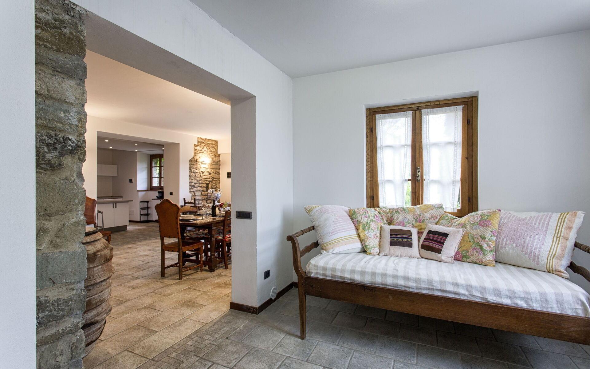 Wenn Sie die Treppe in den ersten Stock hinaufgehen, finden Sie ein großes Wohnzimmer mit Kamin und Zugang zur Außenterrasse mit Blick auf das Tal, die mit Tischen ausgestattet ist. Im Wohnzimmer gibt es auch ein Schlafsofa (auf Anfrage).