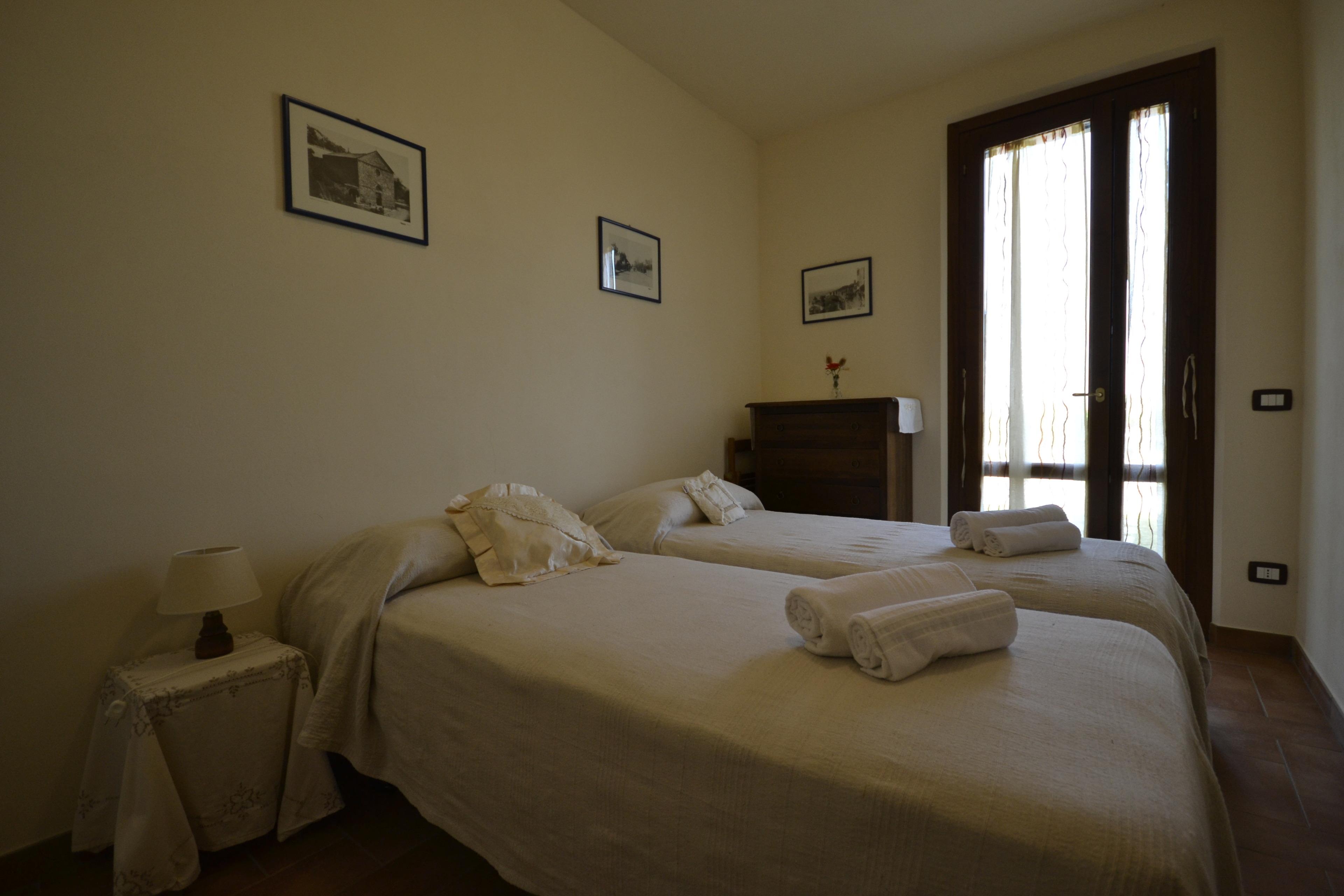 Über eine Treppe gelangt man zu den beiden anderen Schlafzimmern: das erste mit zwei Einzelbetten und direktem Zugang zum Gartenteil, in dem sich der Swimmingpool befindet, und das zweite mit einem Doppelbett.