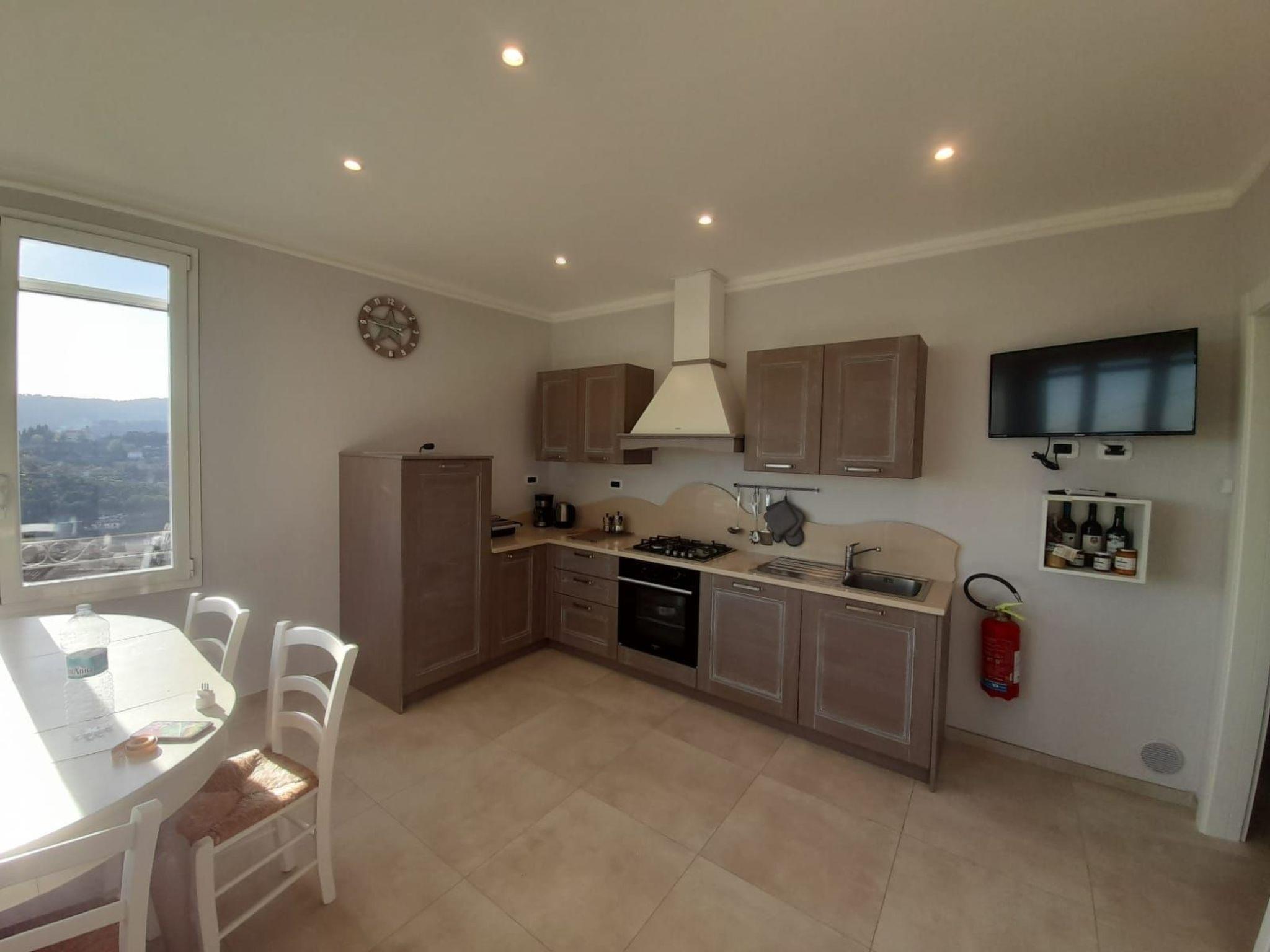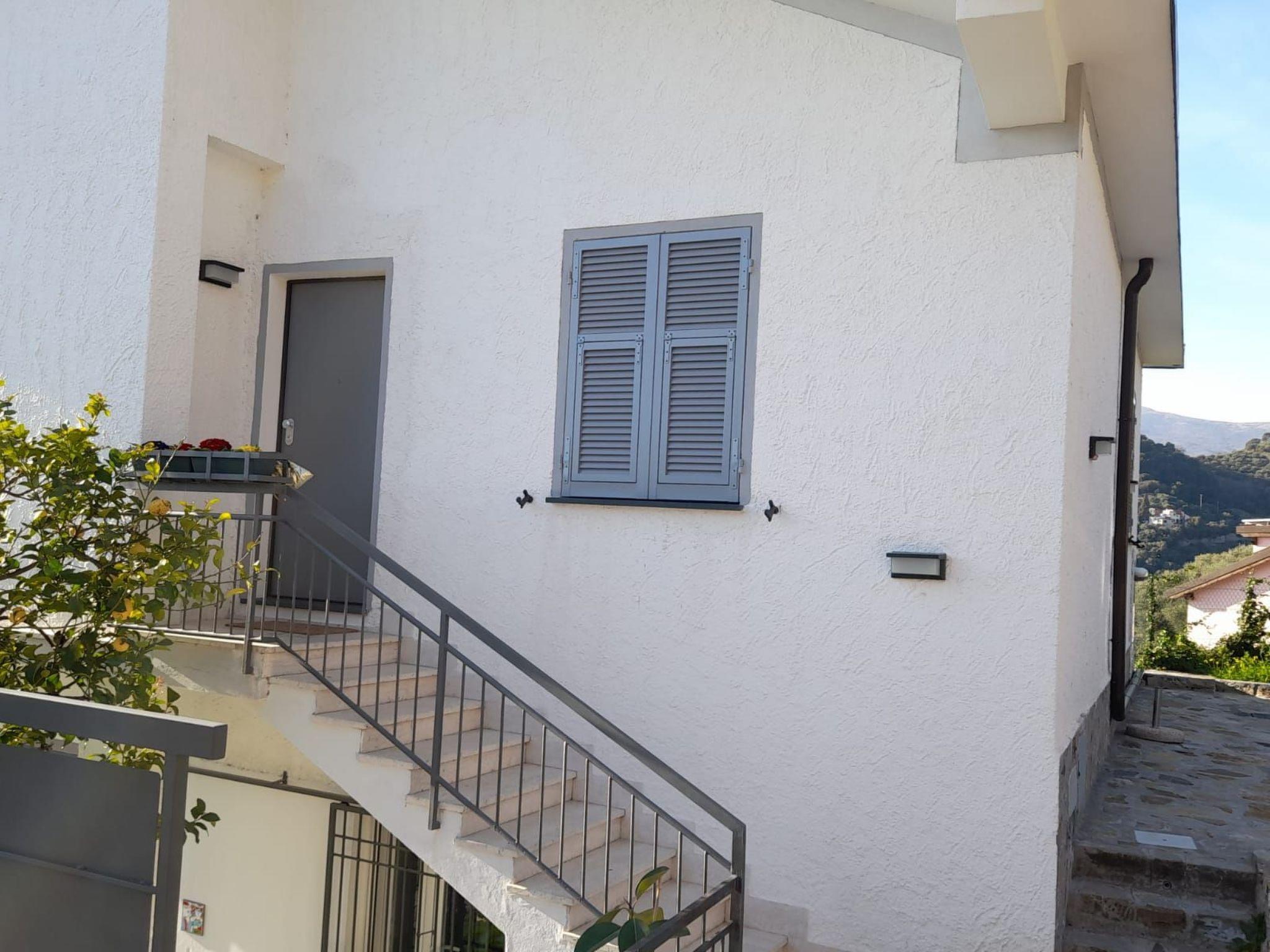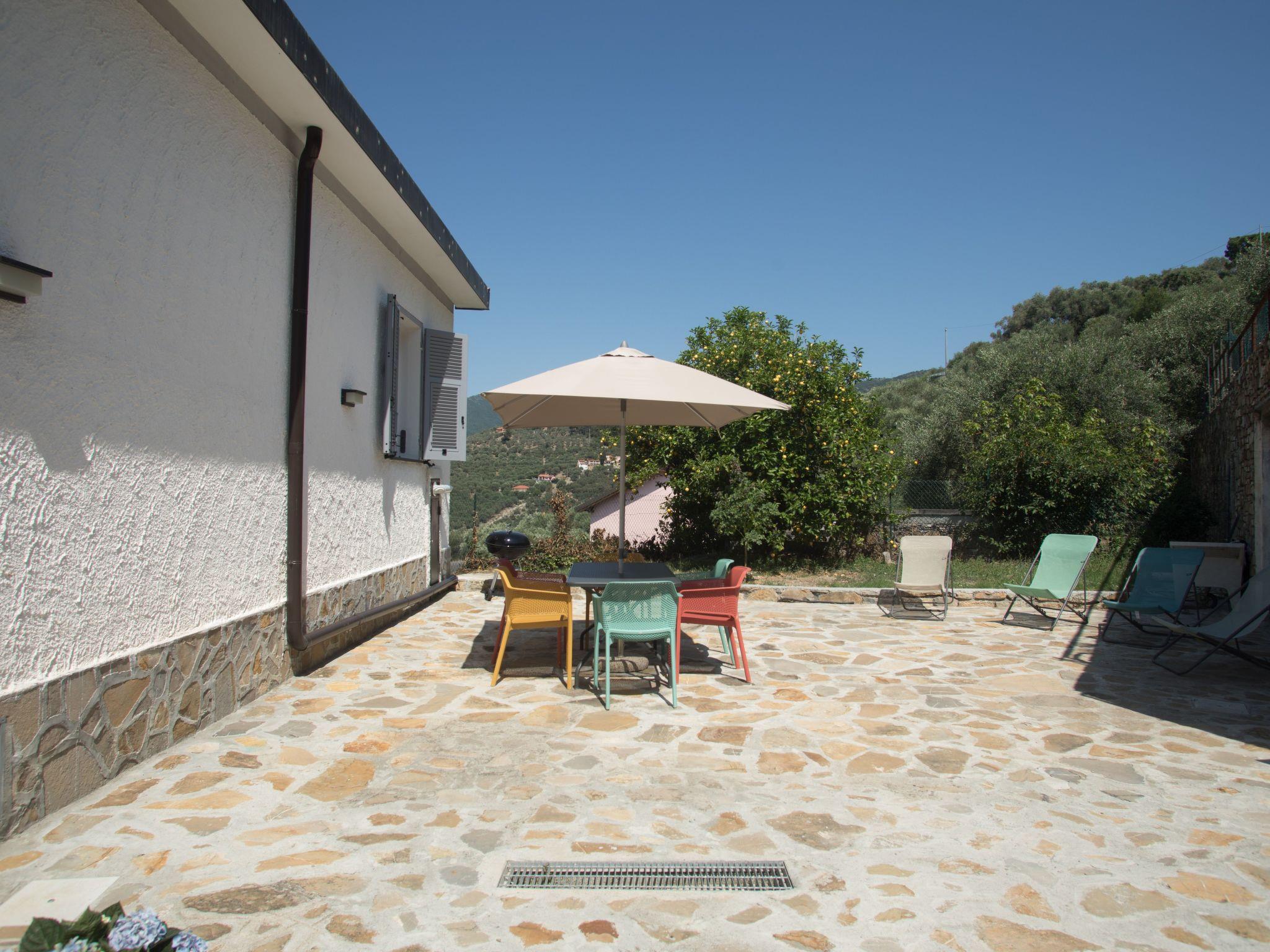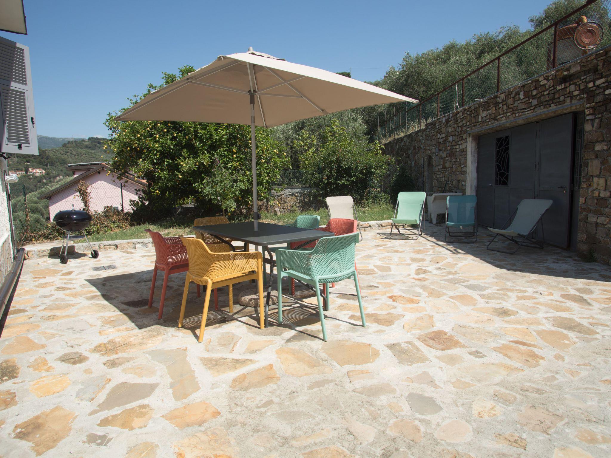 Outside, the private garden, equipped with a table for outdoor dining, deckchairs, parasol and barbecue, invites guests to enjoy moments of pure relaxation under the Ligurian sun. Adjacent to the flat and reserved exclusively for guests, this green space is perfect for enjoying the peace of the countryside, accompanied by the whispering of the olive groves that frame the entire property.