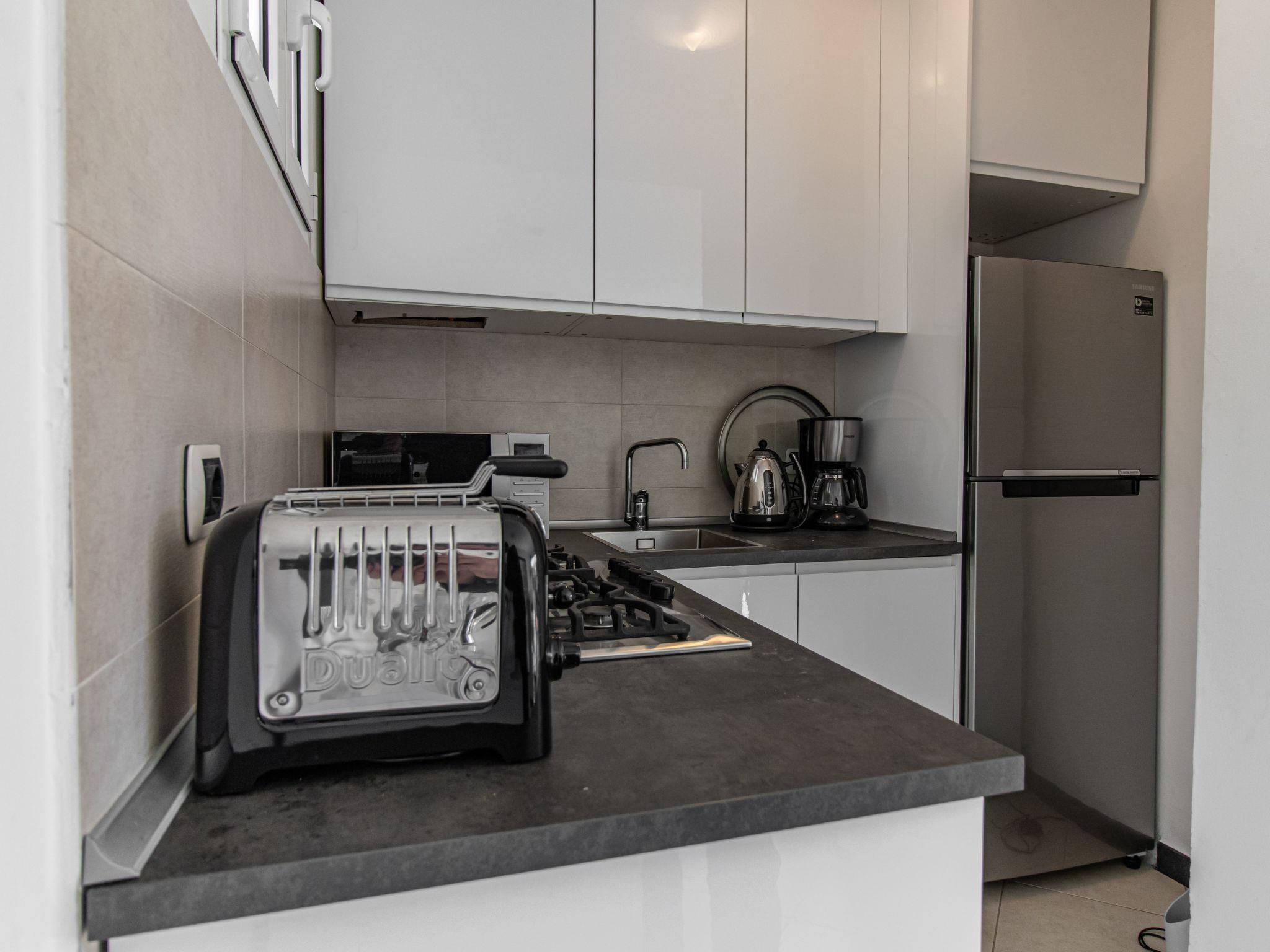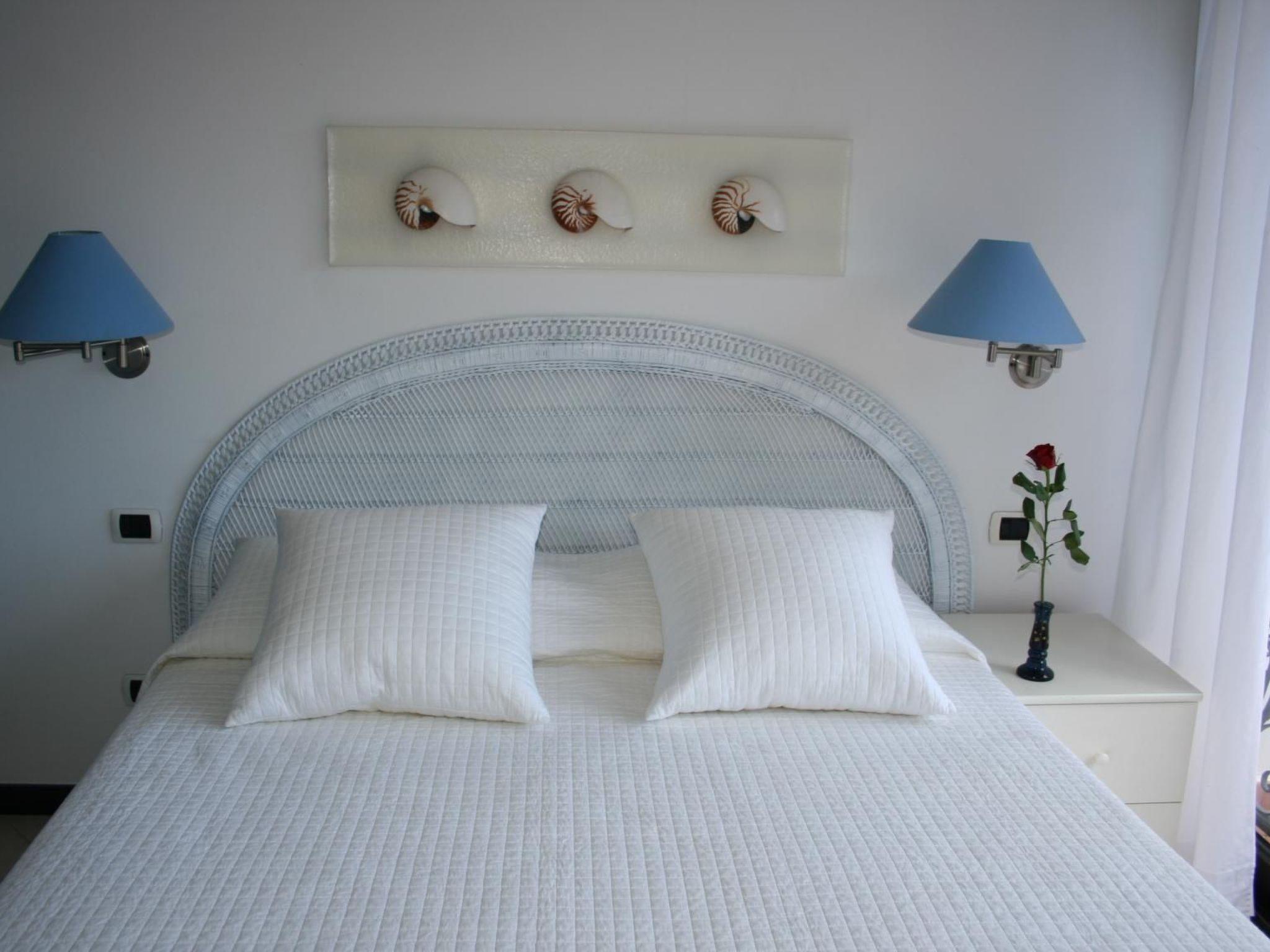 The entrance leads to the bathroom with shower and bidet, the bedroom with a double bed (1.60 m wide) and the kitchen-living room. The kitchenette is fully equipped and the living area has a sofa bed for two persons (2 x 80 cm mattresses). The flat is very well furnished and offers a wonderful sea view.