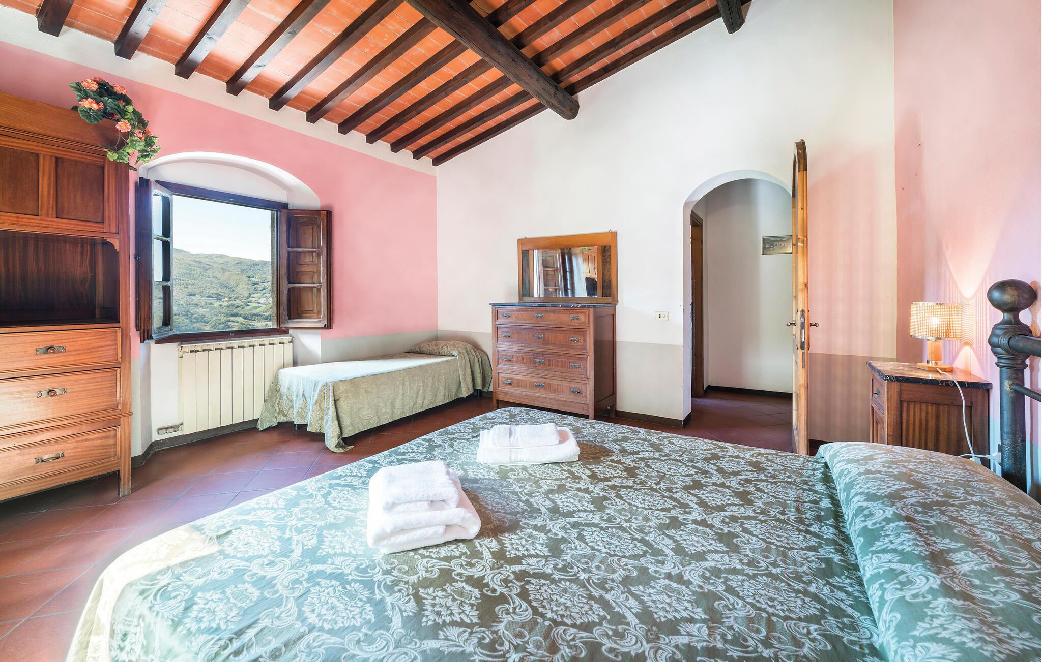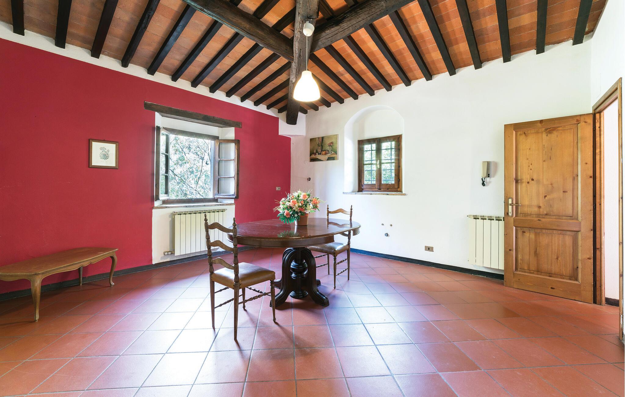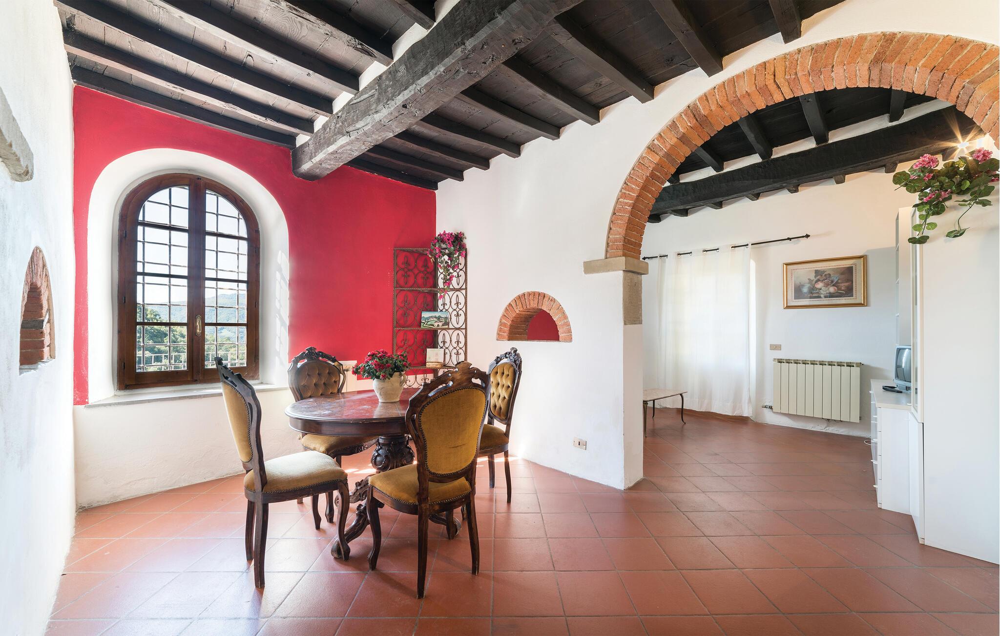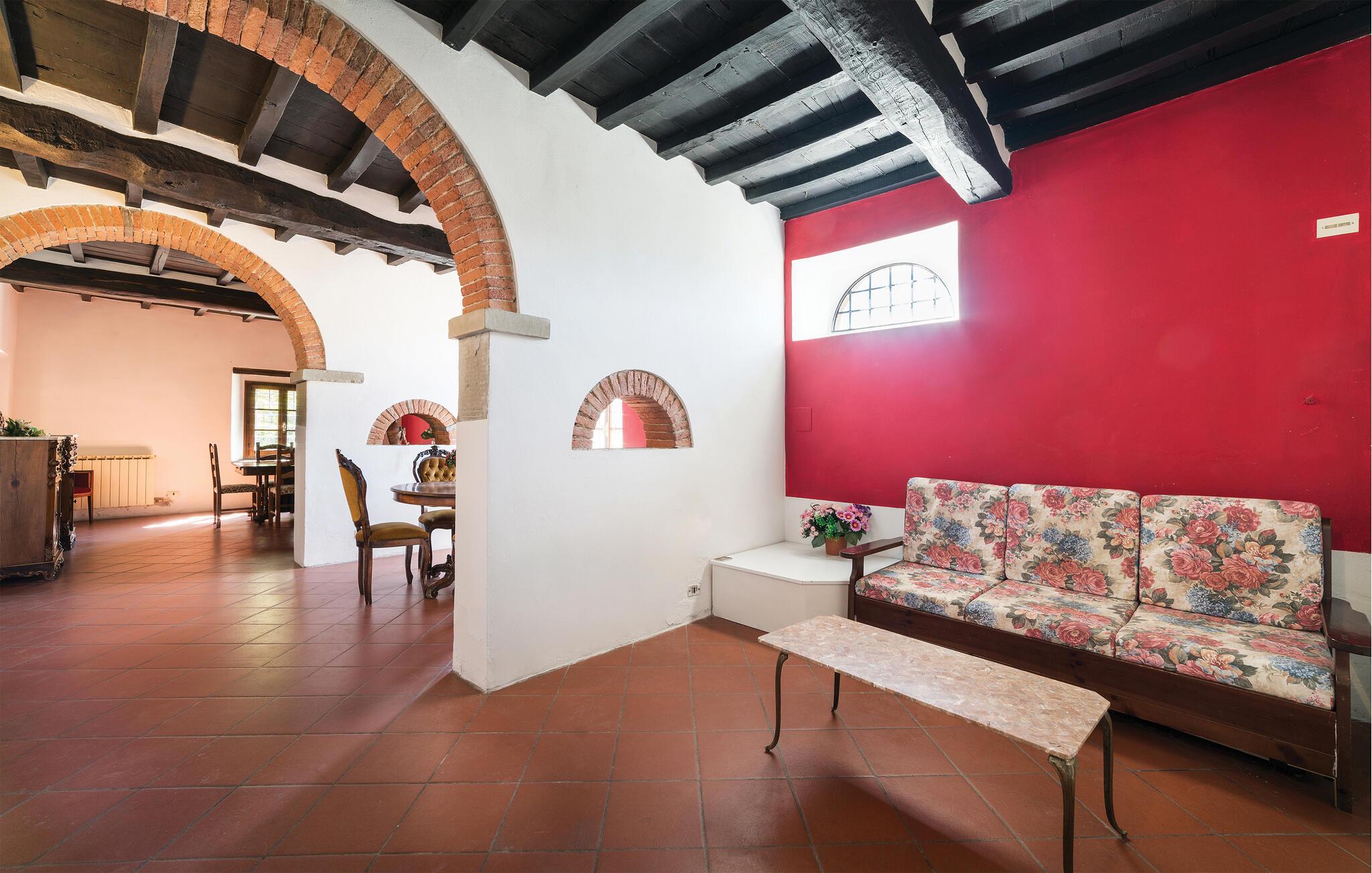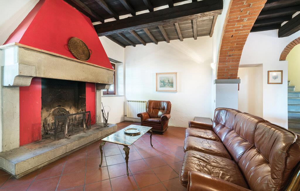 Denne store og fargerike villaen i Dicomano, omgitt av bølgende åser og frodige grøntområder, gir deg muligheten til å komme deg bort fra alt. Nyt komforten og roen i dette autentiske landstedet, samtidig som du kan dra nytte av moderne fasiliteter. Feriehuset er kjærlig innredet og innbyr til å bli værende. Den romslige stuen med tradisjonelle trebjelker, runde buer og terrakottagulv skaper en varm atmosfære. Bruk den åpne peisen til å tilbringe koselige kvelder, eller lag deilige retter med regionale ingredienser på det åpne kjøkkenet. Spisestuen har god plass til felles måltider, der du kan skape uforglemmelige øyeblikk med familie eller venner.
