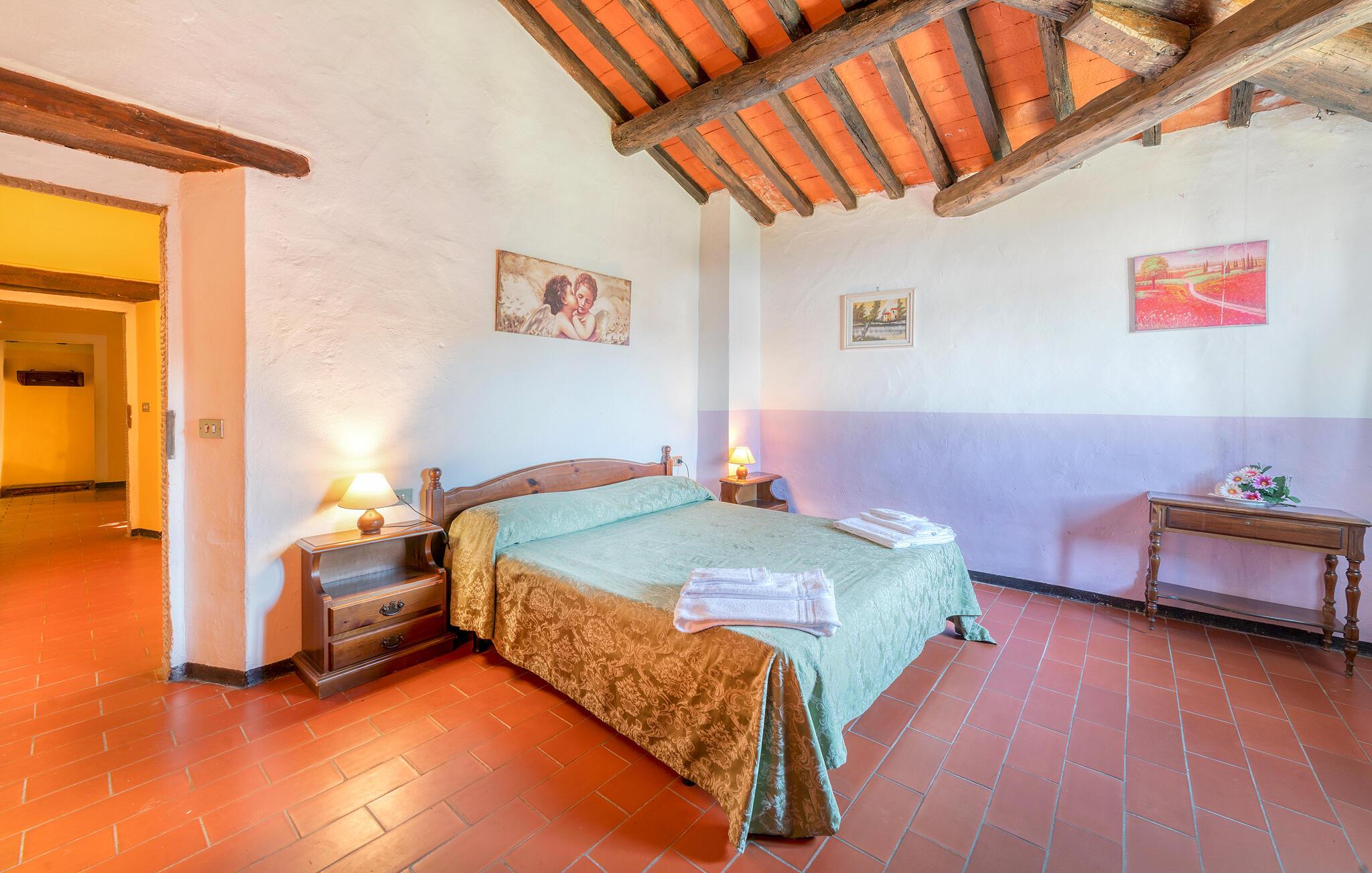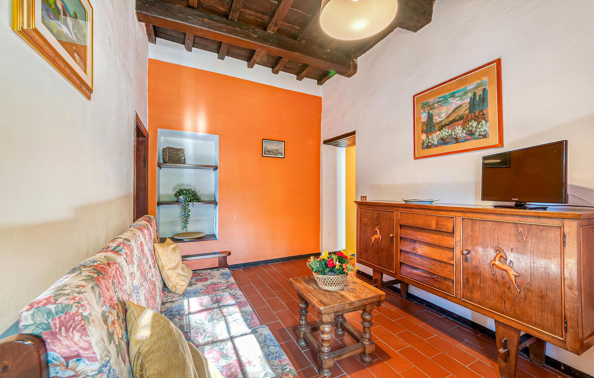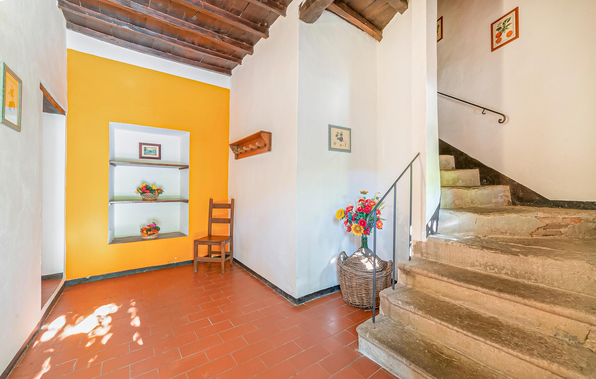 Dette sjarmerende og fargerike feriehuset i Dicomano, omgitt av bølgende åser og frodige grøntområder, gir deg muligheten til å komme deg bort fra alt. Nyt komforten og roen i dette autentiske landstedet, samtidig som du kan dra nytte av moderne bekvemmeligheter. Feriehuset er kjærlig innredet og innbyr til å bli værende. Den romslige stuen med tradisjonelle trebjelker og terrakottagulv skaper en varm atmosfære. Bruk den åpne peisen til å tilbringe koselige kvelder, eller lag deilige retter med regionale ingredienser på det åpne kjøkkenet. Spisekjøkkenet har god plass til felles måltider, der du kan skape uforglemmelige øyeblikk med familie eller venner.