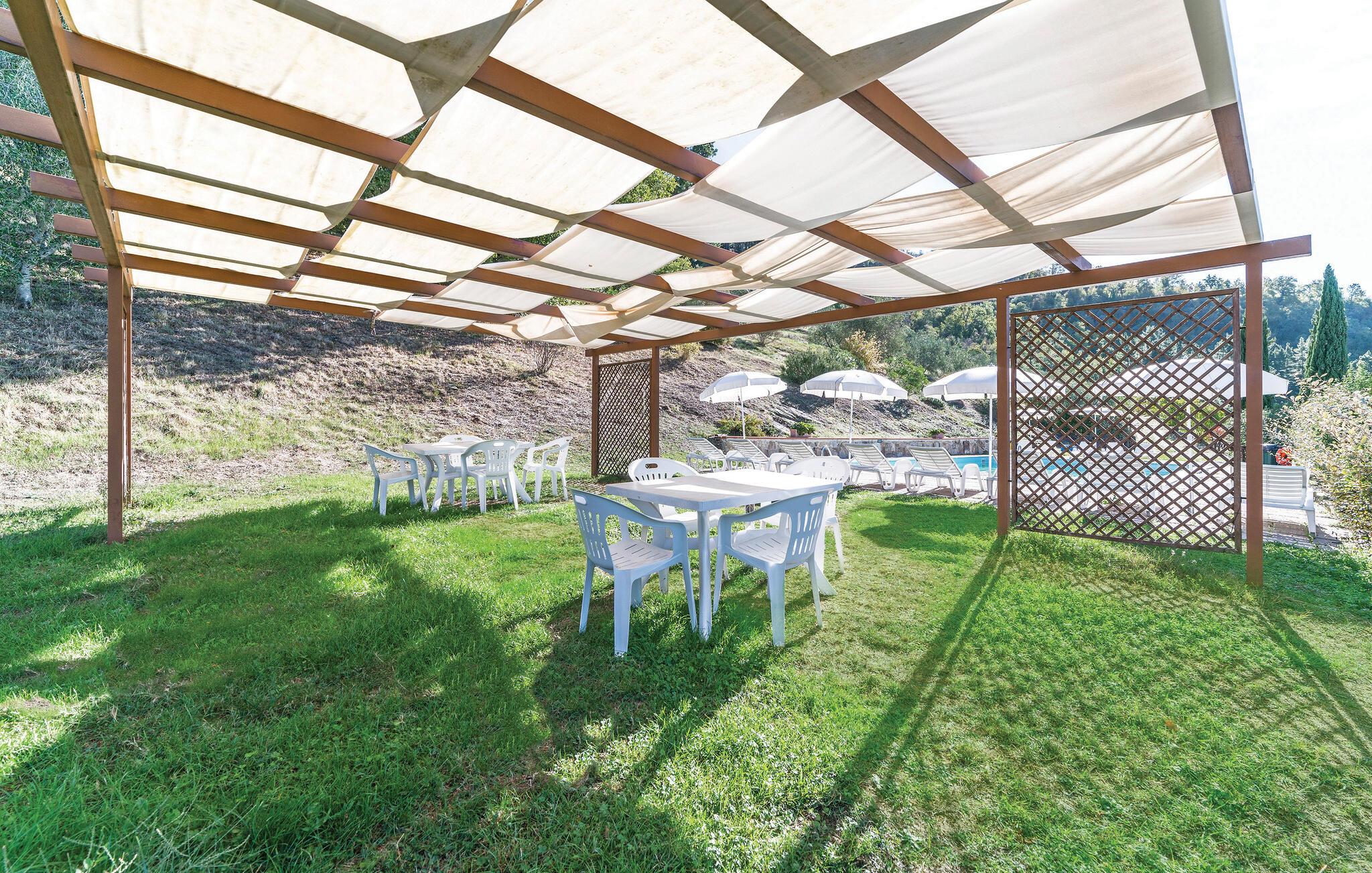 Uteområdet er et sant paradis. Slapp av ved det store fellesbassenget med solsenger og parasoller, eller nyt en piknik på den grønne plenen. For de yngste er det en huske og en sklie samt god plass til å leke. Benytt terrassen til uteservering og beundre den fantastiske utsikten over landskapet.