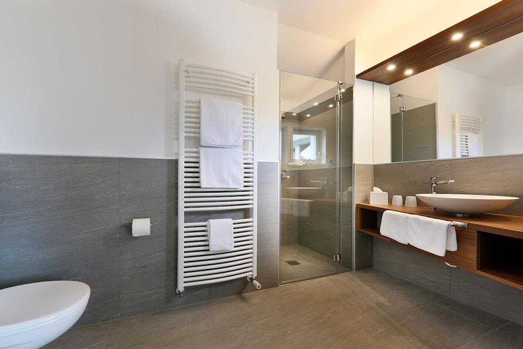 Ferieleiligheten har to separate dobbeltrom, hvert med eget bad, og et fullt utstyrt kjøkken. Badene har dusj, toalett og bidet, og ett har også badekar, hårføner og sminkespeil. Den romslige stuen med en komfortabel sofa har flatskjerm-TV, Wi-Fi og telefon. Klimaanlegg, drevet av vårt solcelleanlegg, regulerer oppvarming og kjøling, noe som sikrer et spesielt behagelig inneklima. Et oppvarmet svømmebassengkompleks med panoramautsikt og en toetasjes plen for soling, samt en grustennisbane, treningsrom og badstueområde, forbedrer ytterligere ditt velvære på vårt feriested.