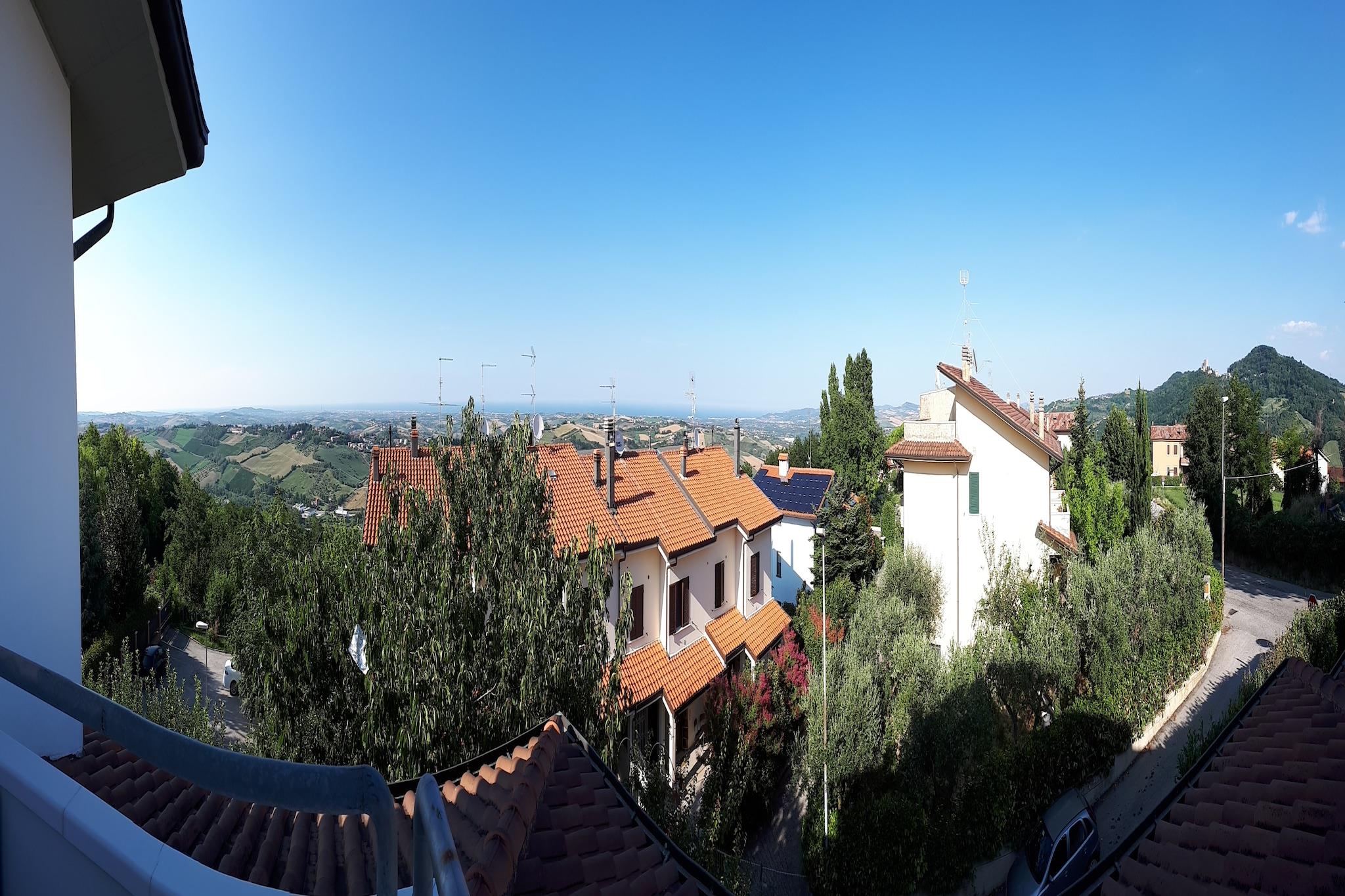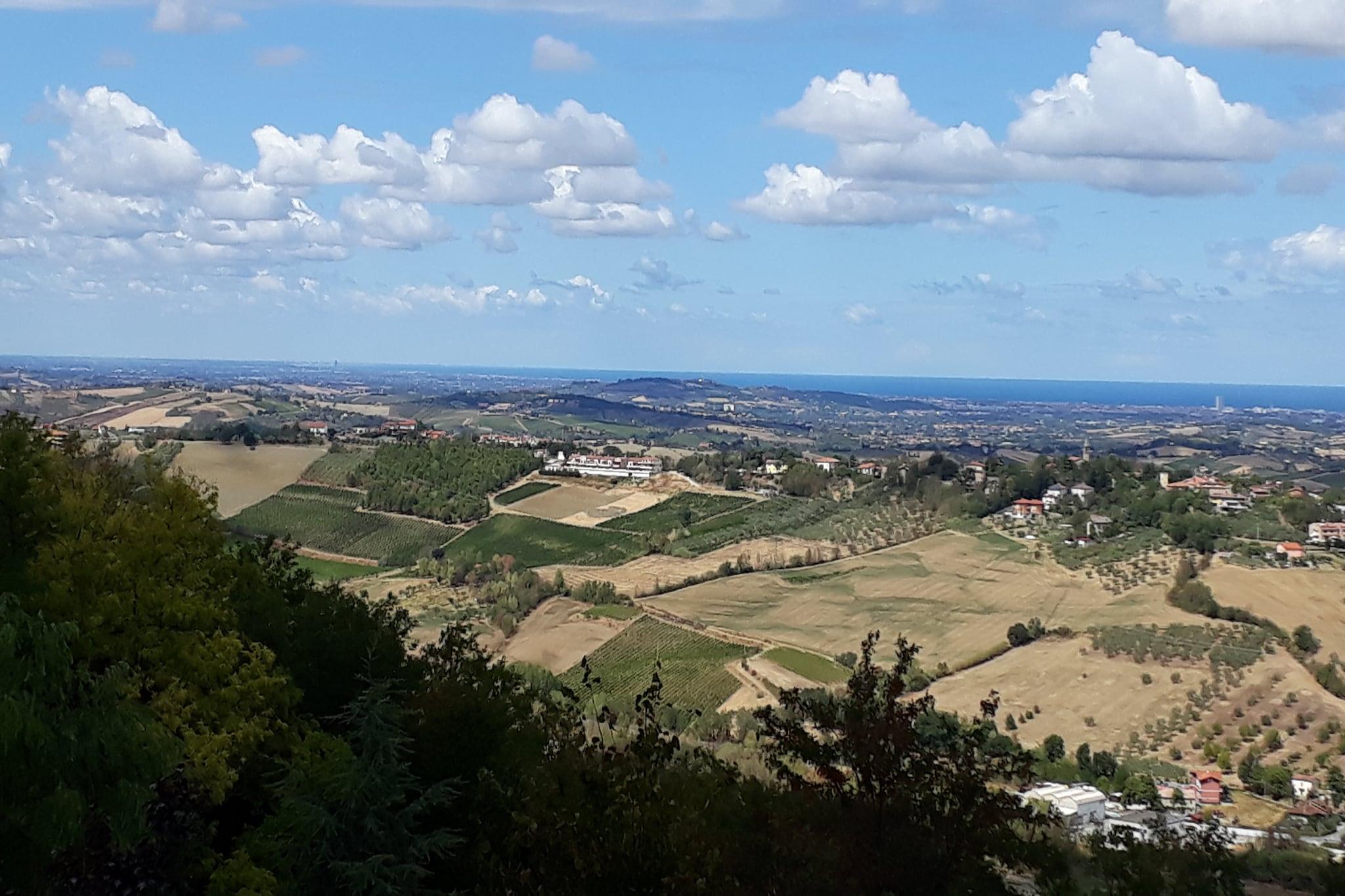 Denne villaen ligger i de rolige åsene i Gemmano og tilbyr et fredelig tilfluktssted omgitt av en anlagt og inngjerdet hage. Den er ideell for familier eller små grupper, og har en romslig terrasse og balkong med utsikt over det frodige landskapet, solsenger, en hengekøye og en barneseng for de minste. Gjestene kan slappe av utendørs, nyte et glass lokal vin eller la barna leke trygt i hagen. Villaens beliggenhet gir enkel tilgang til regionens historiske byer. Montefiore Conca, bare 10 km unna, kan skilte med et slott og panoramautsikt, mens de befestede landsbyene Mondaino, Saludecio og Montegridolfo byr på middelaldersk sjarm og håndverksmarkeder. Sandstrendene i Cattolica, Riccione og Rimini ligger innen 20-30 minutters kjøretur unna, perfekt for sol- og sjøelskere. Matentusiaster vil glede seg over nærliggende restauranter som Ristorante Vecchia Gemma, som serverer tradisjonell romagnolsk mat, og La Grotta della Giamaica, som tilbyr lokale viner i en unik huleaktig setting. Vinsmakingsturer er også å anbefale. Enten du er ute etter kystopplevelser, kulturelle utflukter eller rolige stunder i naturen, er denne villaen et sjarmerende utgangspunkt for å utforske det beste Romagna har å by på.