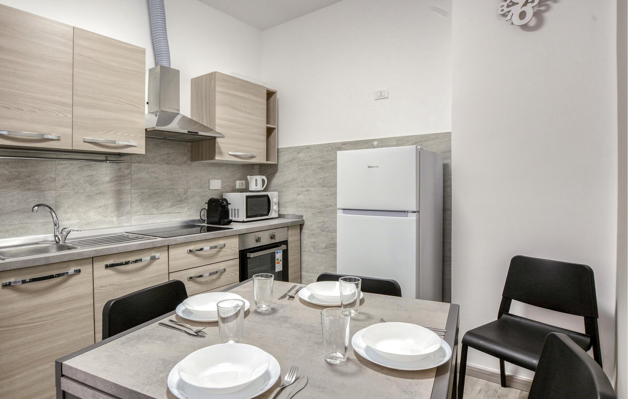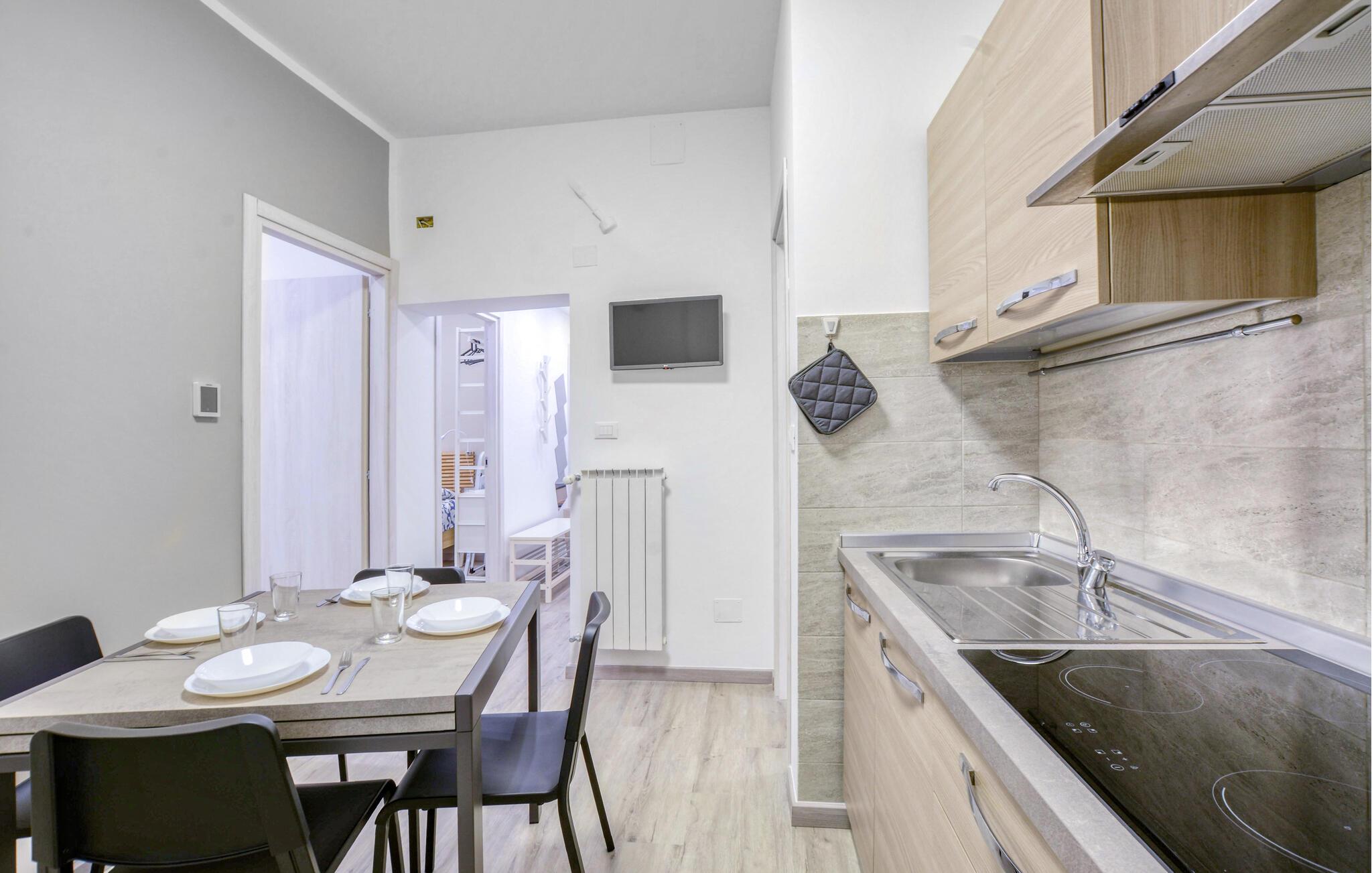 Nyt avslappende dager i denne ferieleiligheten, som gir deg de ideelle omgivelsene for en avslappende ferie. Innredningen med funksjonelt kjøkken, koselig sofa og TV skaper en hyggelig atmosfære der du umiddelbart vil føle deg som hjemme. Start dagen med en velduftende kaffe eller lag et deilig måltid sammen, kanskje ledsaget av et glass italiensk vin. Her kombineres det uformelle og det hyggelige for å skape en ferie som den skal være.