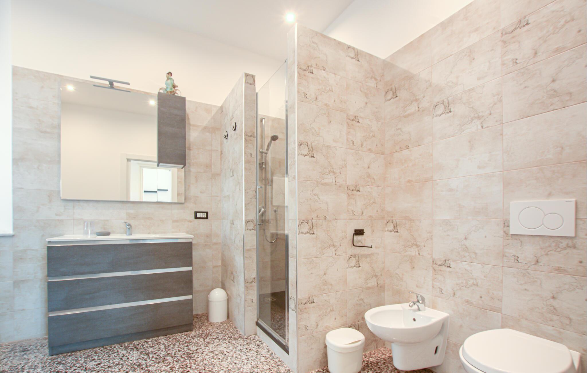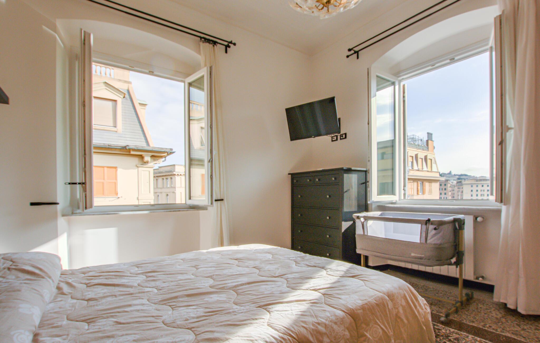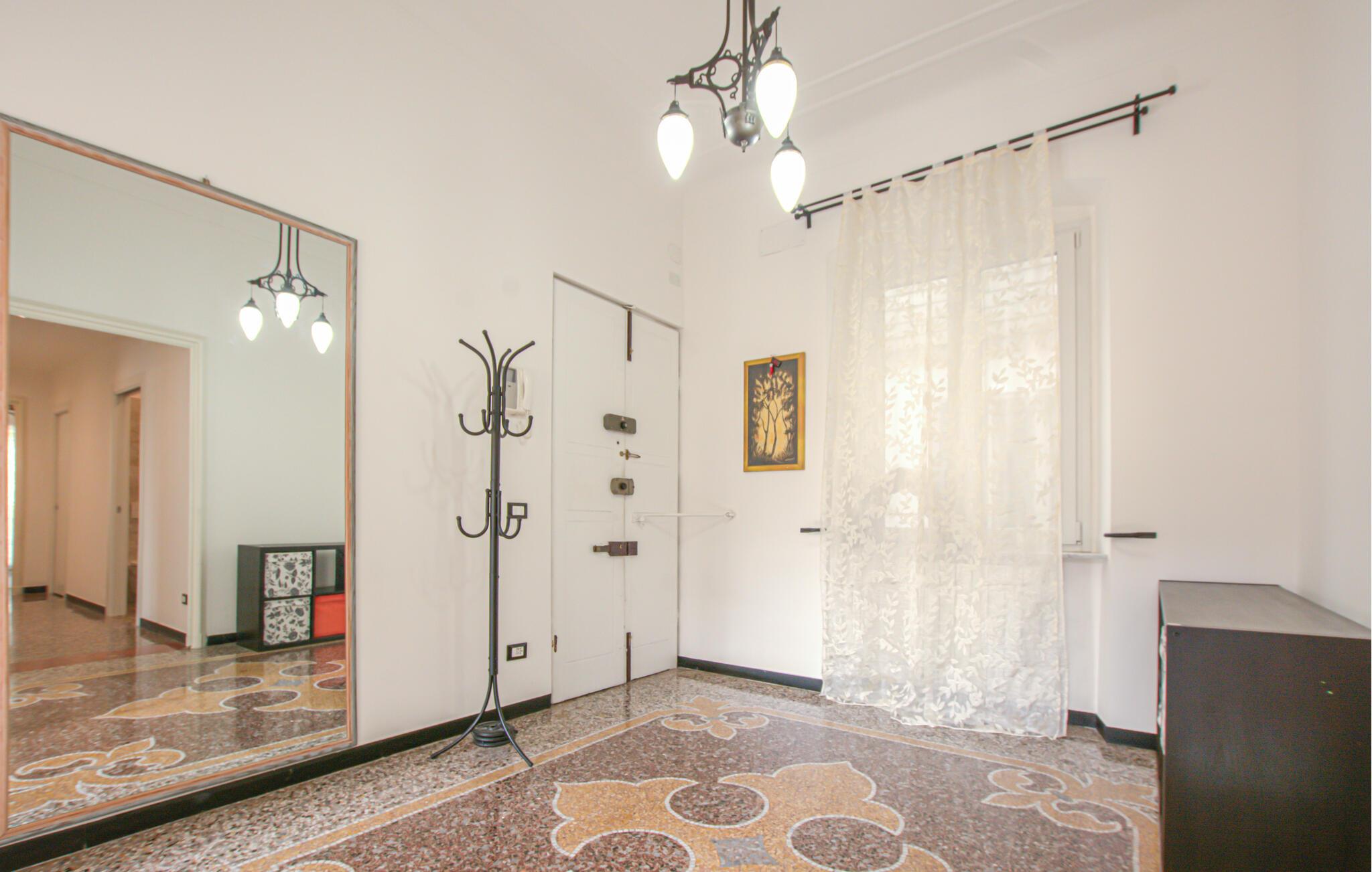Høy takhøyde, store vinduer og dekorative lysekroner gir rommene et elegant preg. Slå deg ned i sofaen i stuen eller bruk spisebordet til felles måltider. Det åpne kjøkkenet med mønstret flislagt vegg gjør at du kan tilberede italienske spesialiteter selv. Åpne balkongdøren og slipp inn lyset og byens lyder.