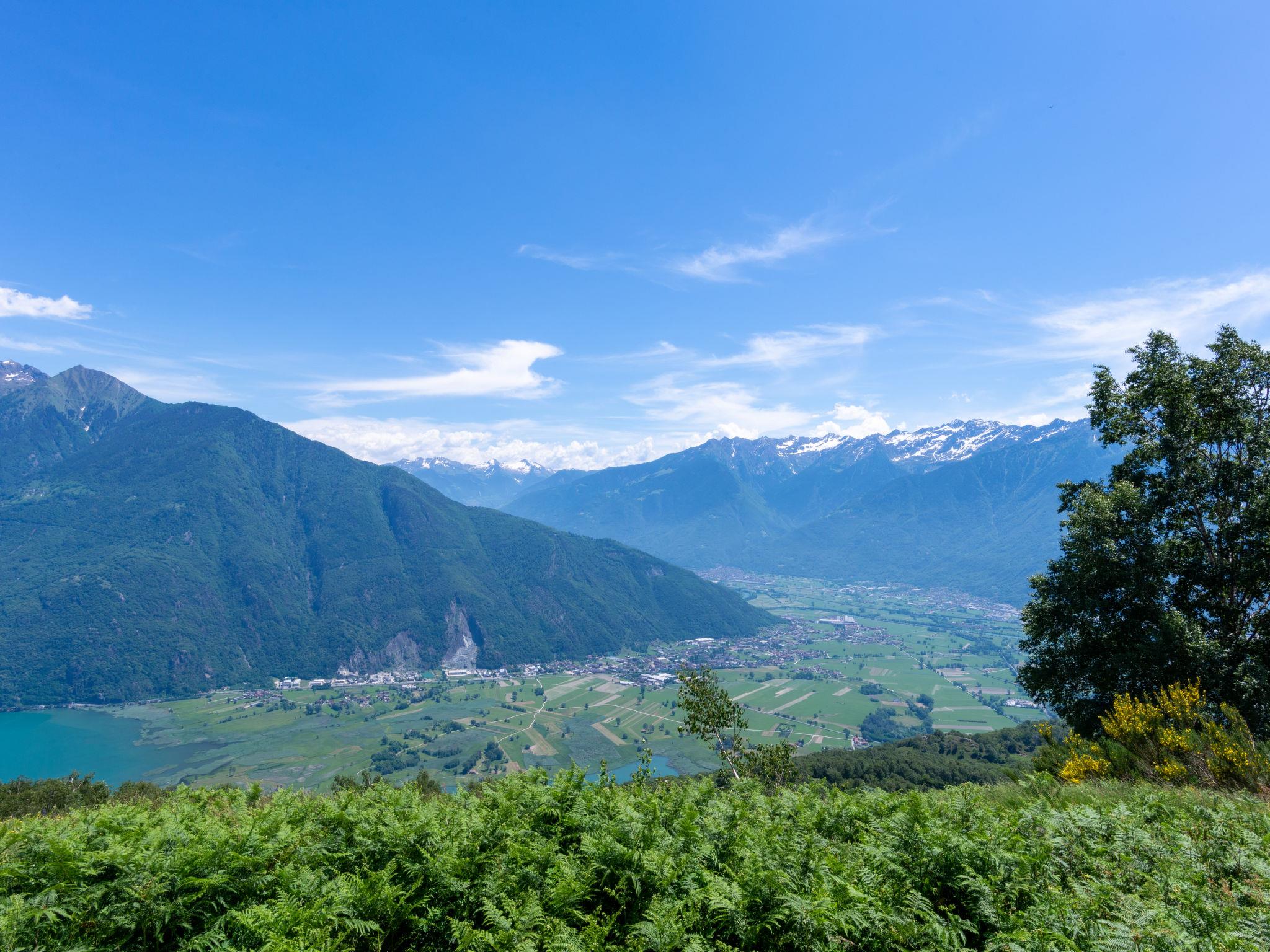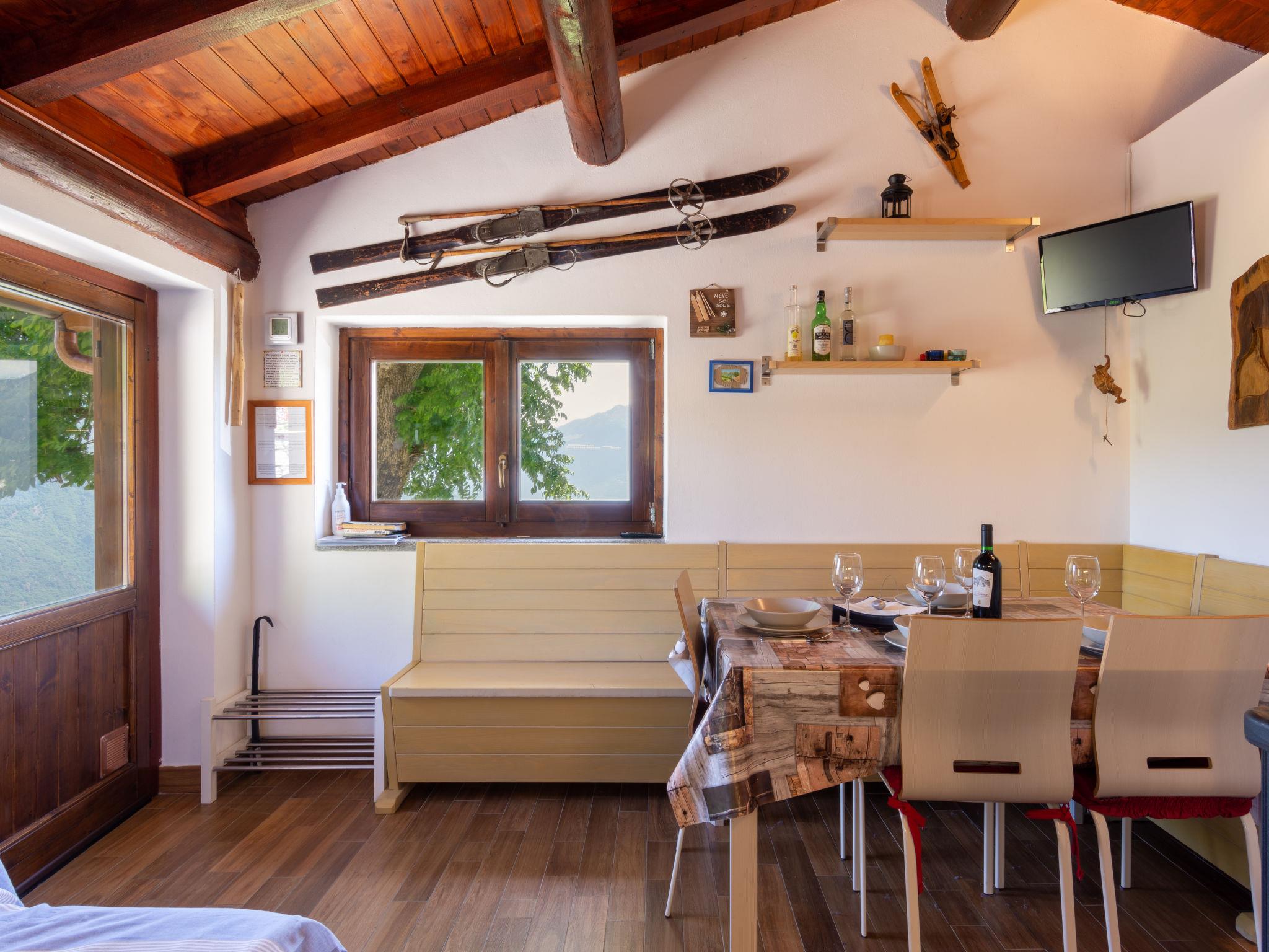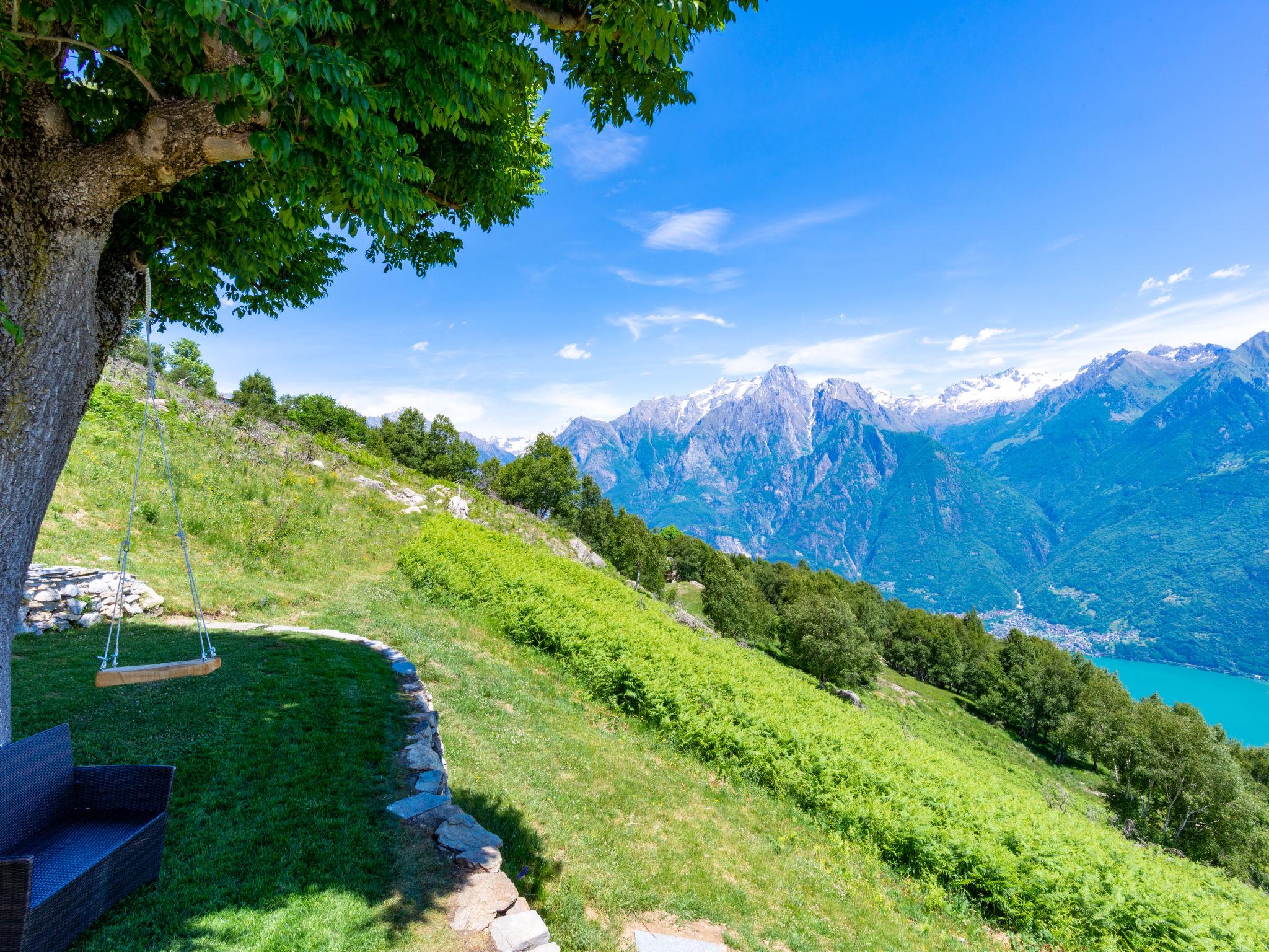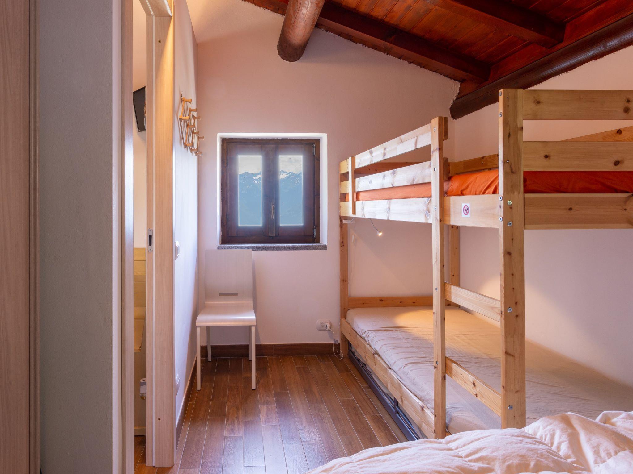 2-room house 35 m2 on 2 levels. Rustic furnishings: living/dining room with sloping ceilings with dining table, satellite TV and heating stove. Exit to the terrace. Open, with sloping ceilings, 1 room with 1 x 2 bunk beds, 1 french bed (140 cm). Open kitchen (dishwasher, 4 induction hot plates, toaster, kettle, microwave, electric coffee machine). On the lower ground floor: shower/WC. Large terrace, patio. Barbecue, deck chairs (4). Marvellous panoramic view of the mountains and Lago di Mezzola. Facilities: hair dryer. Parking (2 cars). Please note: non-smokers only. Maximum 1 small pet/ dog allowed. No internal connecting door between the floors. Note: The wall between the bedroom and living room is open a gap to the ceiling. IT013216C2IQKC6J38