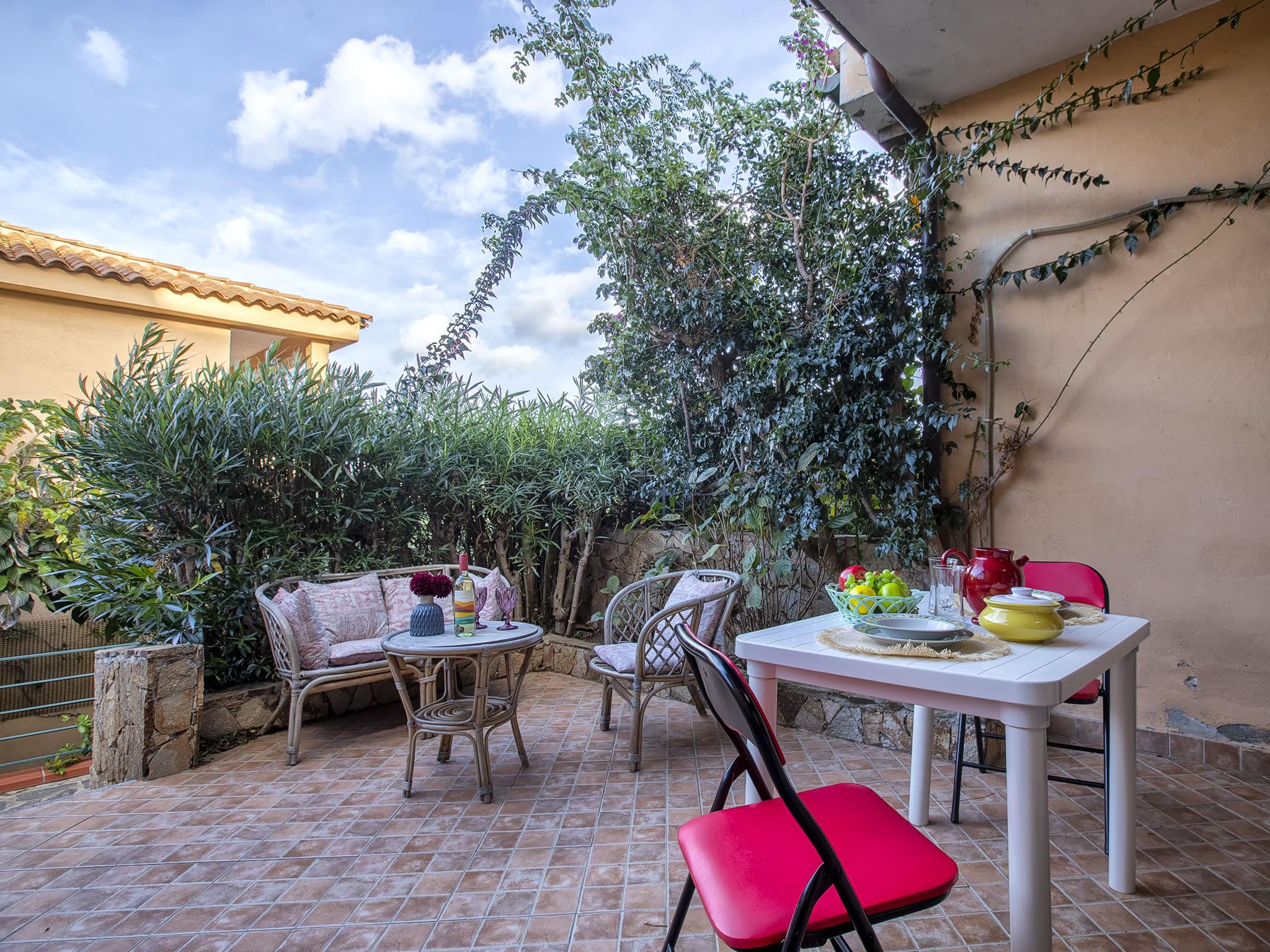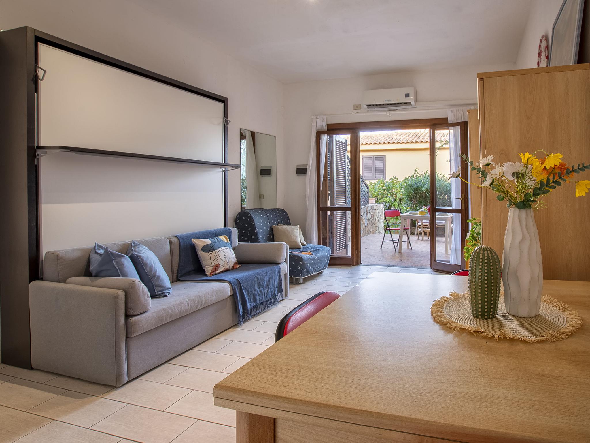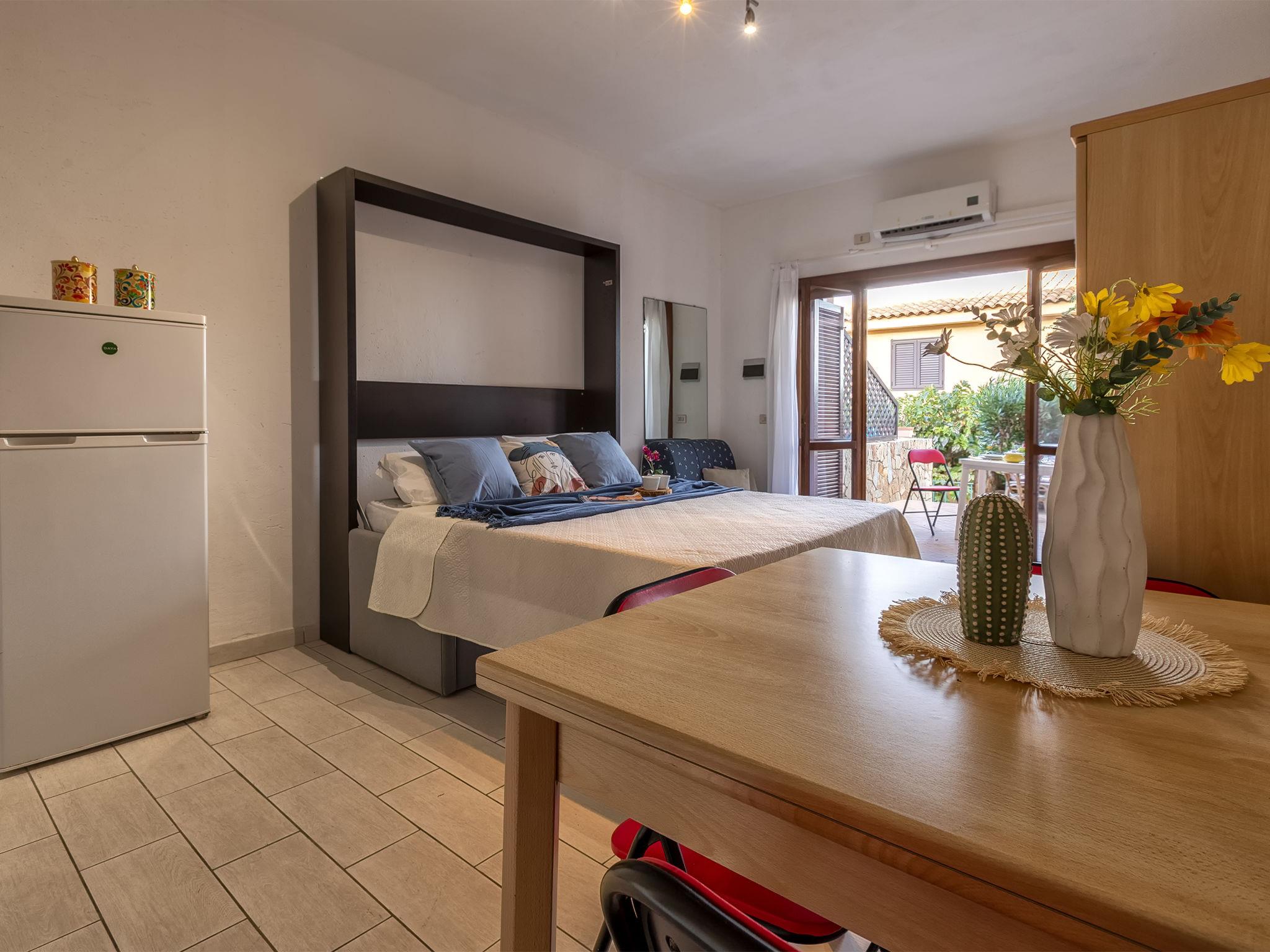 "D3 - 2 - Baia de Bahas", 1-room apartment 27 m2, on the ground floor. Simple and cosy furnishings: living/dining room with 1 double sofabed, dining table, TV, air conditioning and forced-air heating. Exit to the veranda. Small kitchenette (4 gas rings, toaster, kettle). Shower/bidet/WC. Air-conditioning, forced-air heating. Terrace 10 m2 partly roofed. Terrace furniture. Facilities: iron, hair dryer. Maximum 1 pet/ dog allowed. IT090083C2000R8285