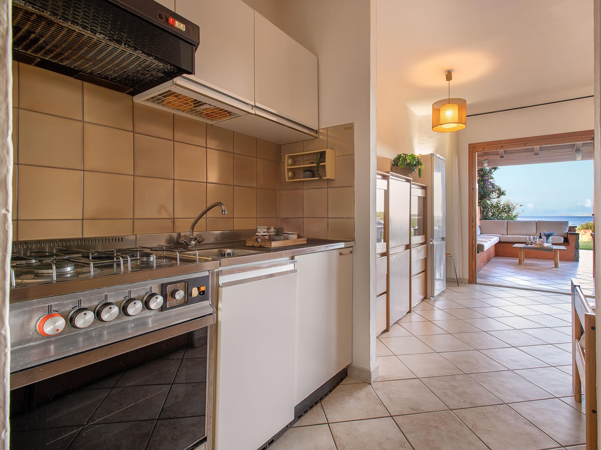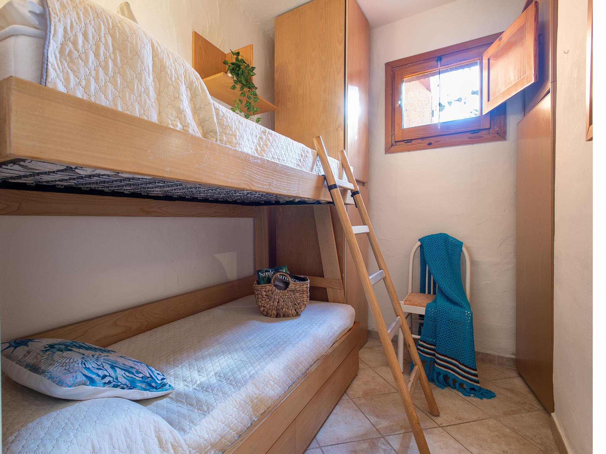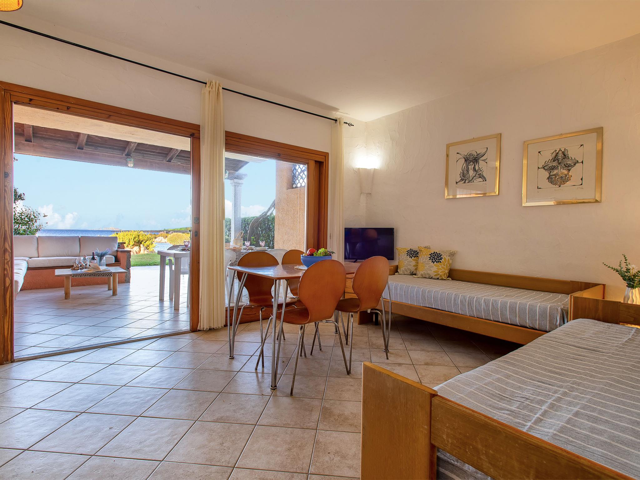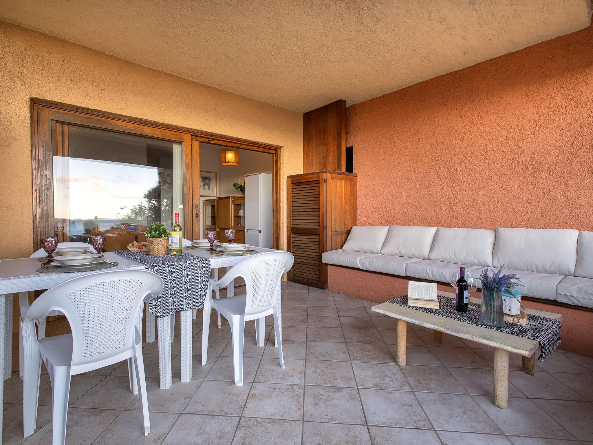 "B/0/3 - Marineledda", 3-room apartment 52 m2, on the ground floor. Simple and cosy furnishings: living/dining room with 2 beds, dining table, digital TV, air conditioning and forced-air heating. Exit to the terrace. 1 double bedroom. 1 room with 1 x 2 bunk beds. Kitchenette (oven, 3 gas rings, toaster, kettle). Shower/bidet/WC. Air-conditioning, forced-air heating. Heating not available in all rooms. Large terrace 11 m2 partly roofed, garden. Terrace furniture. Marvellous view of the sea and the garden. Facilities: washing machine, iron, hair dryer. Parking space n B/0/3. Maximum 1 pet/ dog allowed. IT090083B4000R7795