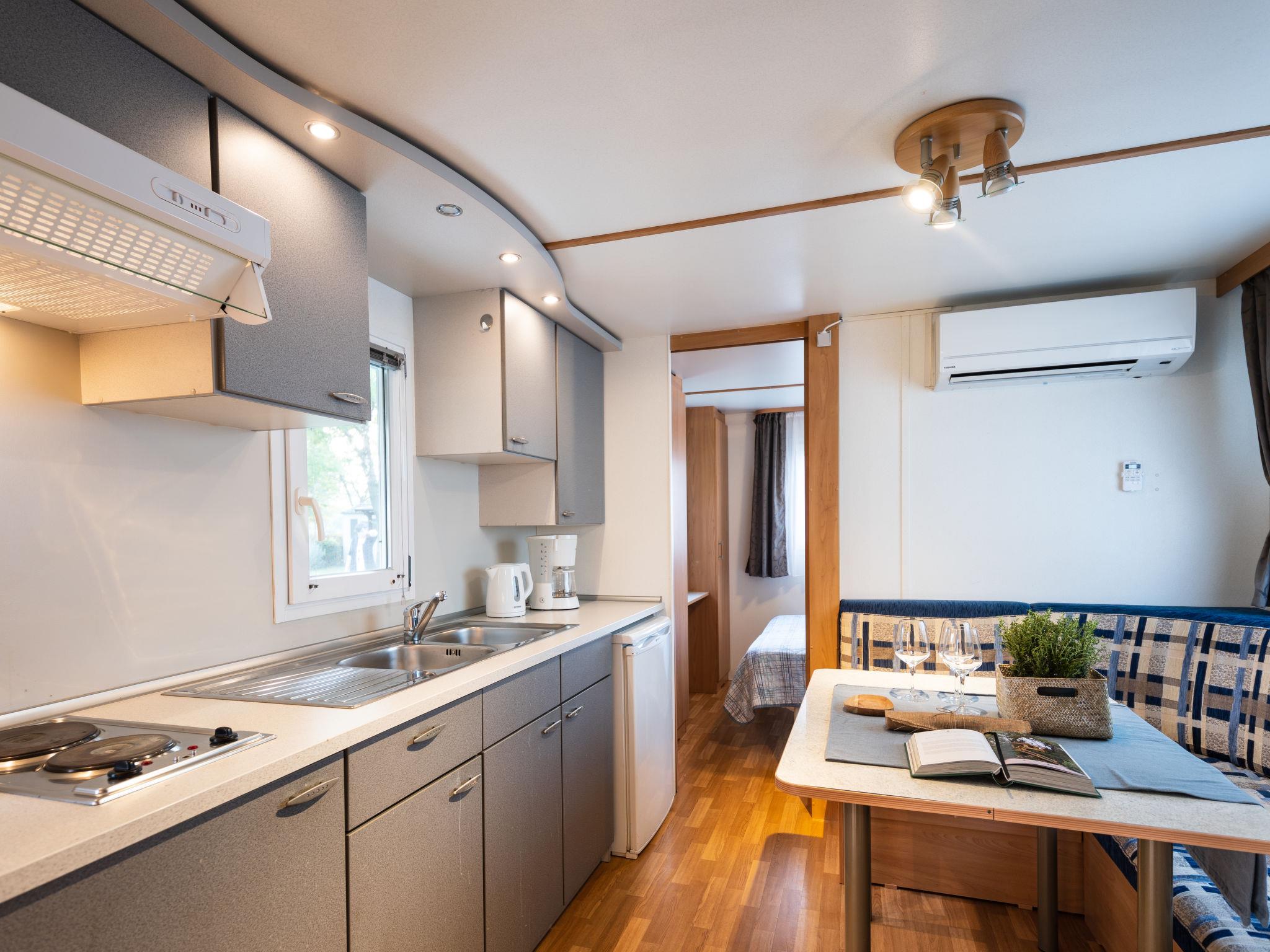 "Garden", 3-room mobile home 24 m2. Practical furnishings: living/sleeping room with 1 double sofabed (140 cm, length 190 cm), dining table. Exit to the terrace. 1 room with 1 french bed. 1 room with 2 beds (65 cm, length 190 cm). Kitchenette (2 hot plates, kettle, microwave, electric coffee machine). Shower/WC. Air-conditioning, forced-air heating. Terrace roofed. Terrace furniture, deck chairs (2). Facilities: safe, mosquito net, children's high chair, baby cot (extra). Parking (1 car). Please note: non-smoking house. Beach ca. 300-400 m. IT031009B28ZDV3E5N