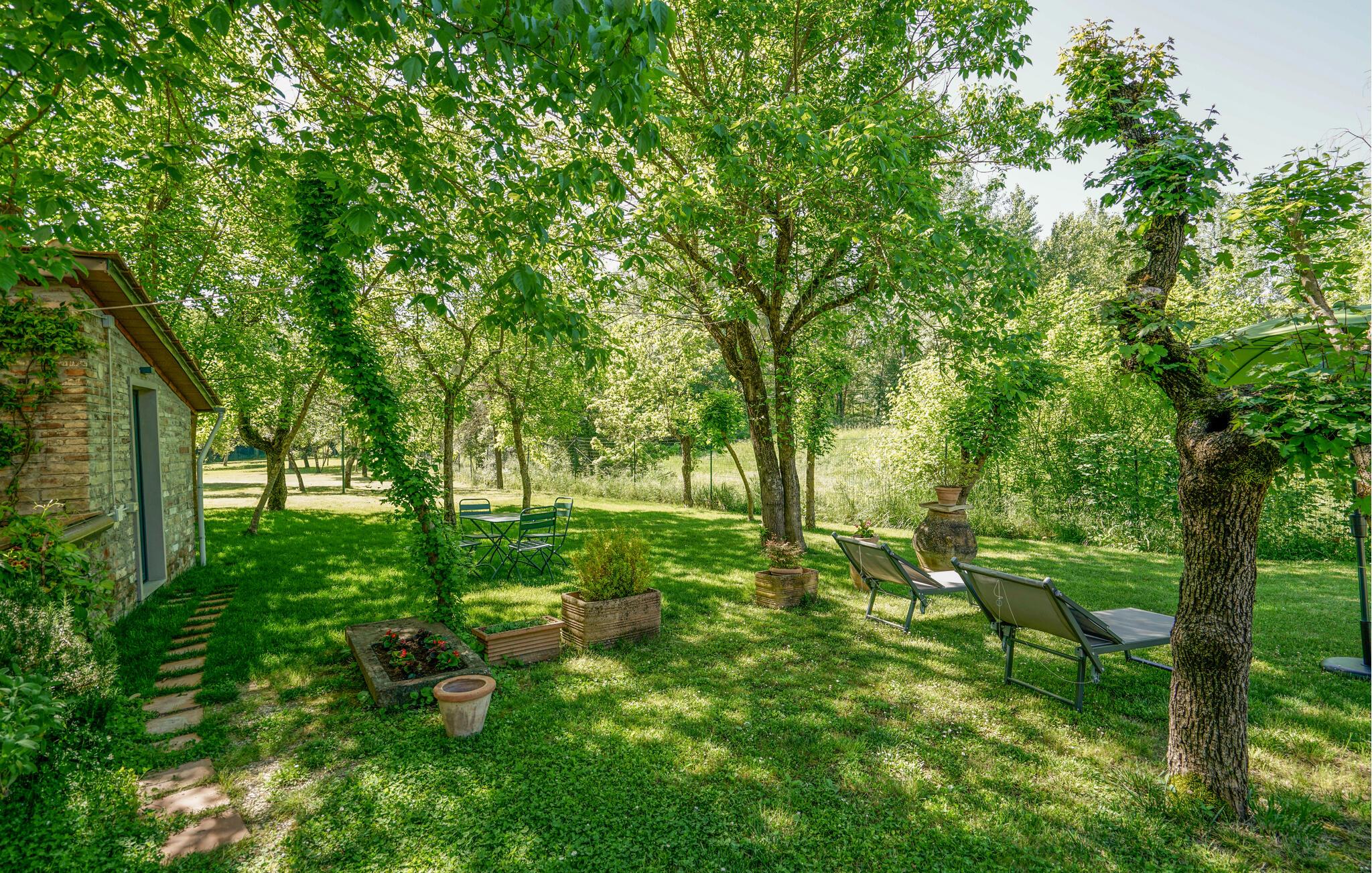 Den romslige hagen med skyggefulle trær byr på behagelige sitteplasser og koselige steder for harmoniske stunder i naturen. Nyt solen i solstolene, lytt til fuglekvitteret og nyt de regionale vinene under parasollen. Tenn opp grillen og lag stemningsfulle grillmatretter i det fri mens barna leker på den store plenen.
