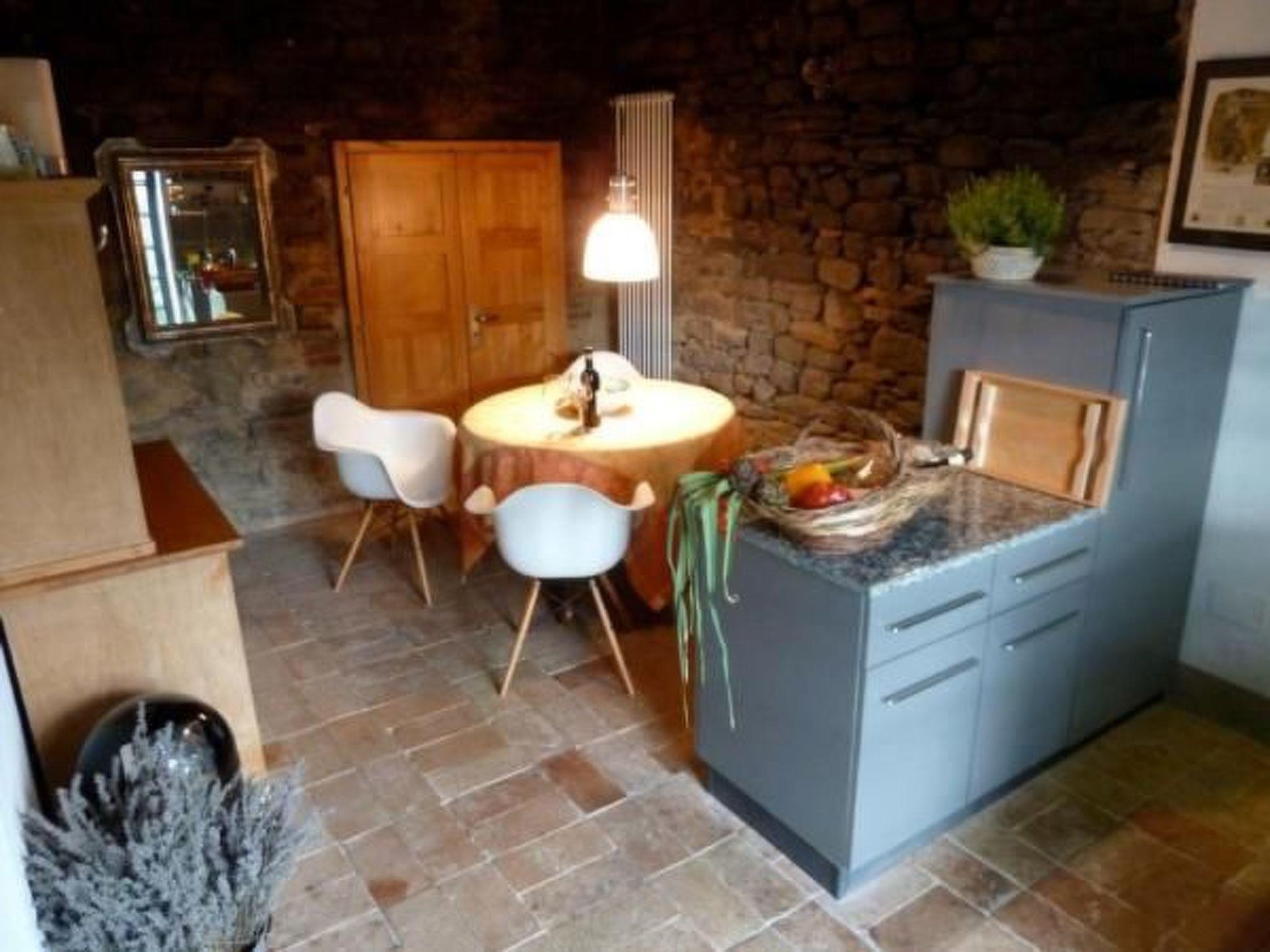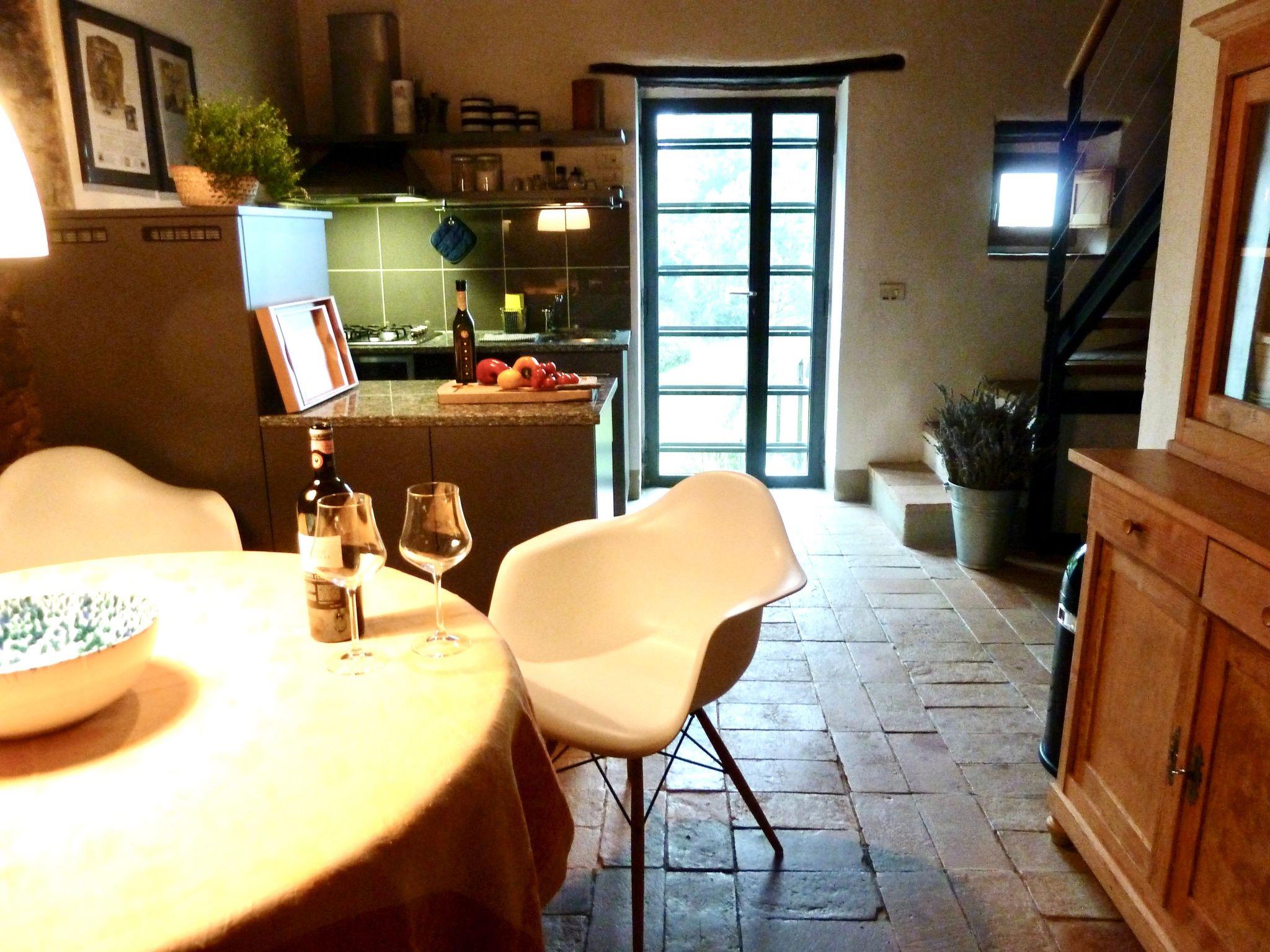 The tower, the oldest part of the estate, dates back to Roman times. The ground floor was dominated by a large wood-fired oven. Now there is an idyllic modern eat-in kitchen connected to the living room by an open gallery over two floors. The bedroom with air conditioning on the top floor has a view over the entire hills of the valley.