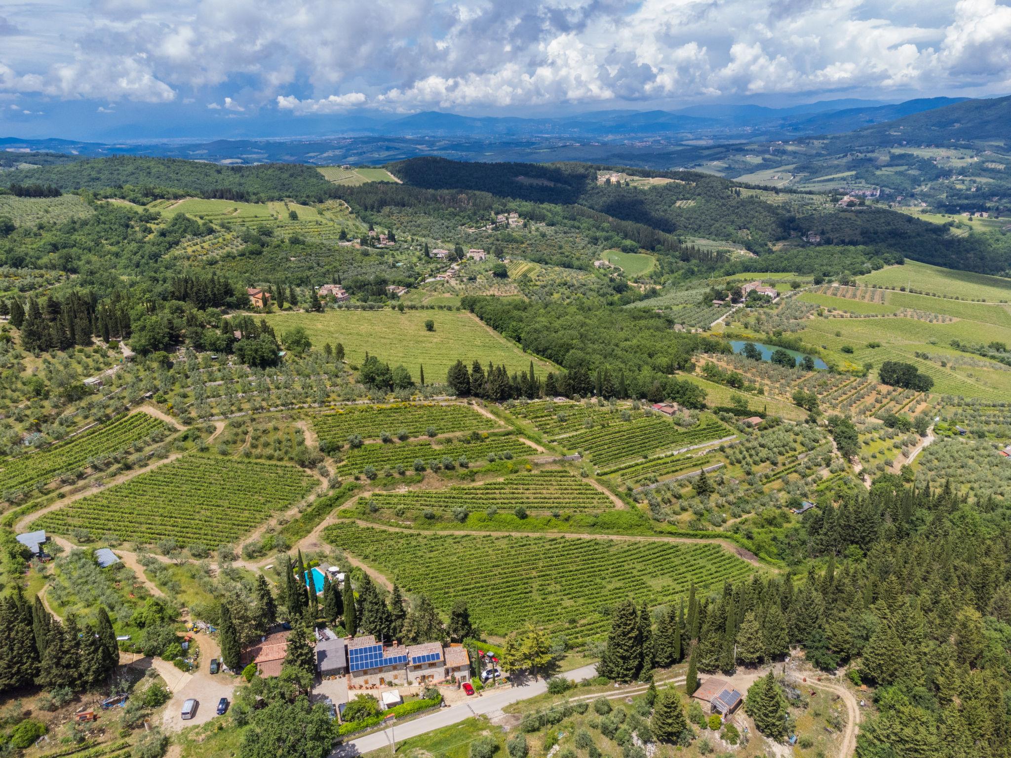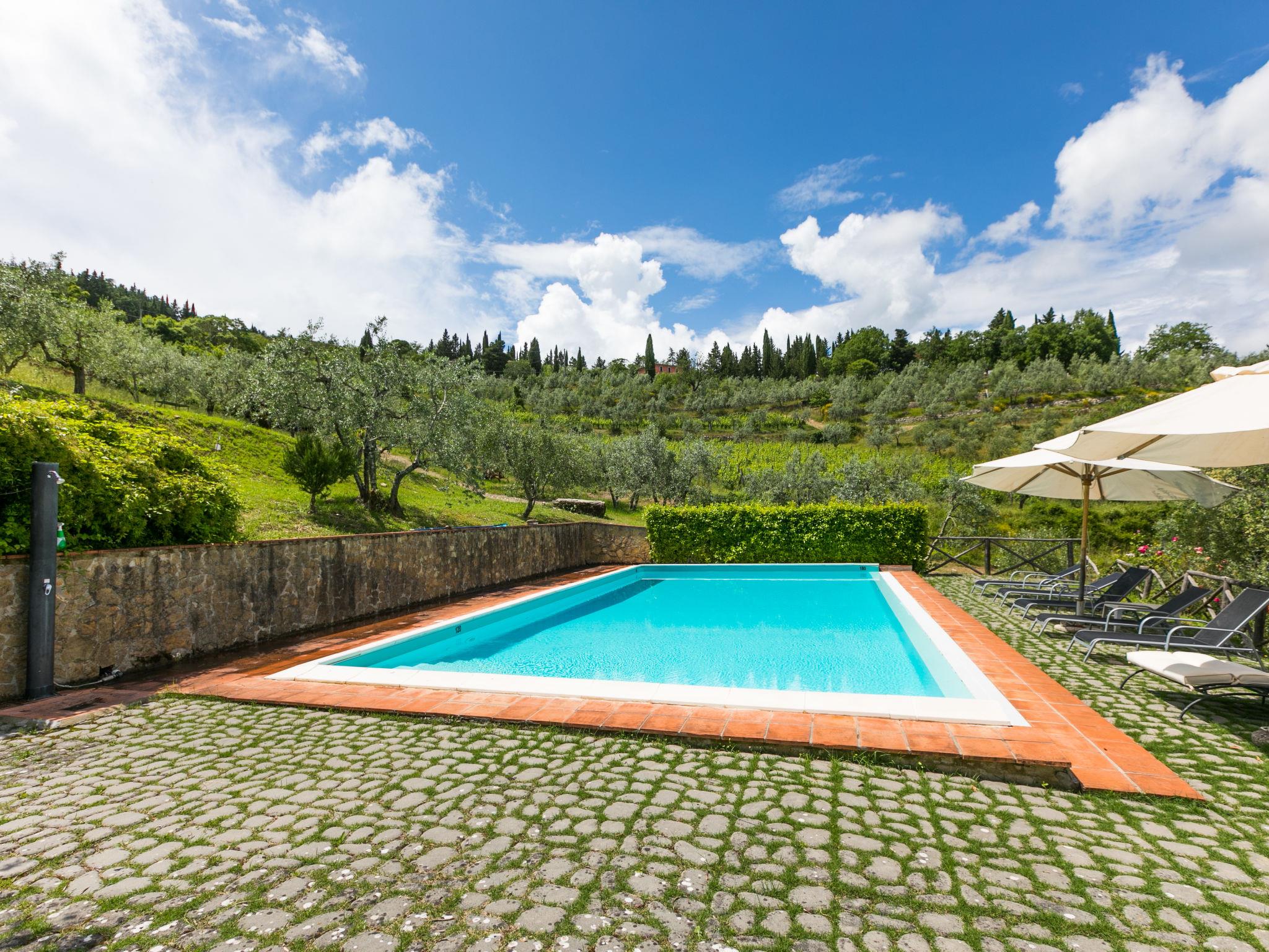 Montefioralle 3 km from Greve in Chianti: Agriturismo on a vinyard "San Rocco", 2 storeys, from the 19th century, surrounded by trees, fields and vineyards. 3 apartments in the residence. 3 km from the centre of Greve in Chianti, 1 km from the centre of Montefioralle, outside the resort, 25 km from the centre of Firenze, in a sunny position, in the countryside. For shared use: terraced garden, 4 ha (not fenced) with plants and trees, natural garden, swimming pool (12 x 6 m, depth 120 - 180 cm, seasonal availability: 02.May. - 03.Oct. pool opening hours: 08:00-20:00). Outdoor shower, barbecue, pool maintenance by the owner/gardener. In the house: washing machine (extra). Parking on the premises. Grocery 3 km, restaurant 3 km, bus stop 3 km, outdoor swimming pool 3 km. Golf course (18 hole) 18 km. Local sale of farm products. Owner lives in separate semi-detached house.