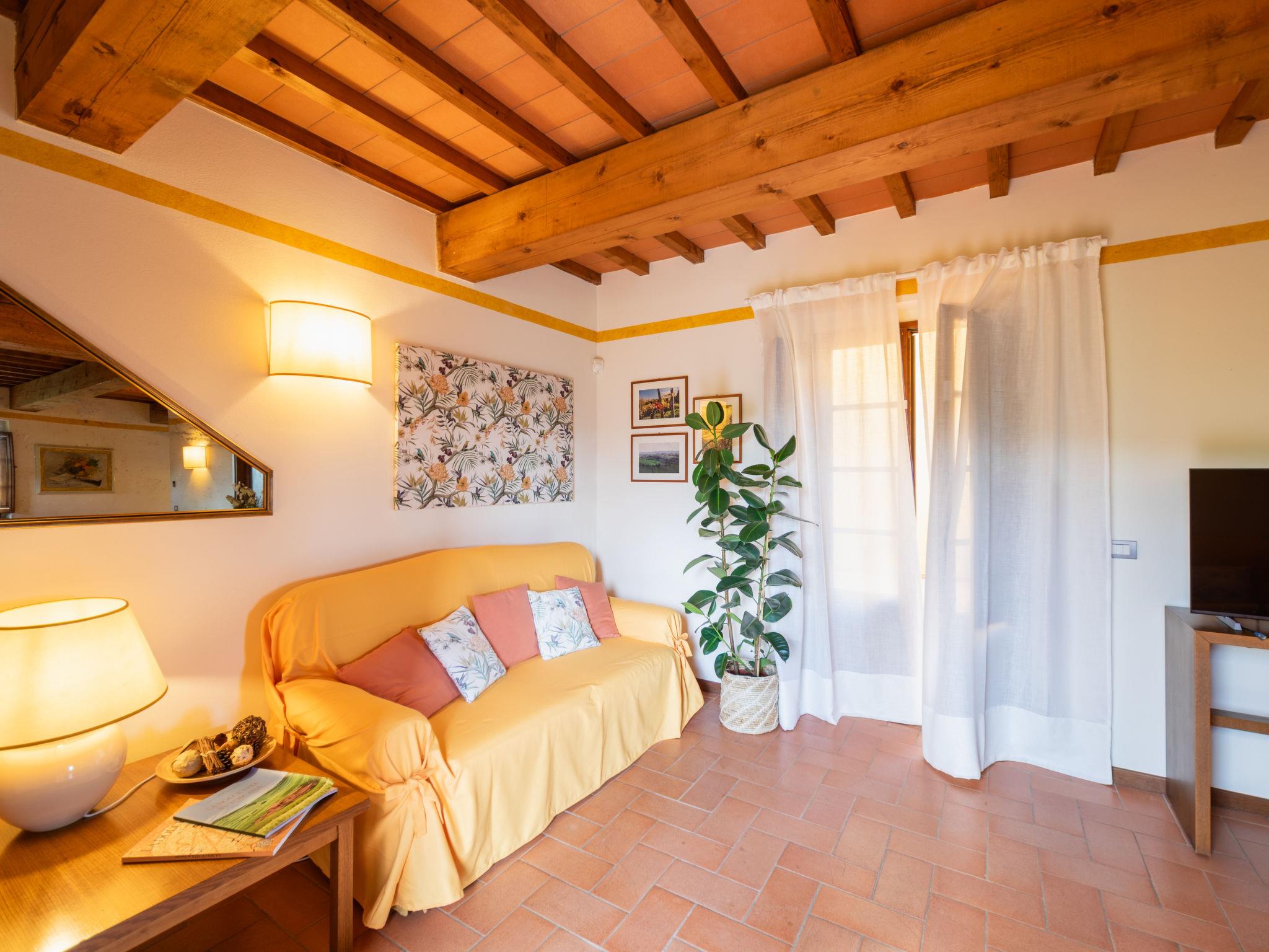 Hamlet surrounded by the countryside with 4 detached houses. In little square you can see 2 houses (I lecci, La Pieve), La Torre and La Corte are in another building separated from the rest by a central courtyard to esclusive use of « La Corte » (I5269.951.5). The furnishings and equipment are well-kept to ensure maximum comfort. Very child friendly, cosy holiday development "Borgo", surrounded by vineyards. 6 houses in the residence. 8 km from the centre of Greve in Chianti, 32 km from the centre of Firenze, 55 km from the centre of Siena, in a sunny position, in the countryside. For shared use: swimming pool (6 x 14 m, depth 80 - 220 cm, seasonal availability: 30.Apr. - 01.Oct.). Barbecue, pool maintenance by the owner/gardener. In the complex: internet access, WiFi, central heating system, heating to be paid on the spot, heating available only from 01.Nov. - 04.Apr.. Room cleaning on request (extra). Parking on the premises. Shop 3 km, supermarket 8 km, restaurant 3 km, bus stop 2 km. Golf course (18 hole) 9 km, tennis 9 km, riding stable 9 km. Nearby attractions: Panzano in Chianti 17 km, Radda in Chianti 21 km, San Casciano in Val di Pesa 23 km, Gaiole in Chianti 29 km, San Gimignano, Siena 55 km, Volterra 75 km. For the second week's supply, the cost of bed linen and towels is 12 euro per person (on request). The property is equipped with a video surveillance system with cameras.