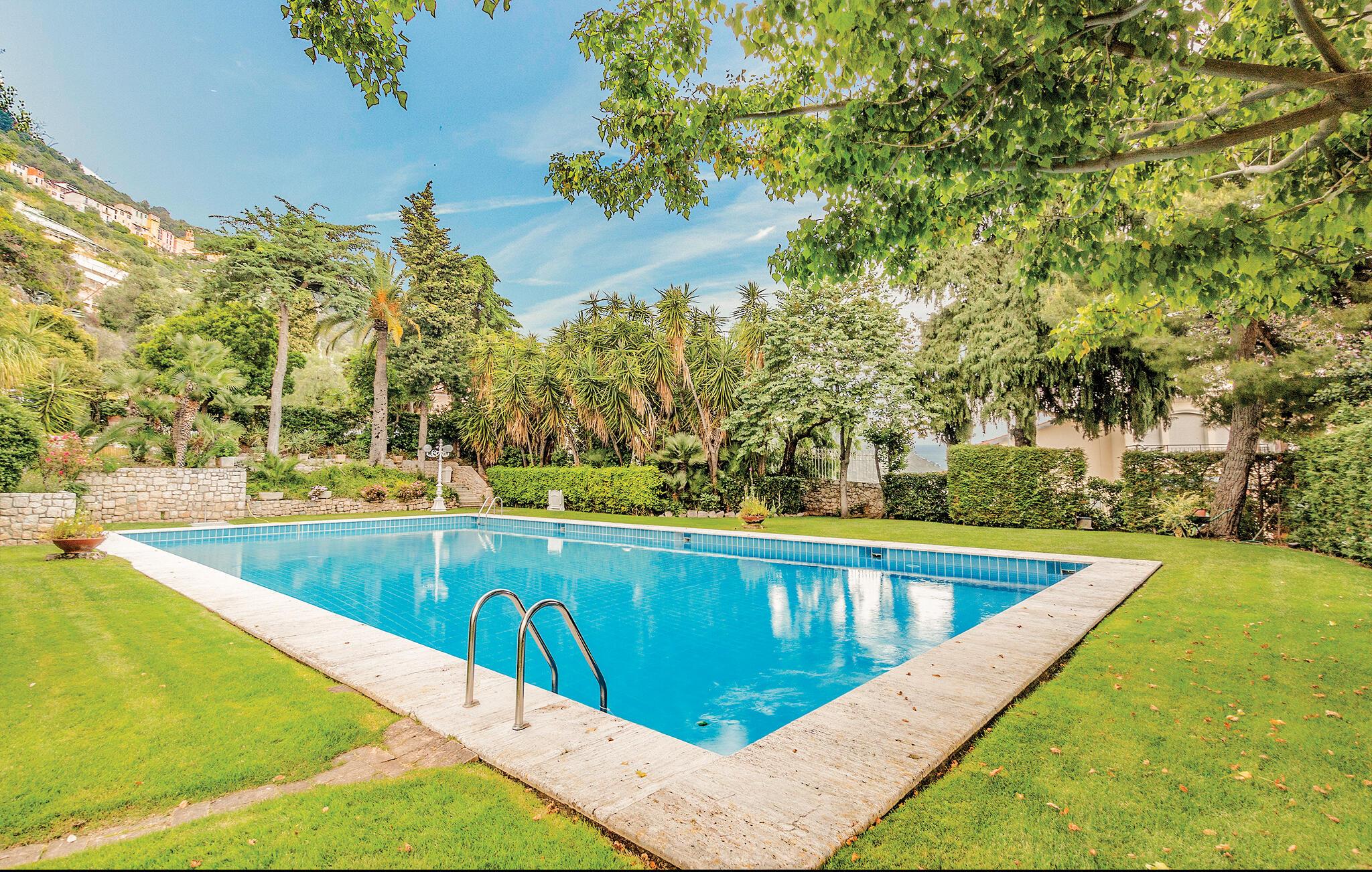Oppdag den parklignende hagen med flere nivåer og slapp av ved bassenget,