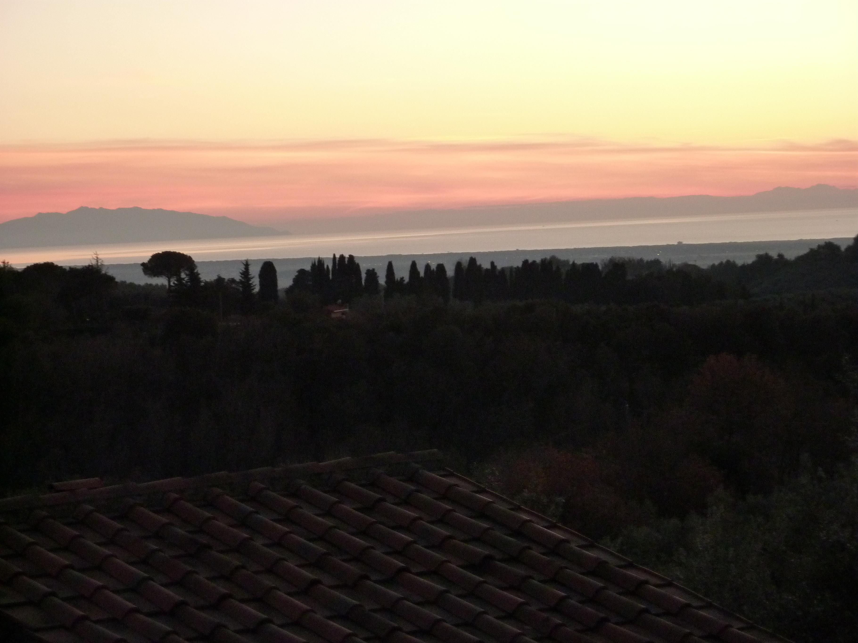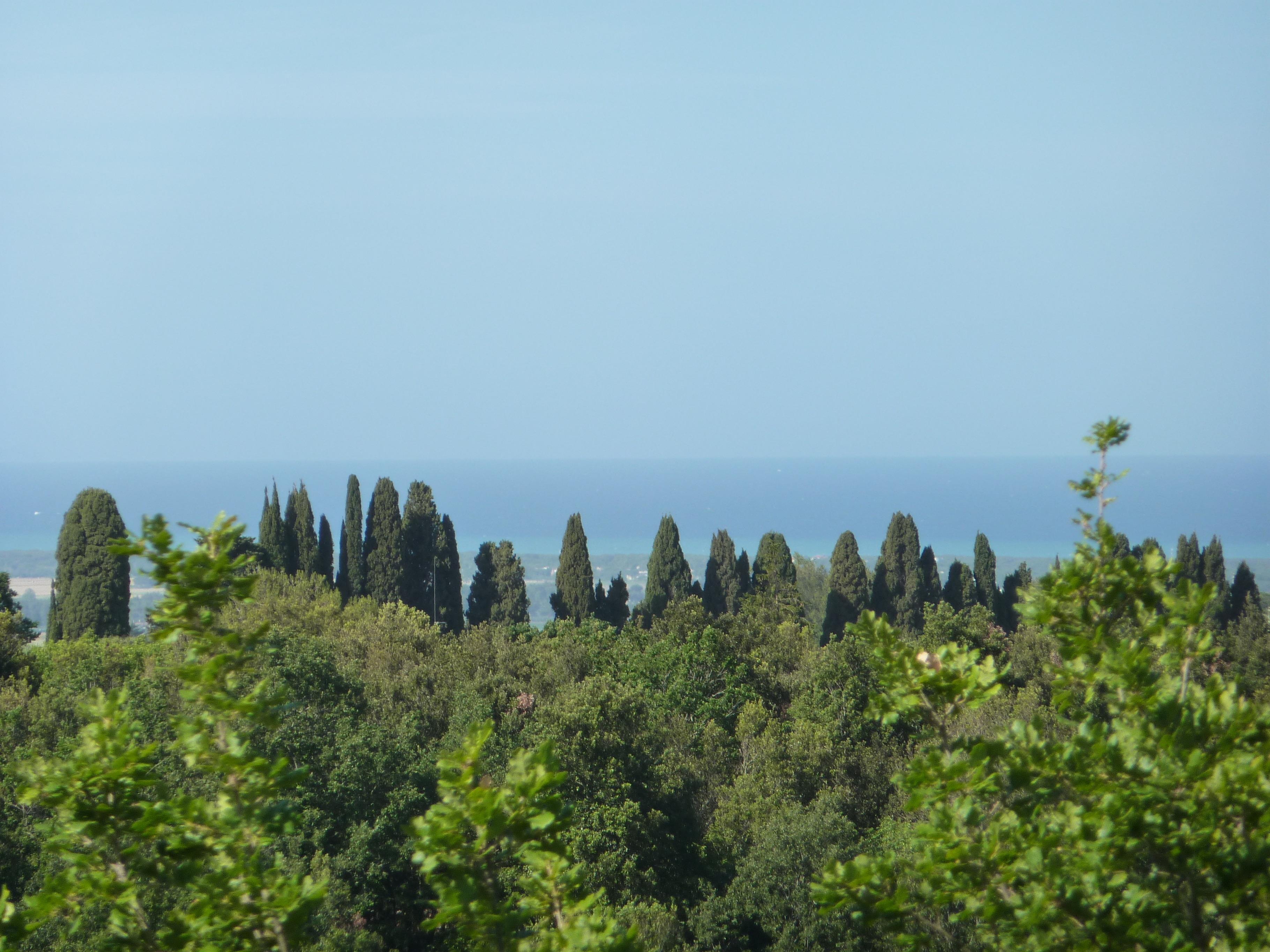 Spektakulärer Blick über die toskanischen Hügel aufs Meer und die Inseln Elba, Capraia und Korsika
