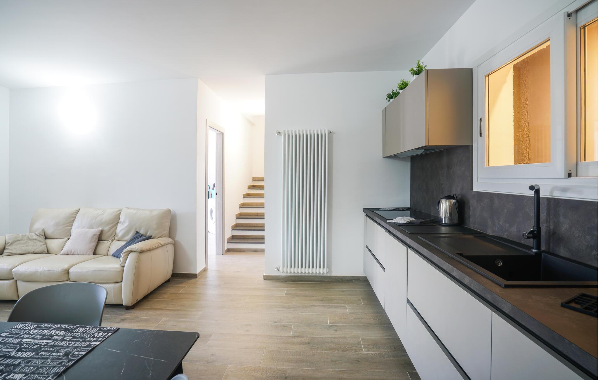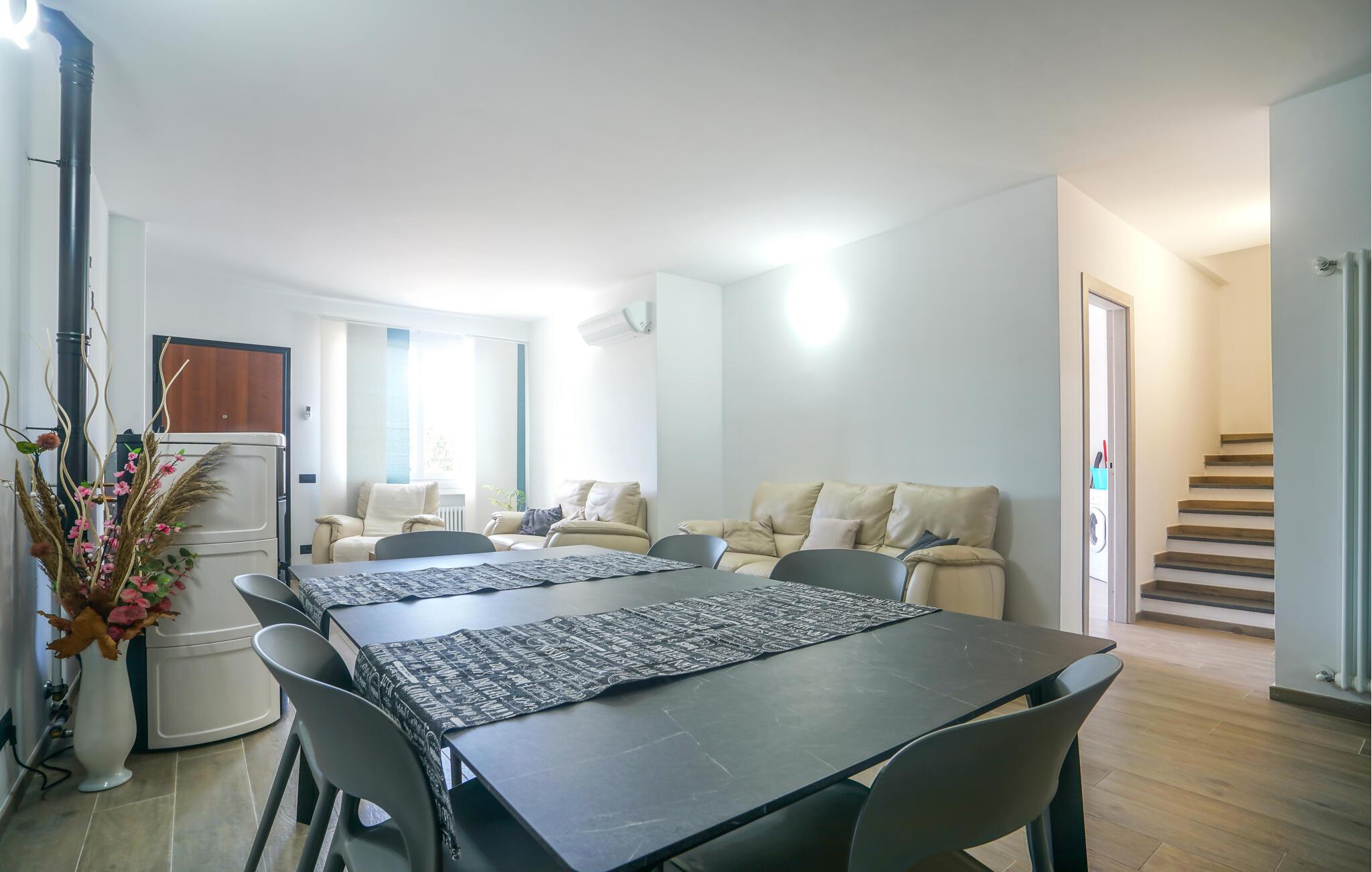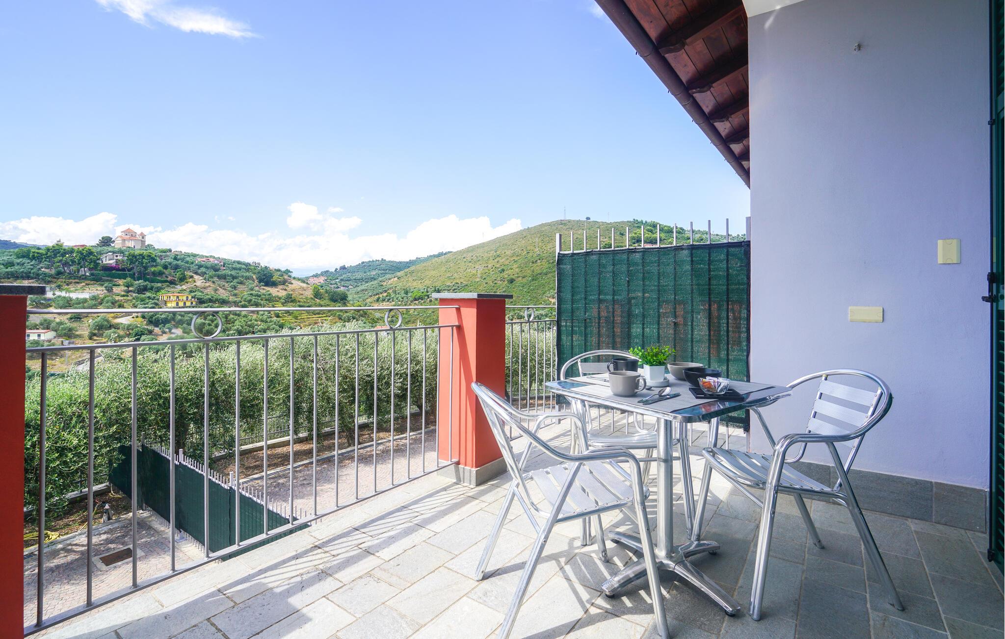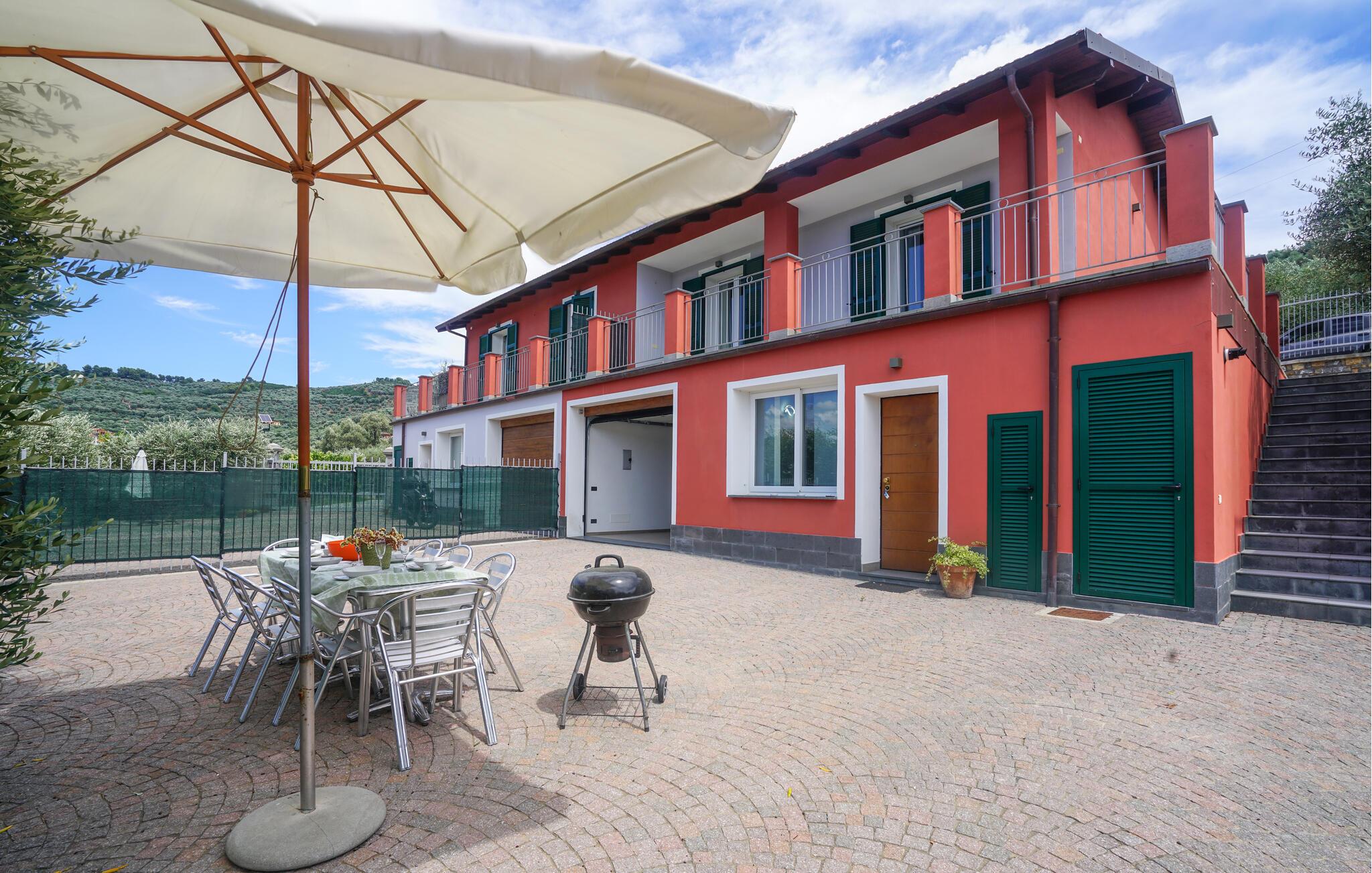 Velkommen til denne romslige tomannsboligen midt i det grønne, kuperte innlandet til kystbyen Imperia. Her blir du møtt av et pent og moderne interiør som får deg til å føle deg som hjemme. Tilbered favorittmåltidene dine, planlegg eventyrene dine ved det innbydende spisebordet, og se en spennende film i sofaen etter en lang dag.