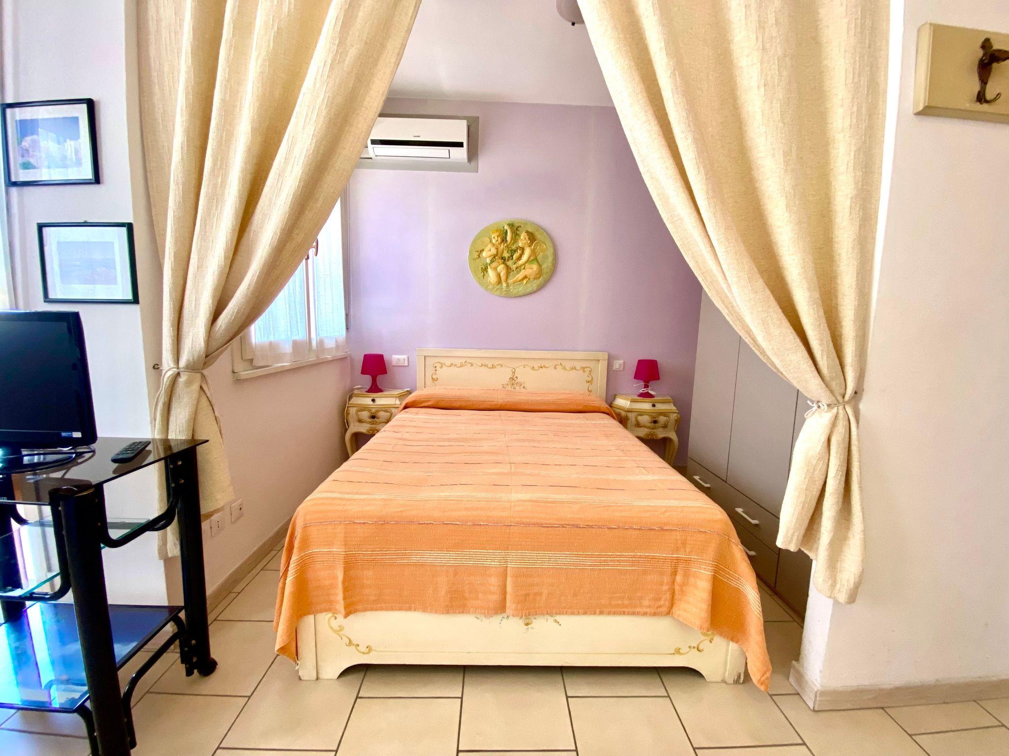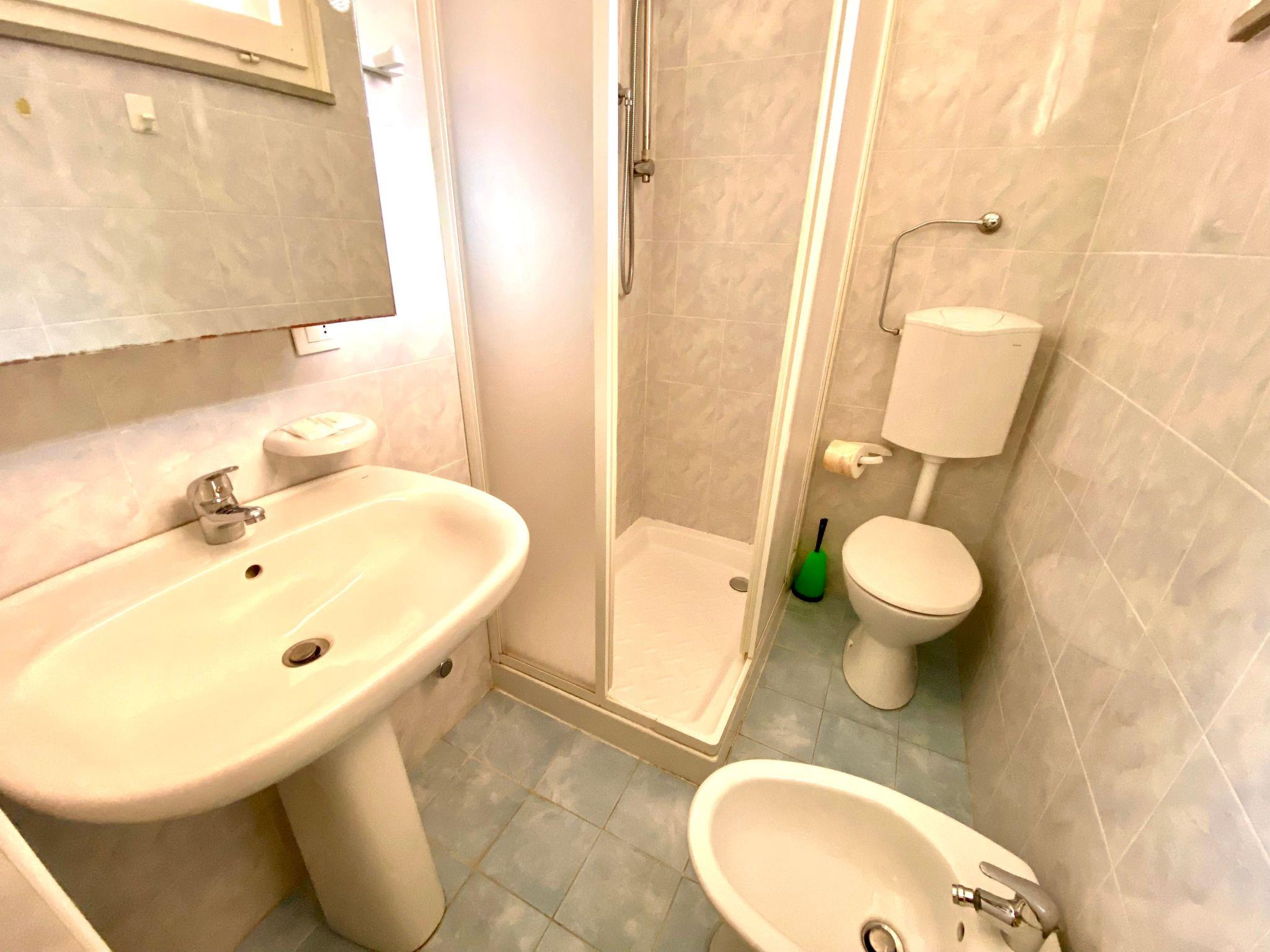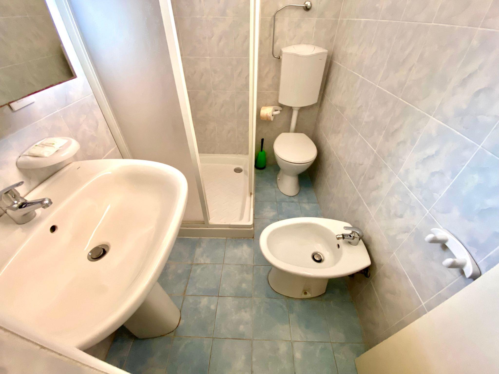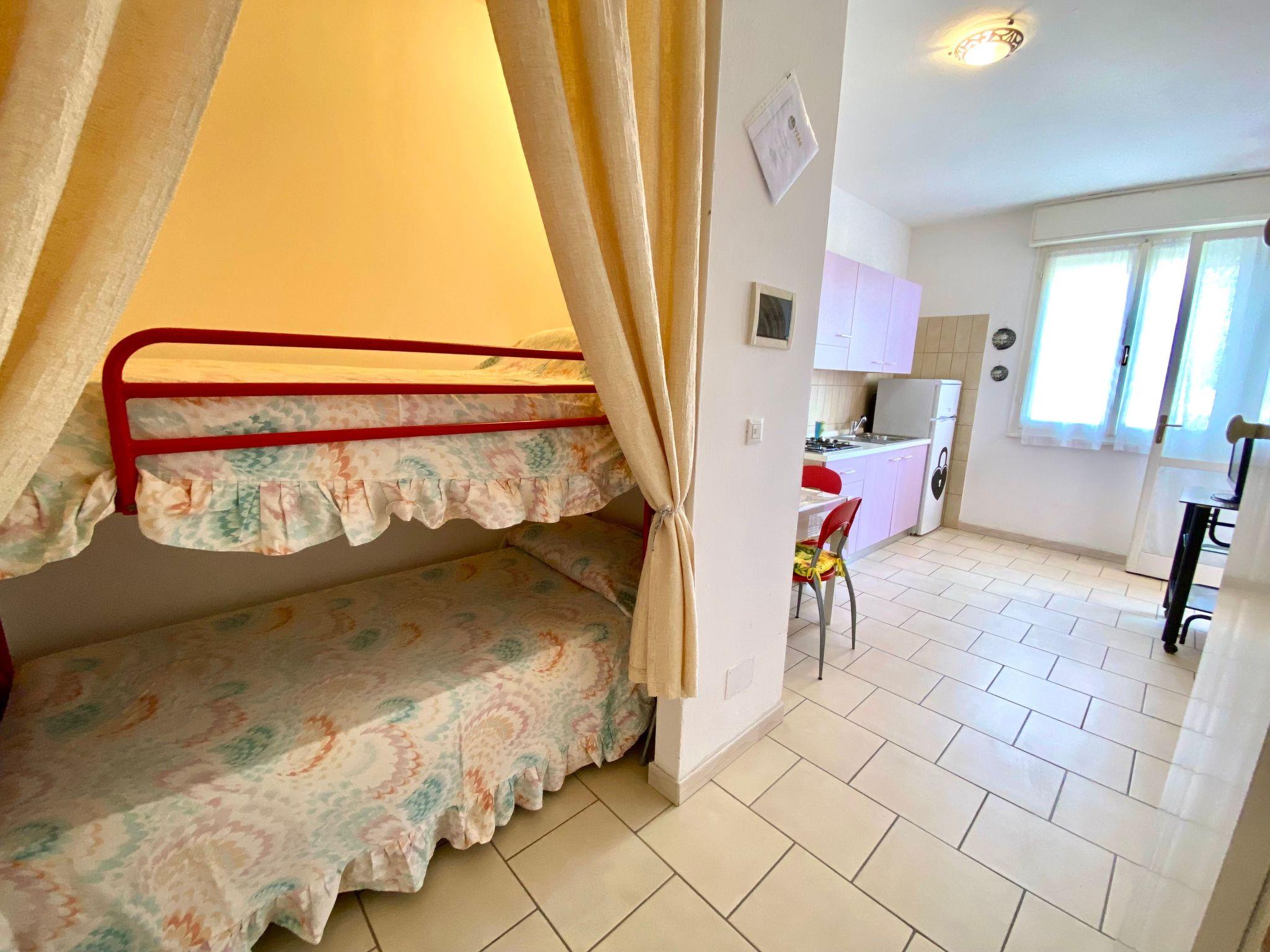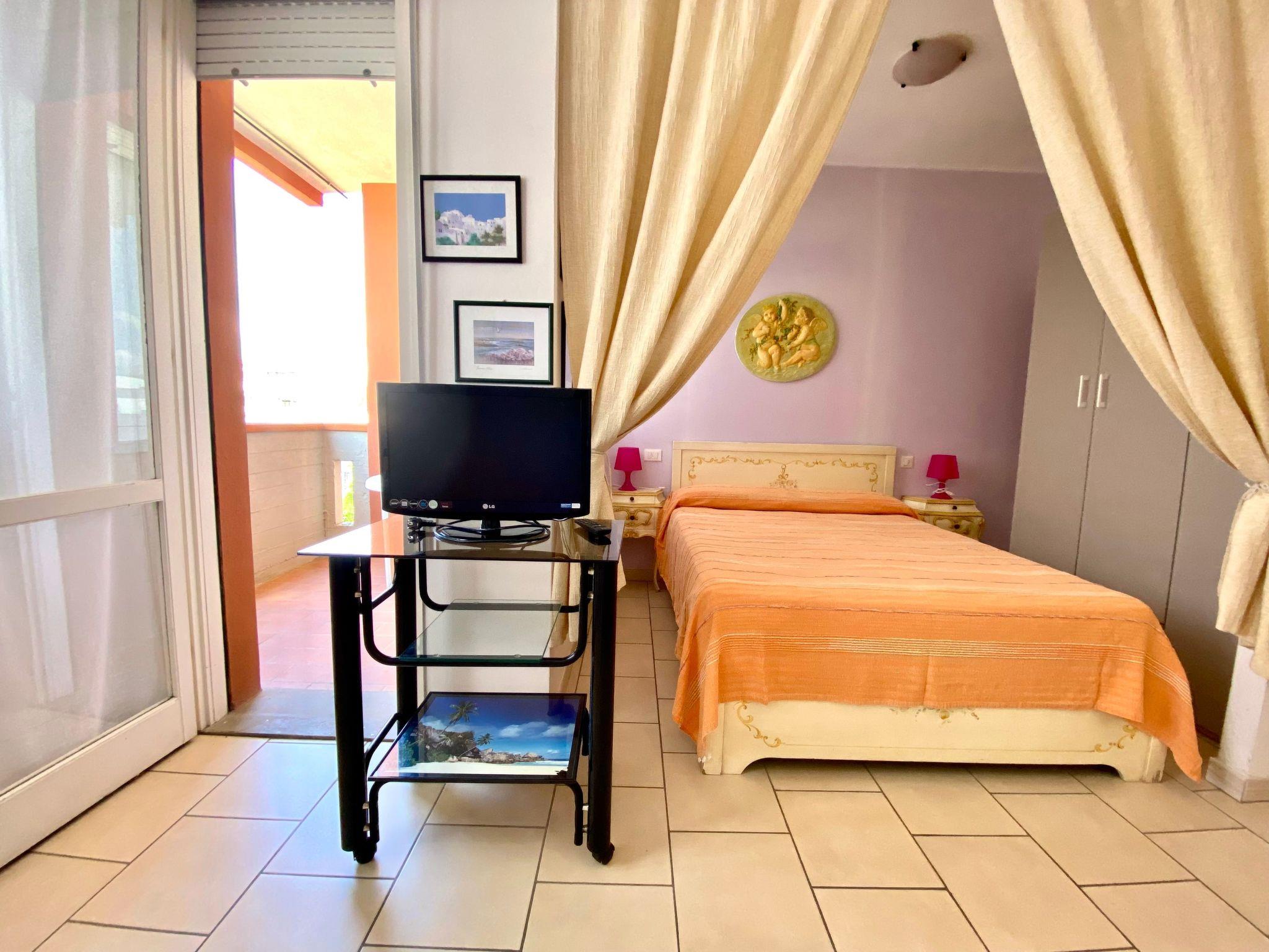 The studio is on the second floor and consists of a single room with a double bed, a bunk bed, kitchenette (cooker, fridge, freezer and washing machine) and bathroom with shower, toilet and bidet. Outside there is a small balcony with dining area.